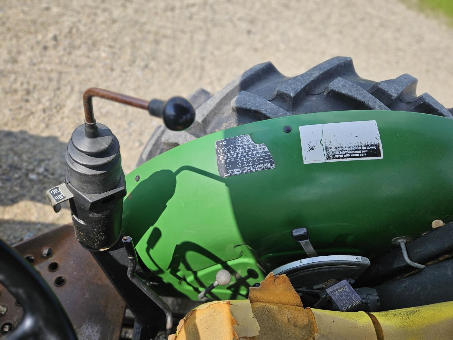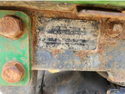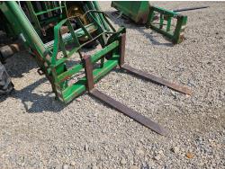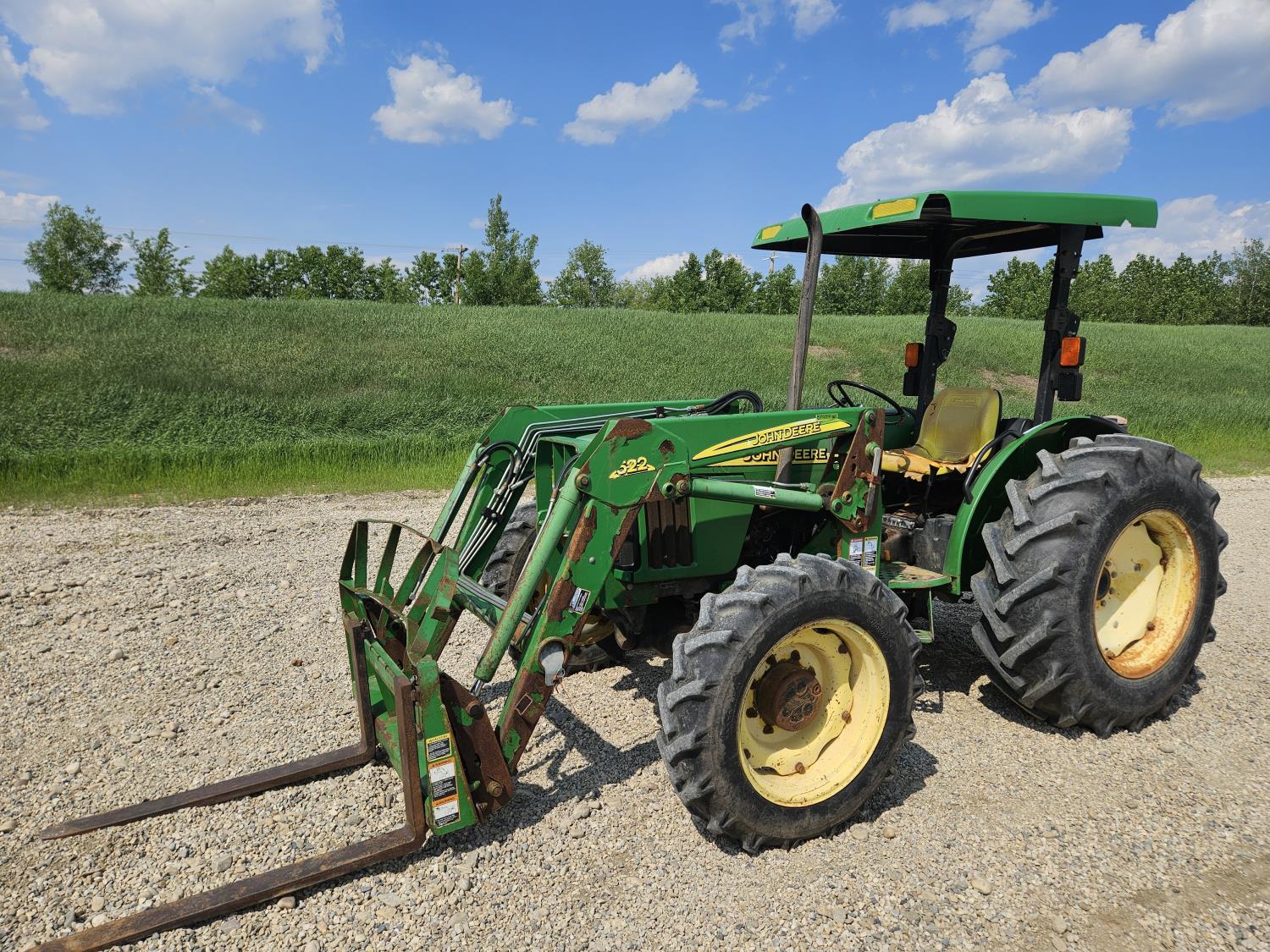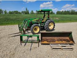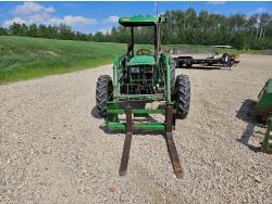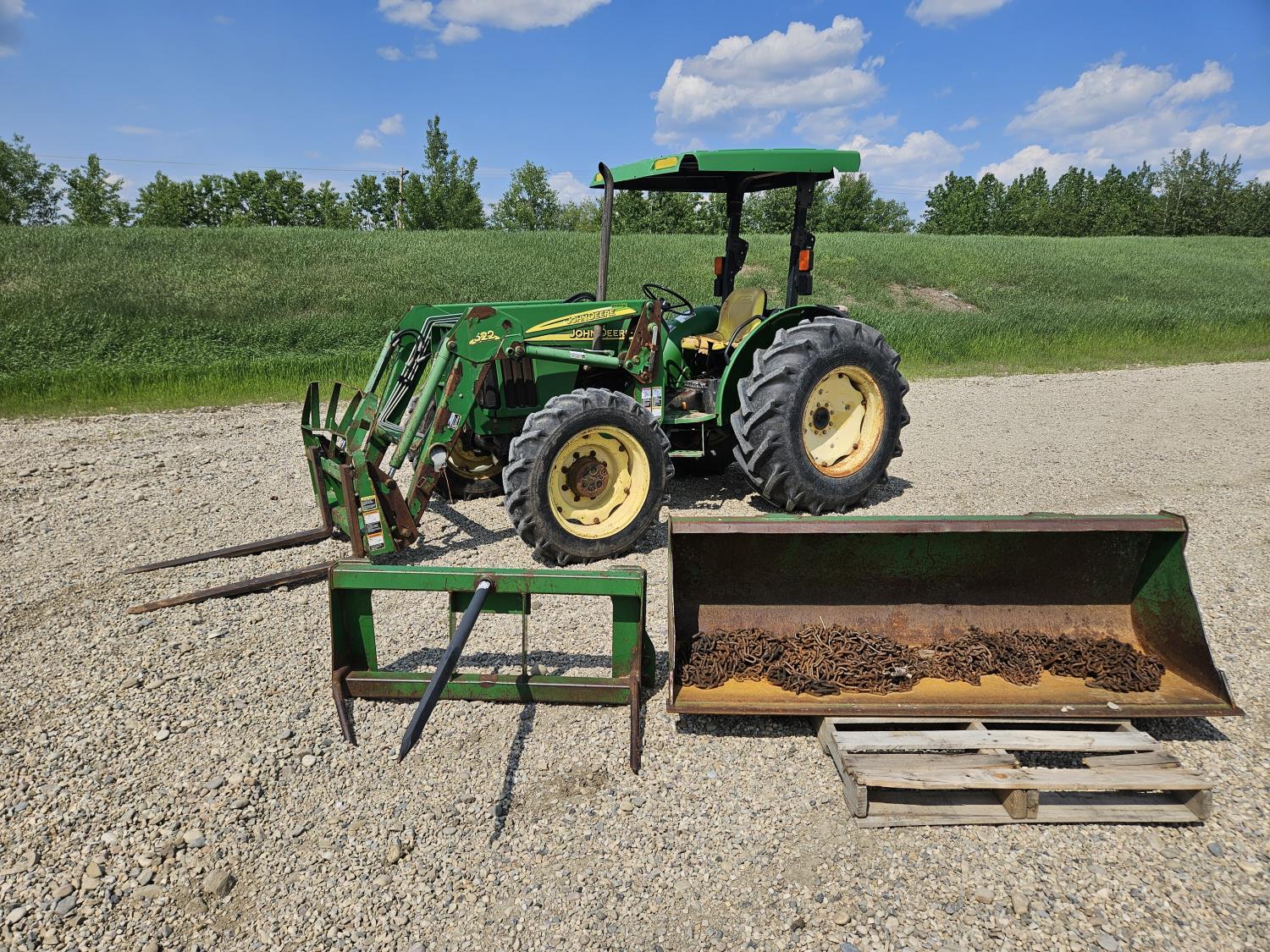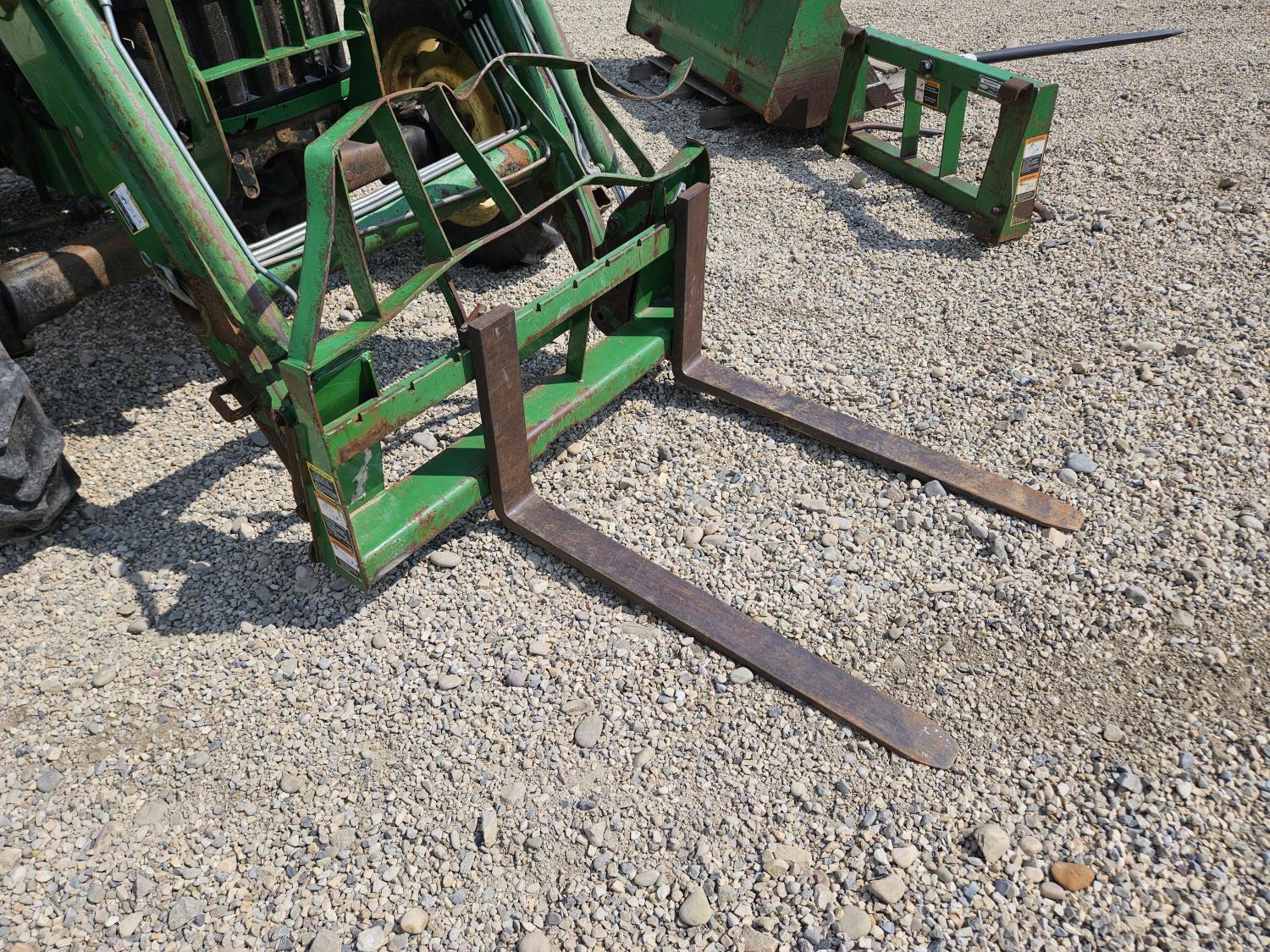 John Deere 522 loader, Q/A, 72 inch bucket, bale forks, 42 inch pallet forks, grill guard, 2.9 L 3 cylinder 53 HP, diesel engine, 8 speed partial synchro transmission, open station platform, joystick, 540 PTO, 3 point hitch, 2 rear hydraulic outlets, 9.5-24 front tires, 16.9-28 rear tires, (4) tire chains