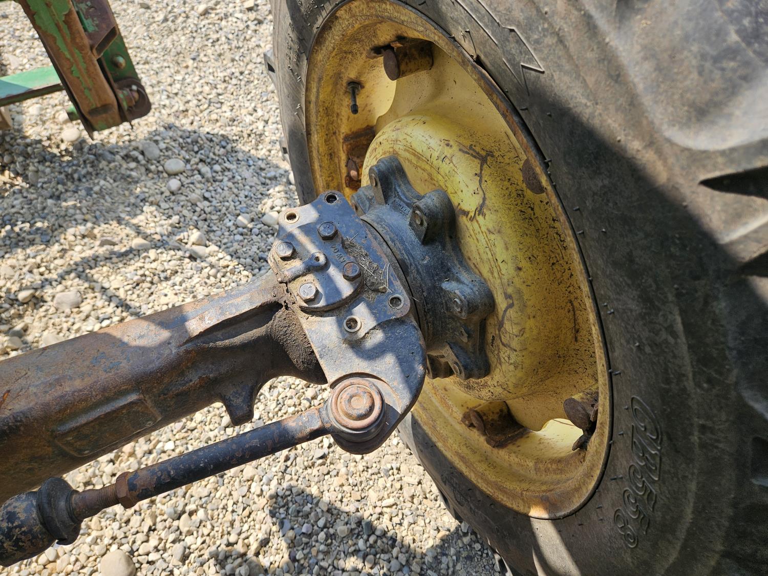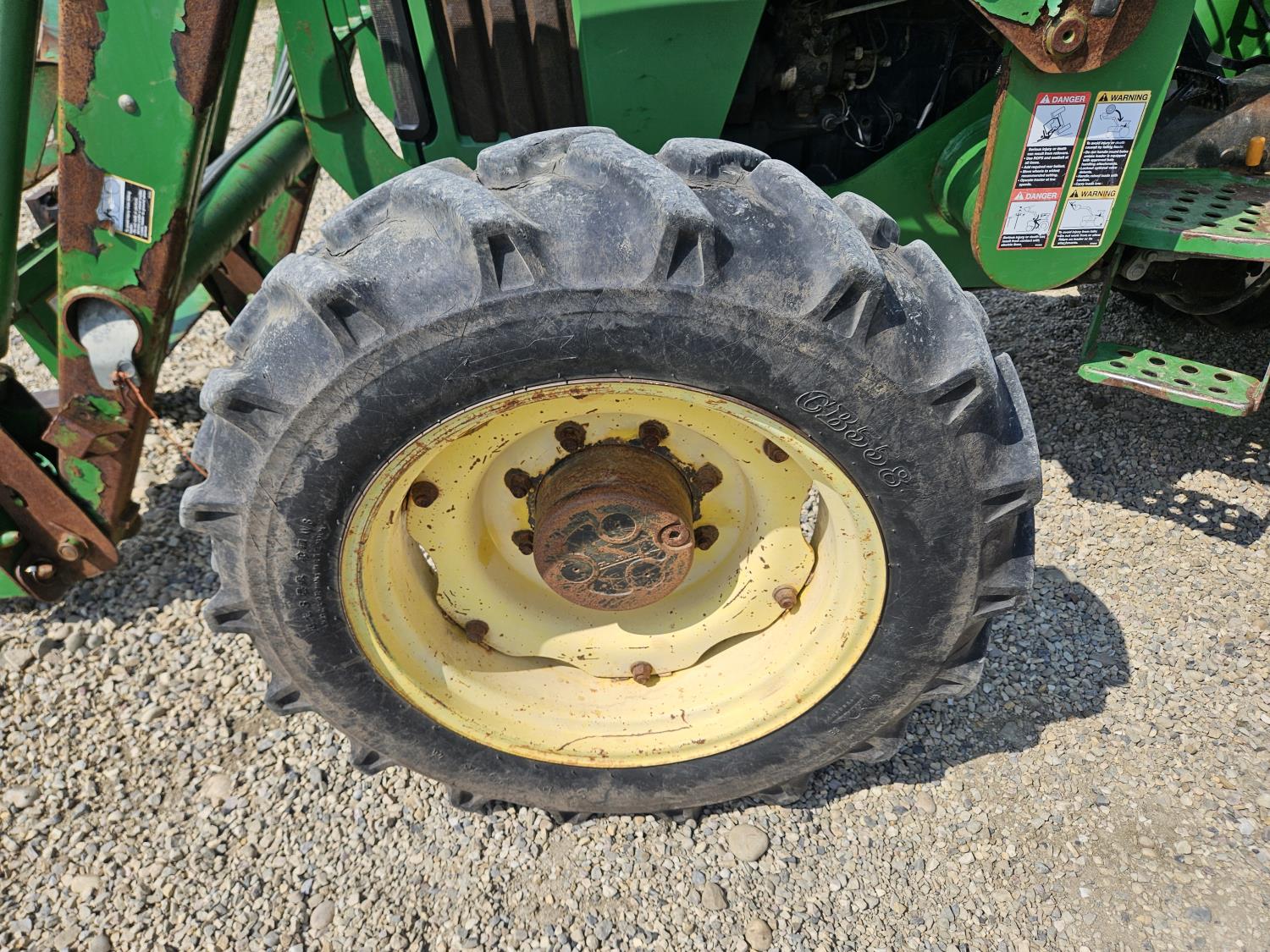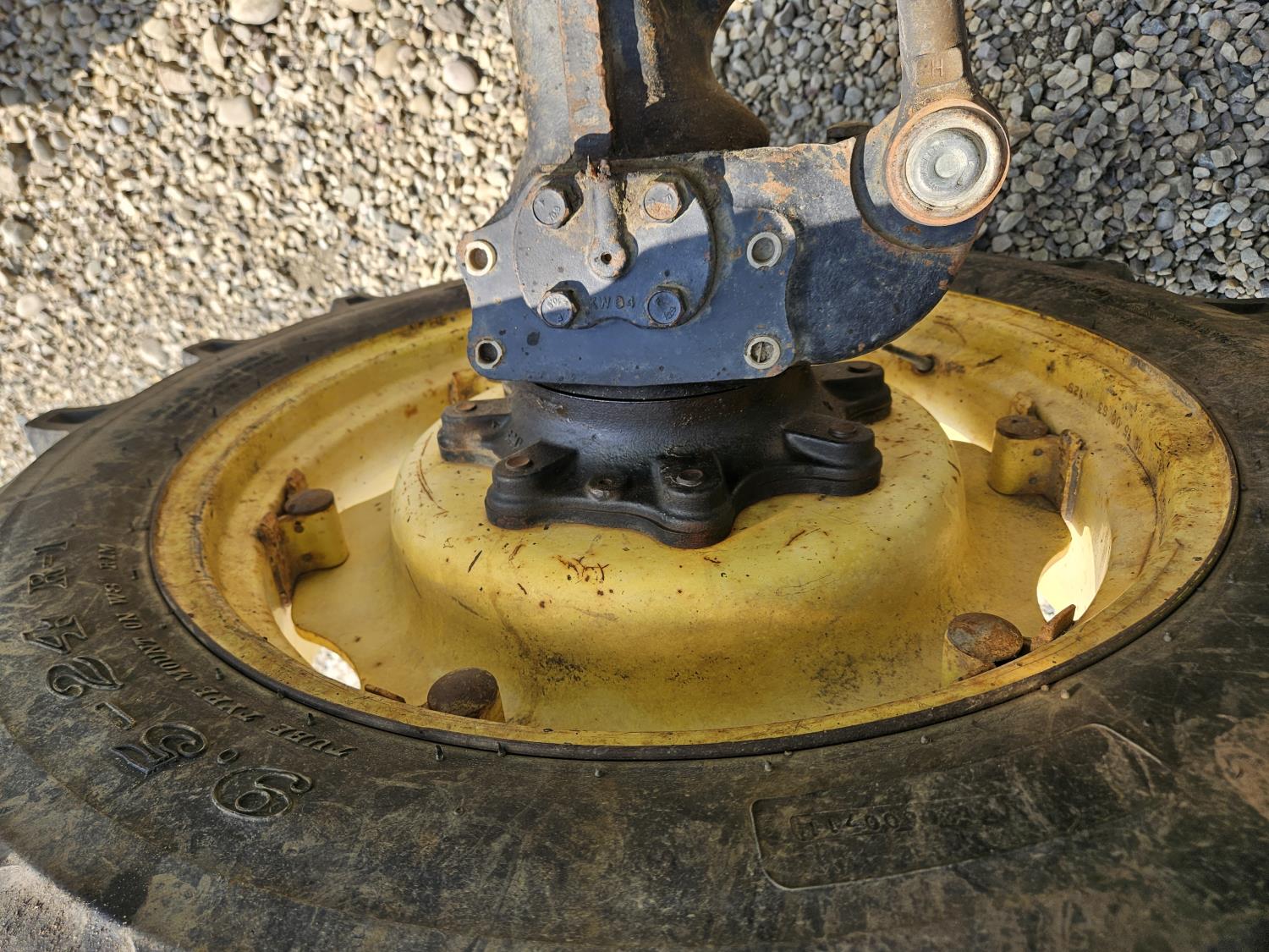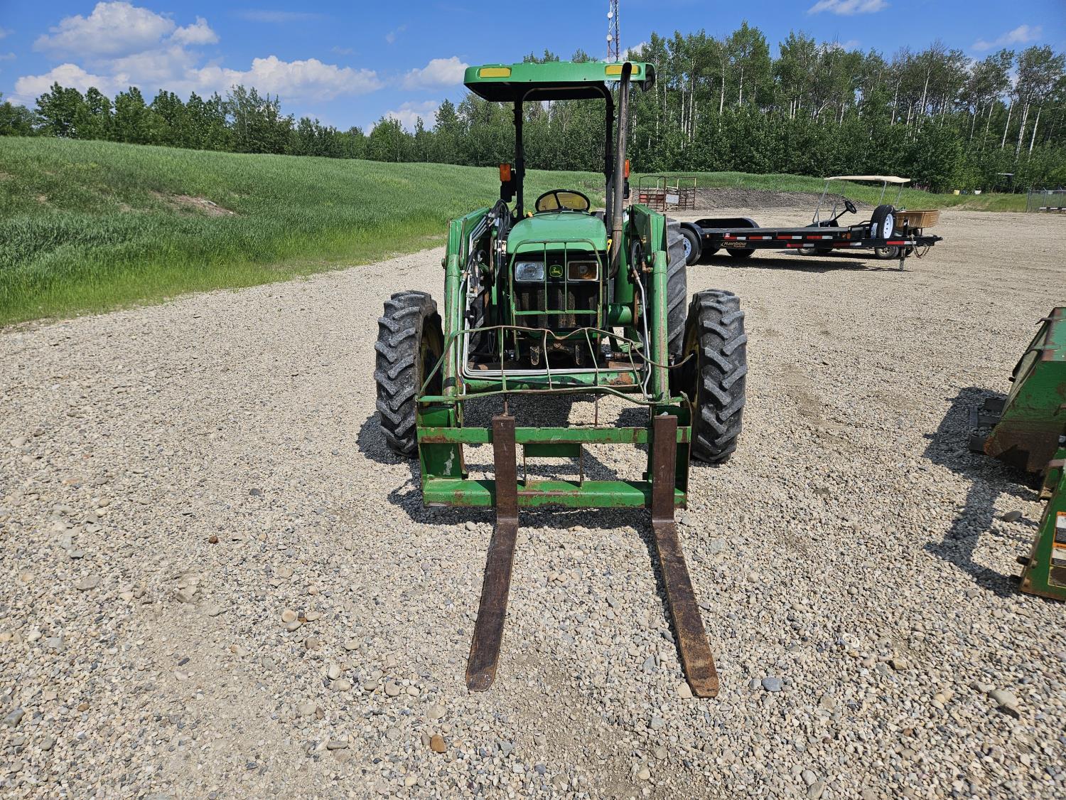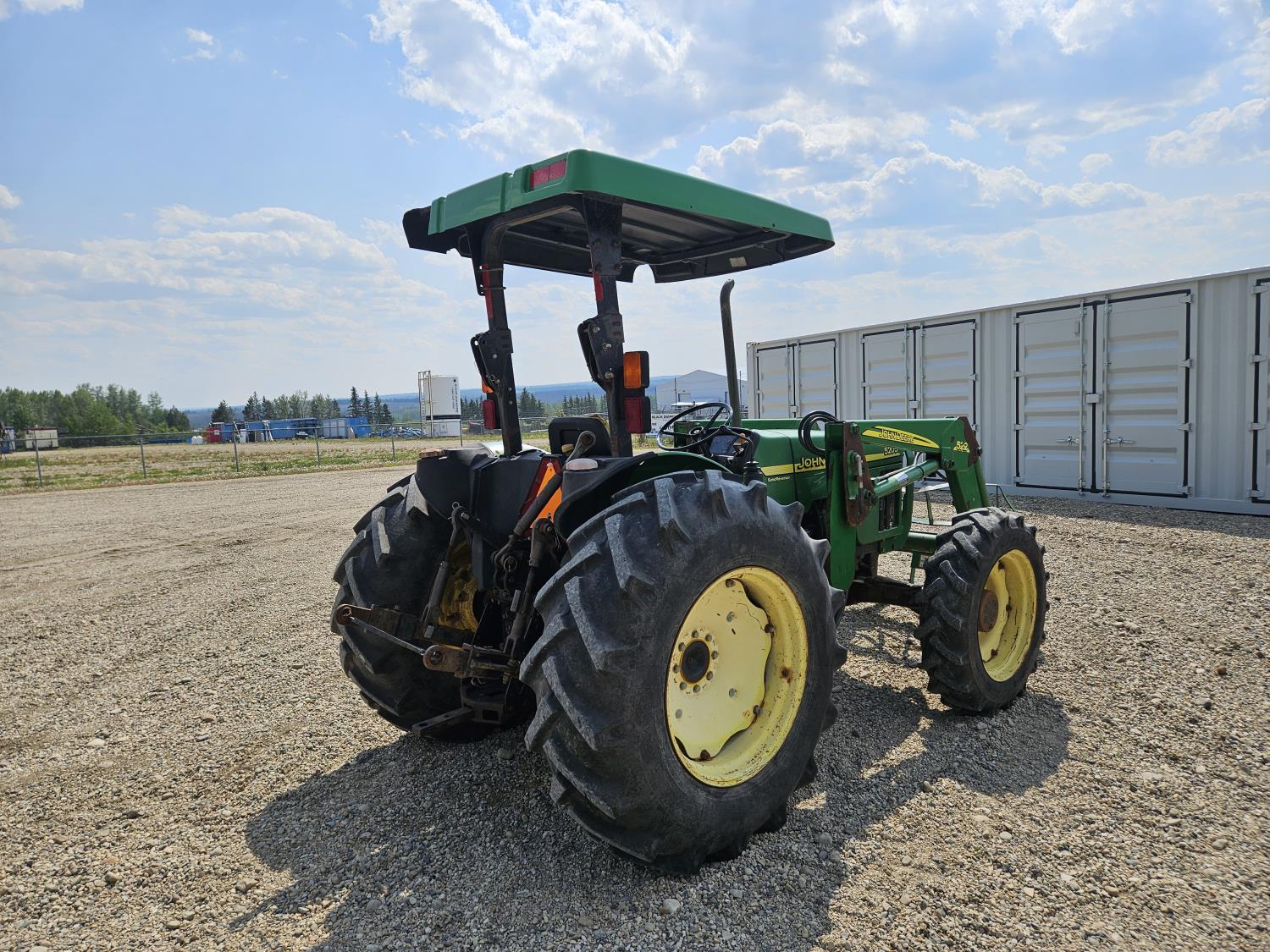 John Deere 522 loader, Q/A, 72 inch bucket, bale forks, 42 inch pallet forks, grill guard, 2.9 L 3 cylinder 53 HP, diesel engine, 8 speed partial synchro transmission, open station platform, joystick, 540 PTO, 3 point hitch, 2 rear hydraulic outlets, 9.5-24 front tires, 16.9-28 rear tires, (4) tire chains