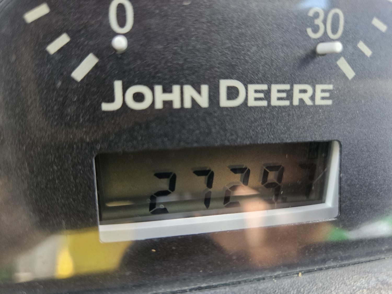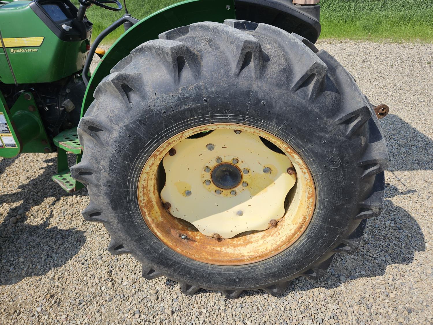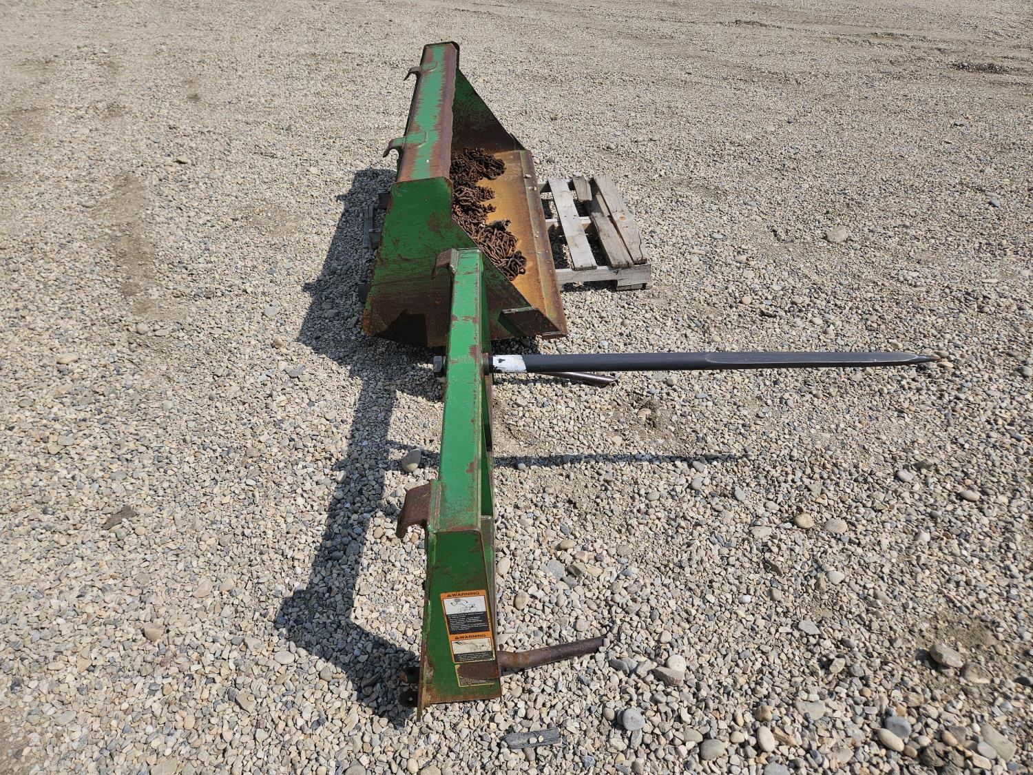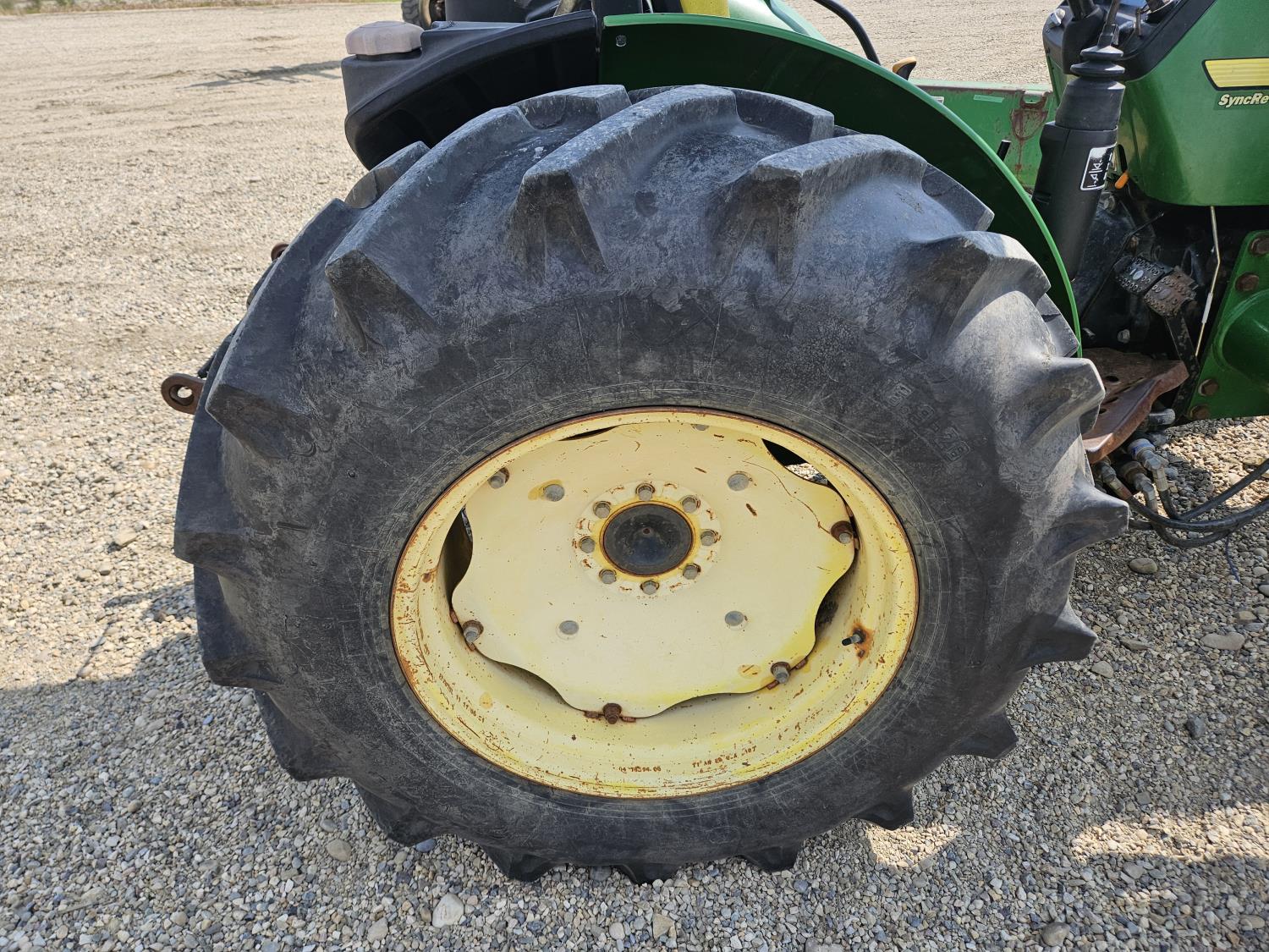 John Deere 522 loader, Q/A, 72 inch bucket, bale forks, 42 inch pallet forks, grill guard, 2.9 L 3 cylinder 53 HP, diesel engine, 8 speed partial synchro transmission, open station platform, joystick, 540 PTO, 3 point hitch, 2 rear hydraulic outlets, 9.5-24 front tires, 16.9-28 rear tires, (4) tire chains
