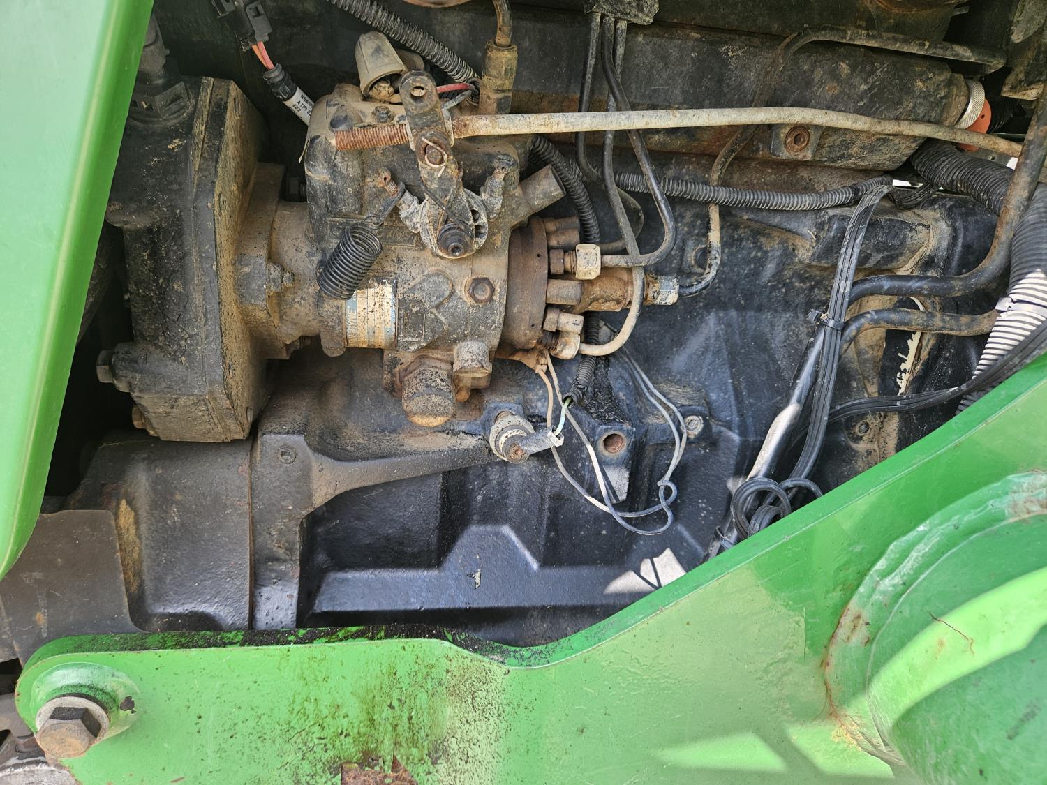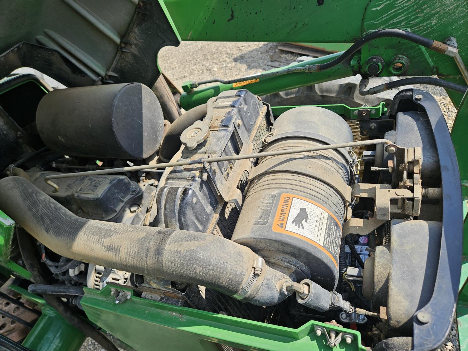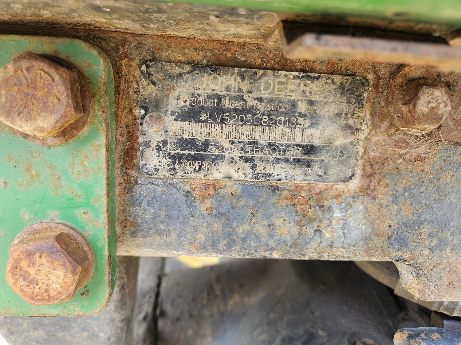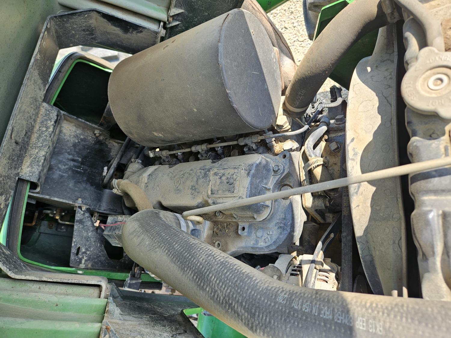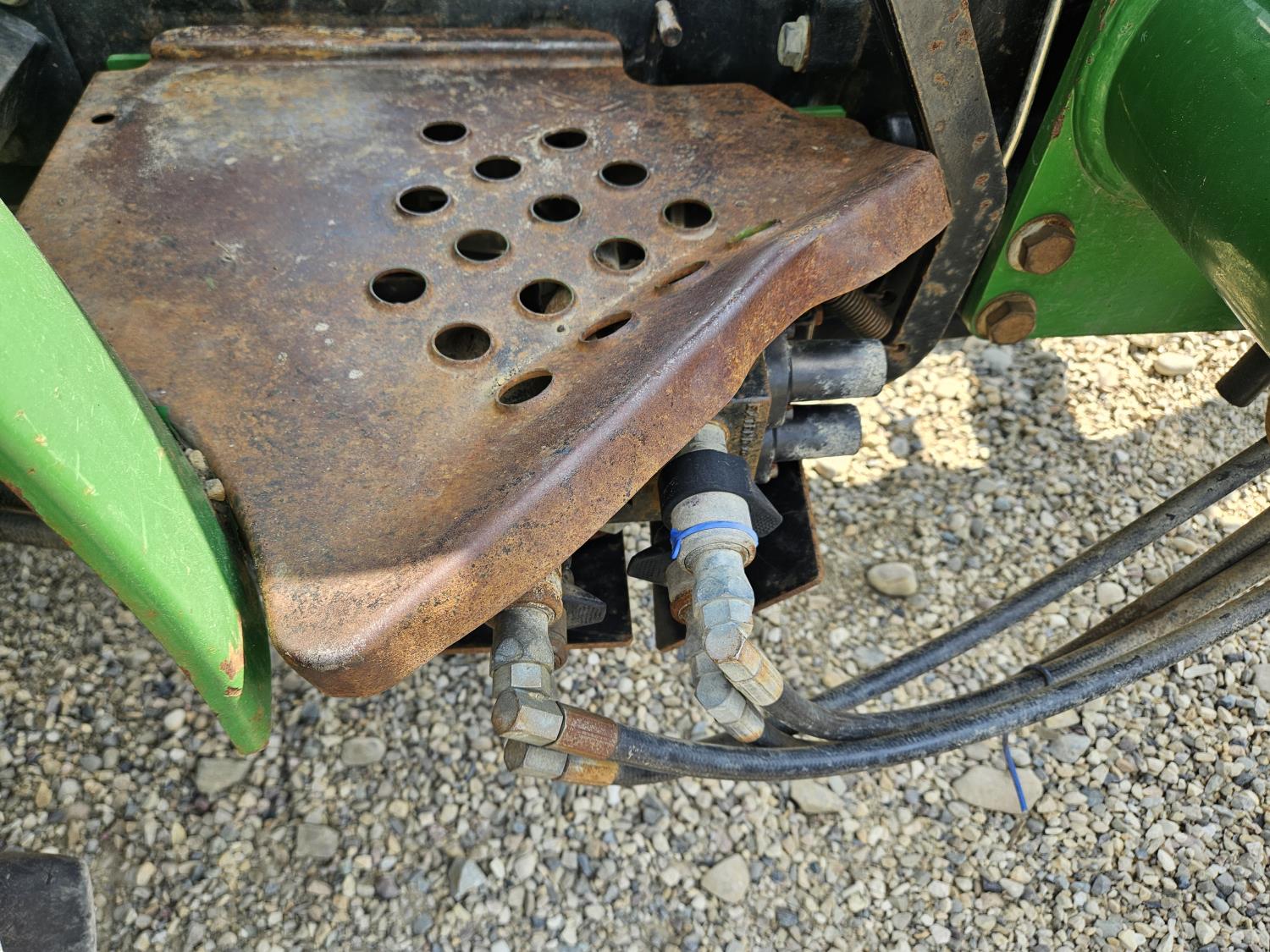 John Deere 522 loader, Q/A, 72 inch bucket, bale forks, 42 inch pallet forks, grill guard, 2.9 L 3 cylinder 53 HP, diesel engine, 8 speed partial synchro transmission, open station platform, joystick, 540 PTO, 3 point hitch, 2 rear hydraulic outlets, 9.5-24 front tires, 16.9-28 rear tires, (4) tire chains