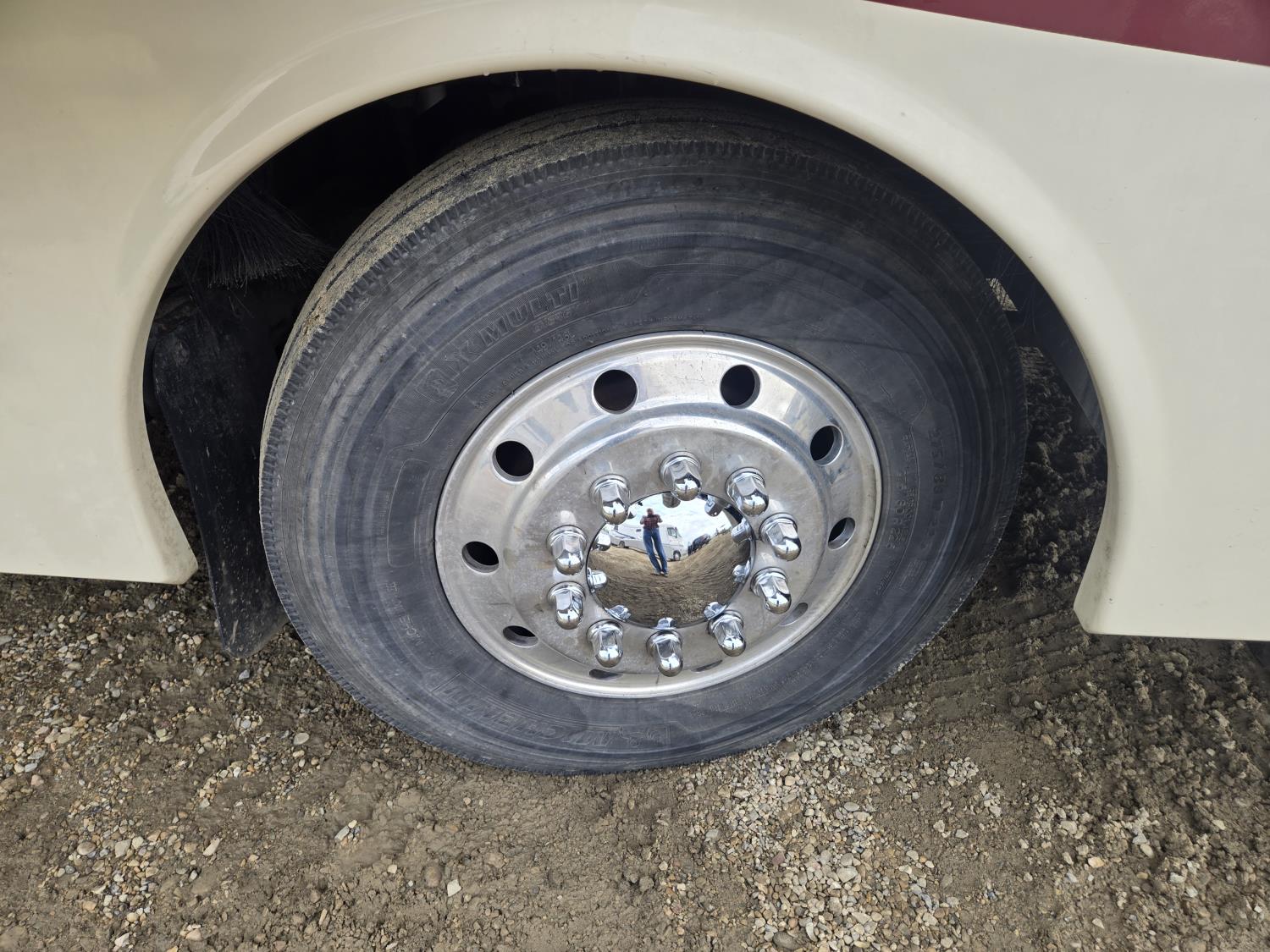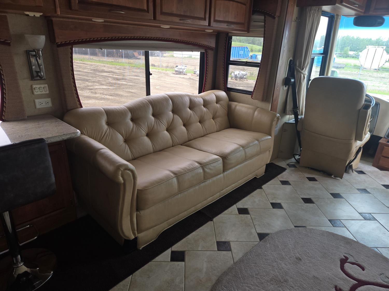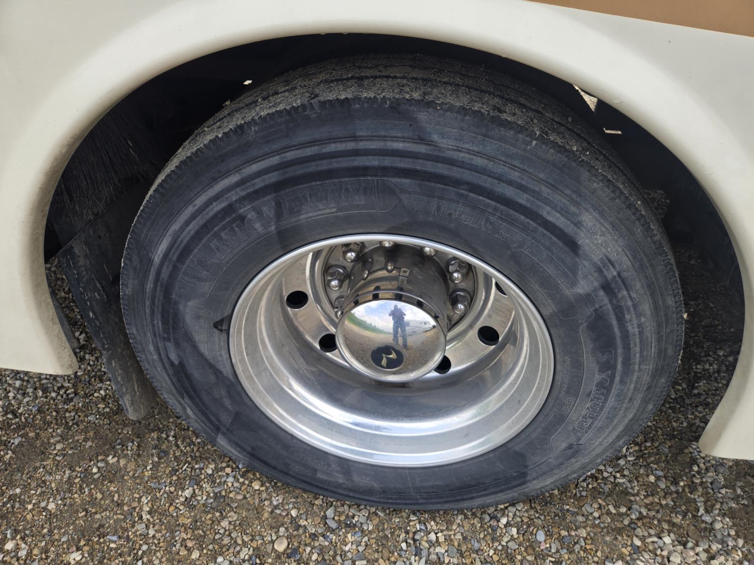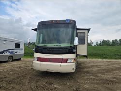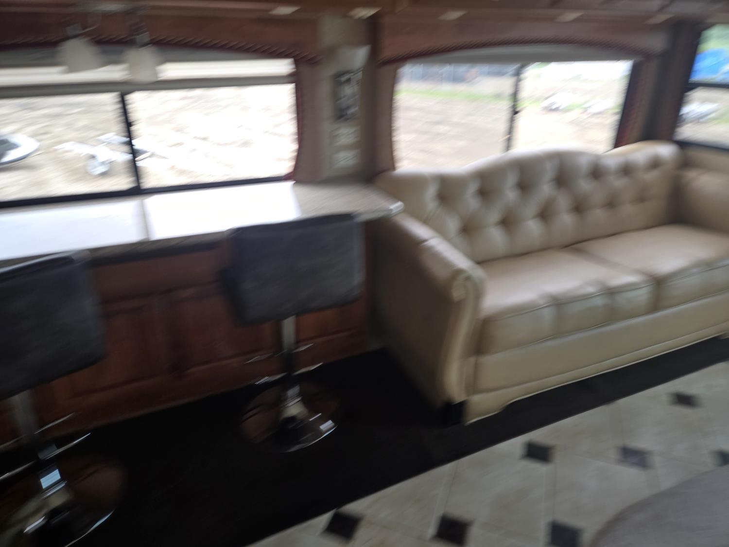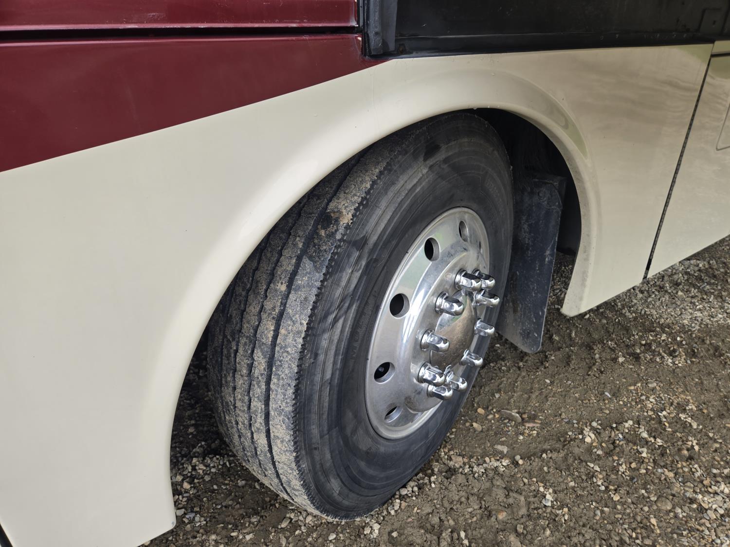 Cummins 400 HP engine, Allison transmission, (4) slides, (1) main awning, (4) smaller awning over windows and door, Onan 8000 watt quiet diesel generator with 2377 hrs, fridge with freezer, stove top, microwave, full washroom, rear bedroom with queen bad, vacuum, (2) AC units, (2) TV's, aluminum wheels, 11R22.5 tires