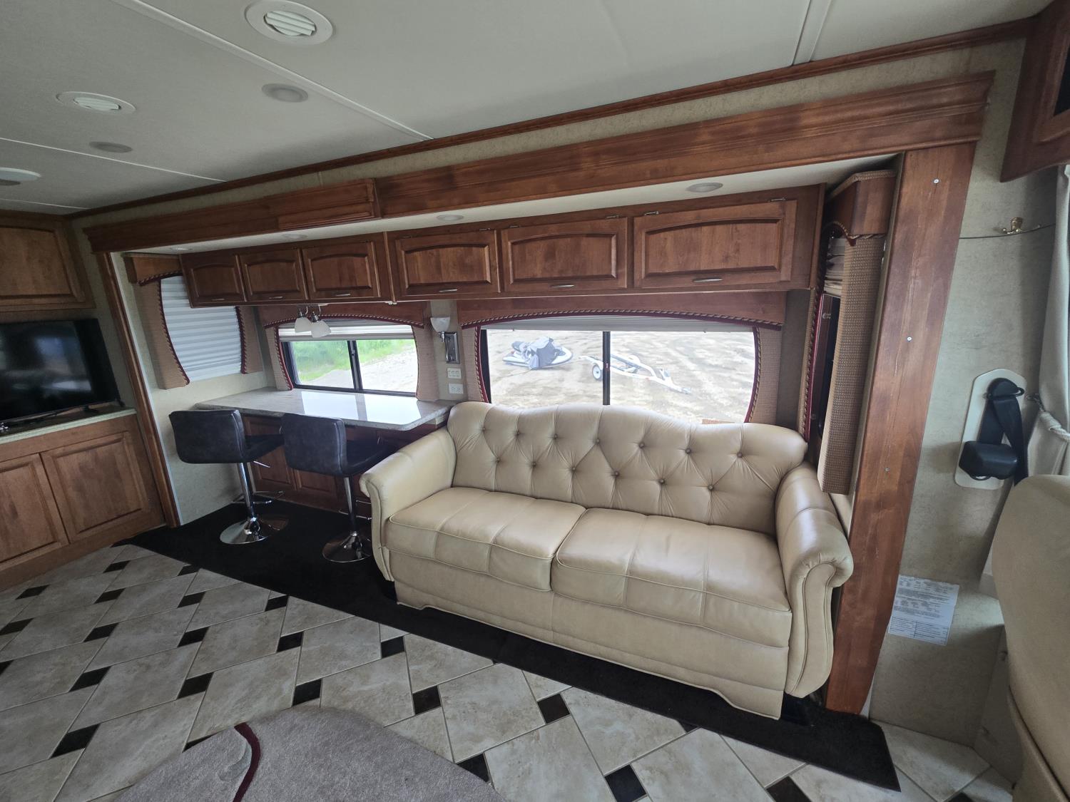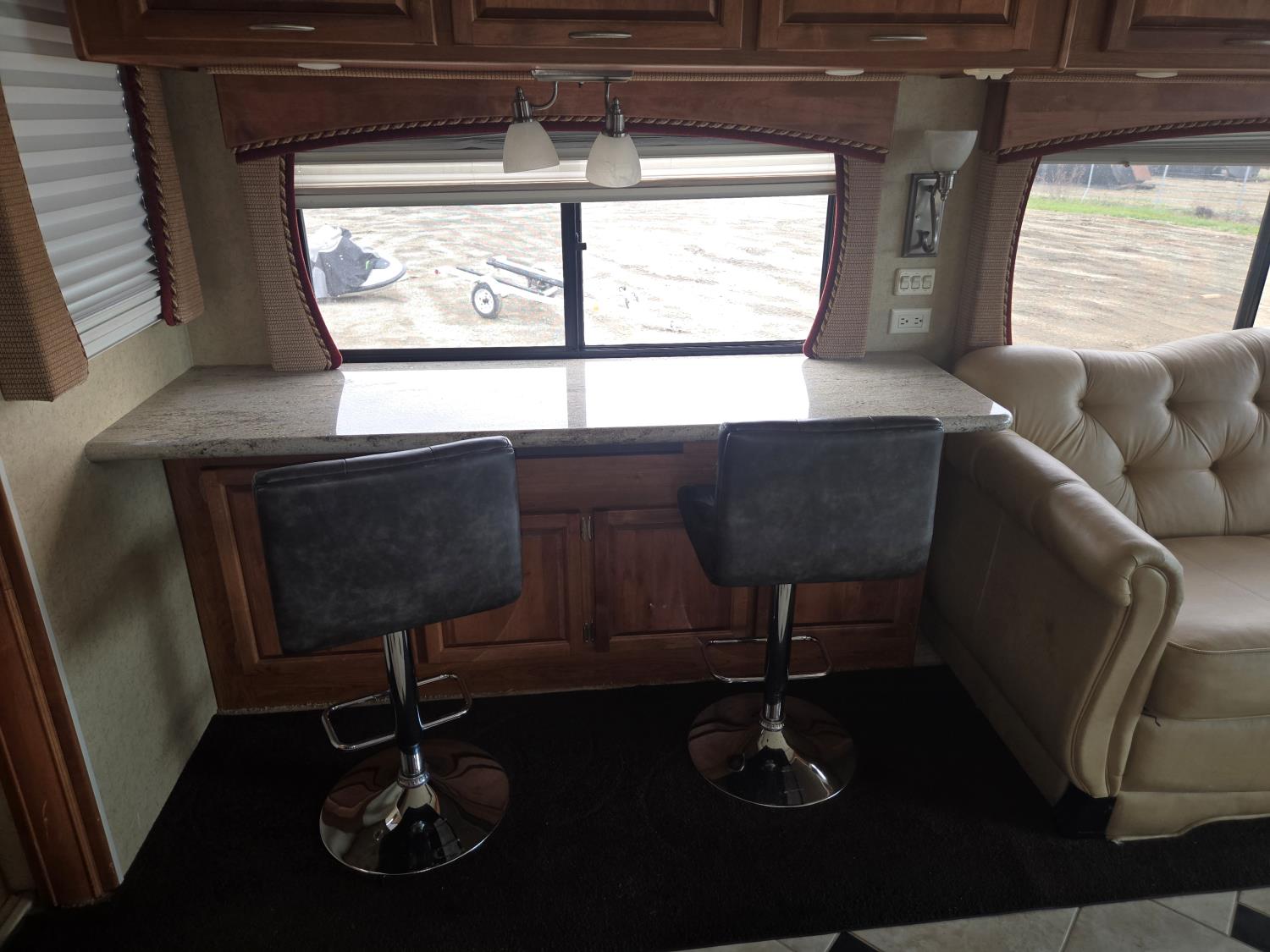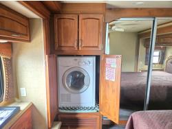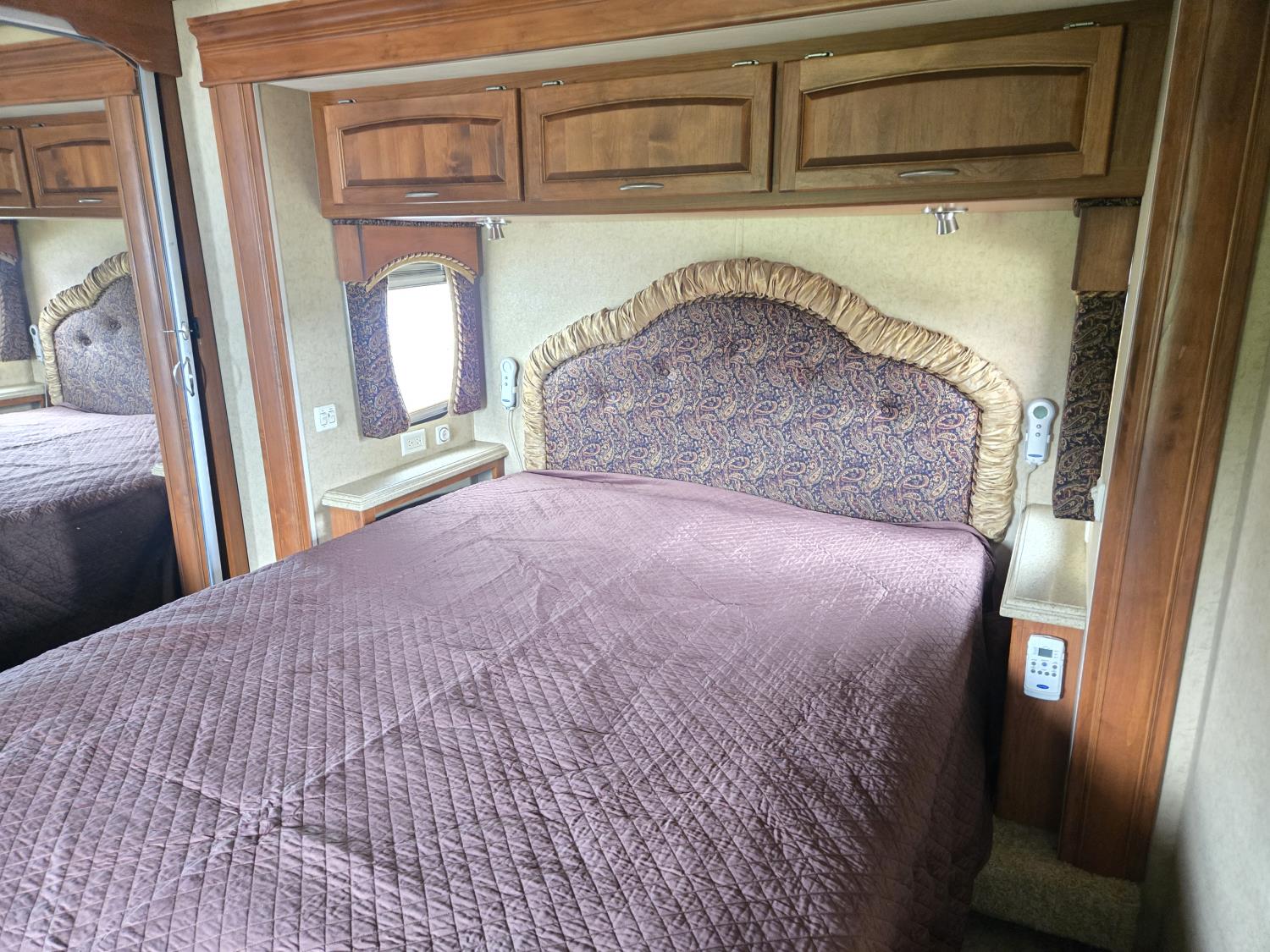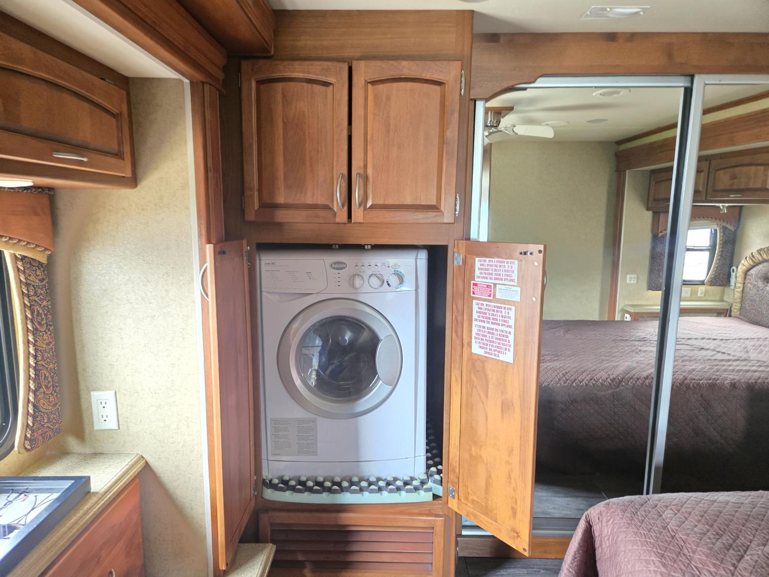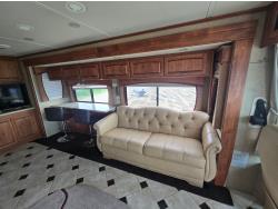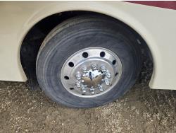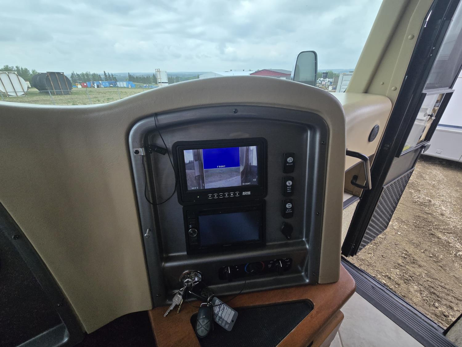 Cummins 400 HP engine, Allison transmission, (4) slides, (1) main awning, (4) smaller awning over windows and door, Onan 8000 watt quiet diesel generator with 2377 hrs, fridge with freezer, stove top, microwave, full washroom, rear bedroom with queen bad, vacuum, (2) AC units, (2) TV's, aluminum wheels, 11R22.5 tires