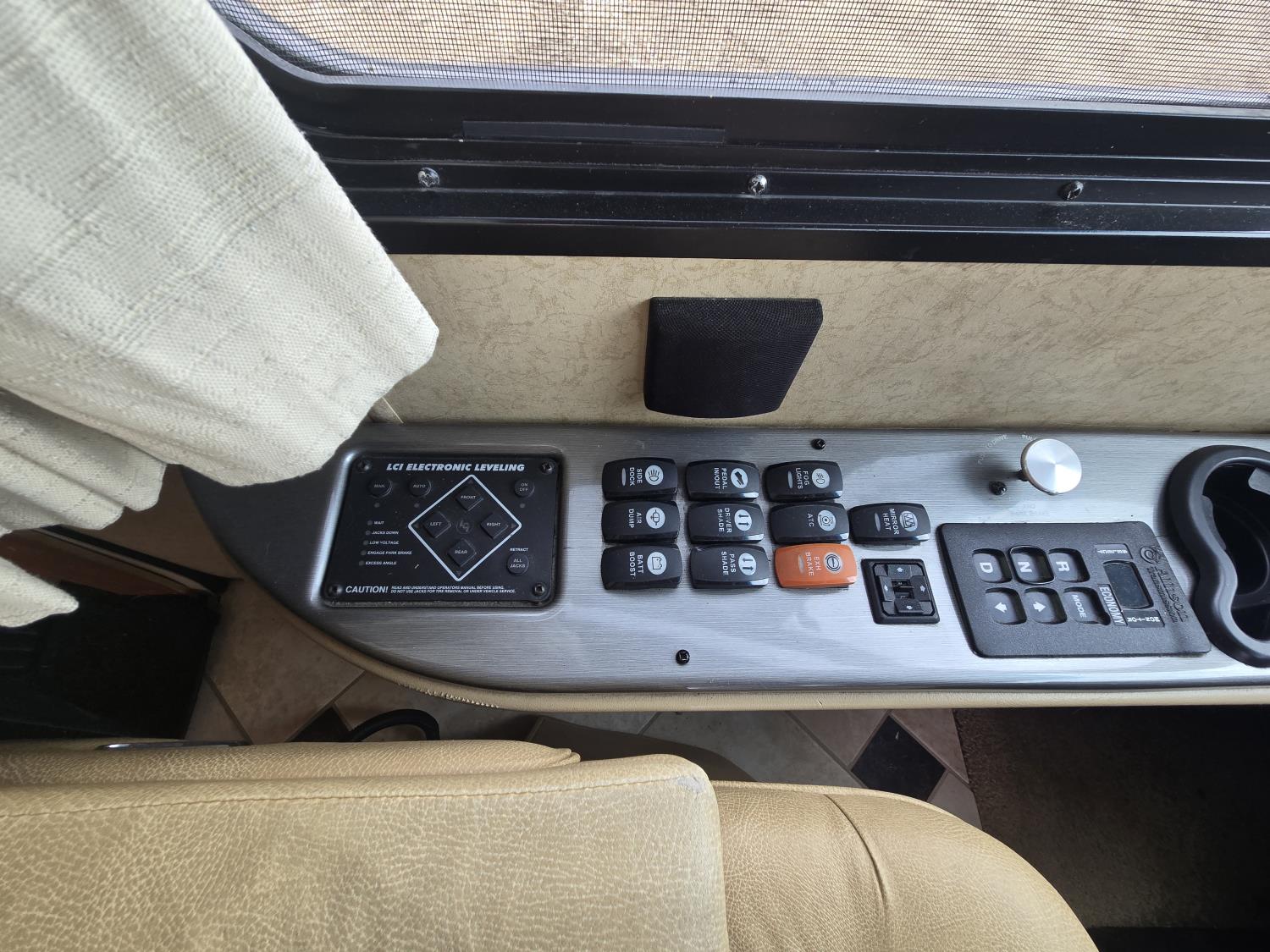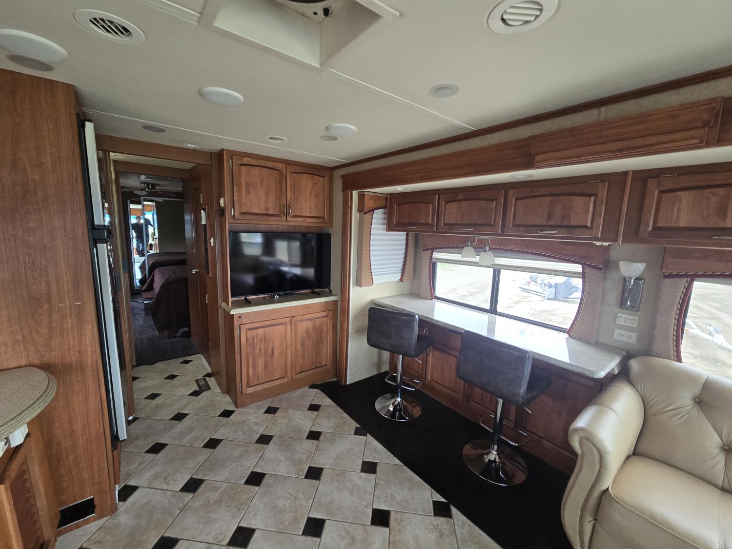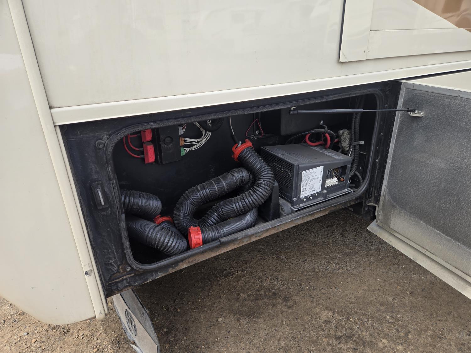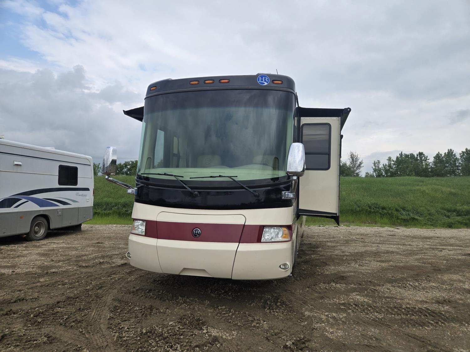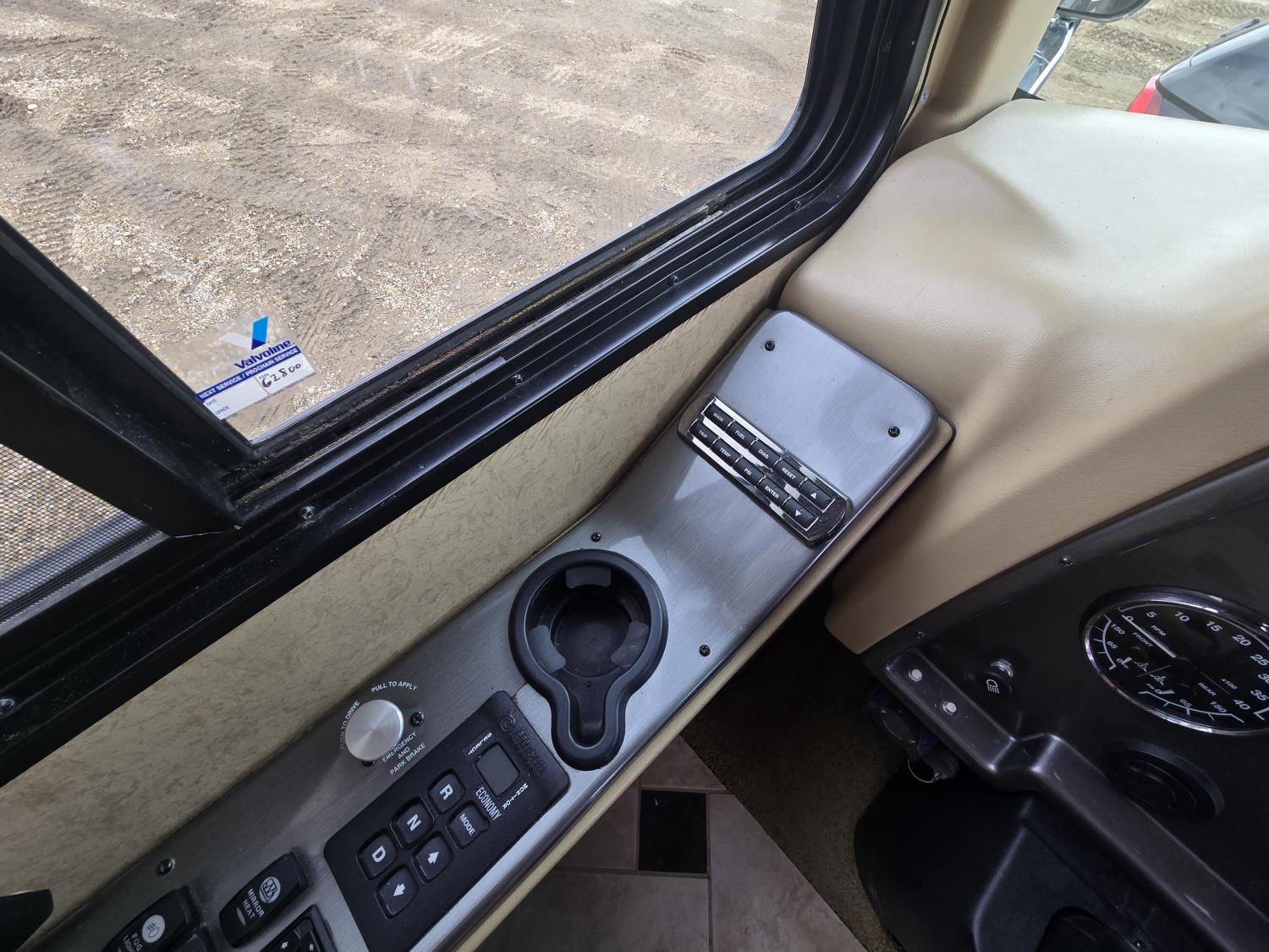 Cummins 400 HP engine, Allison transmission, (4) slides, (1) main awning, (4) smaller awning over windows and door, Onan 8000 watt quiet diesel generator with 2377 hrs, fridge with freezer, stove top, microwave, full washroom, rear bedroom with queen bad, vacuum, (2) AC units, (2) TV's, aluminum wheels, 11R22.5 tires