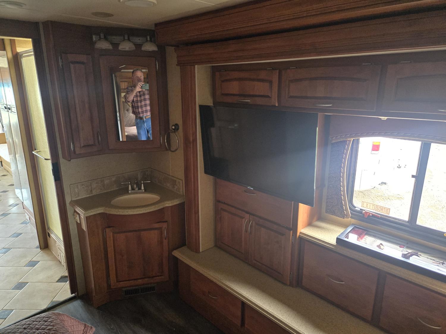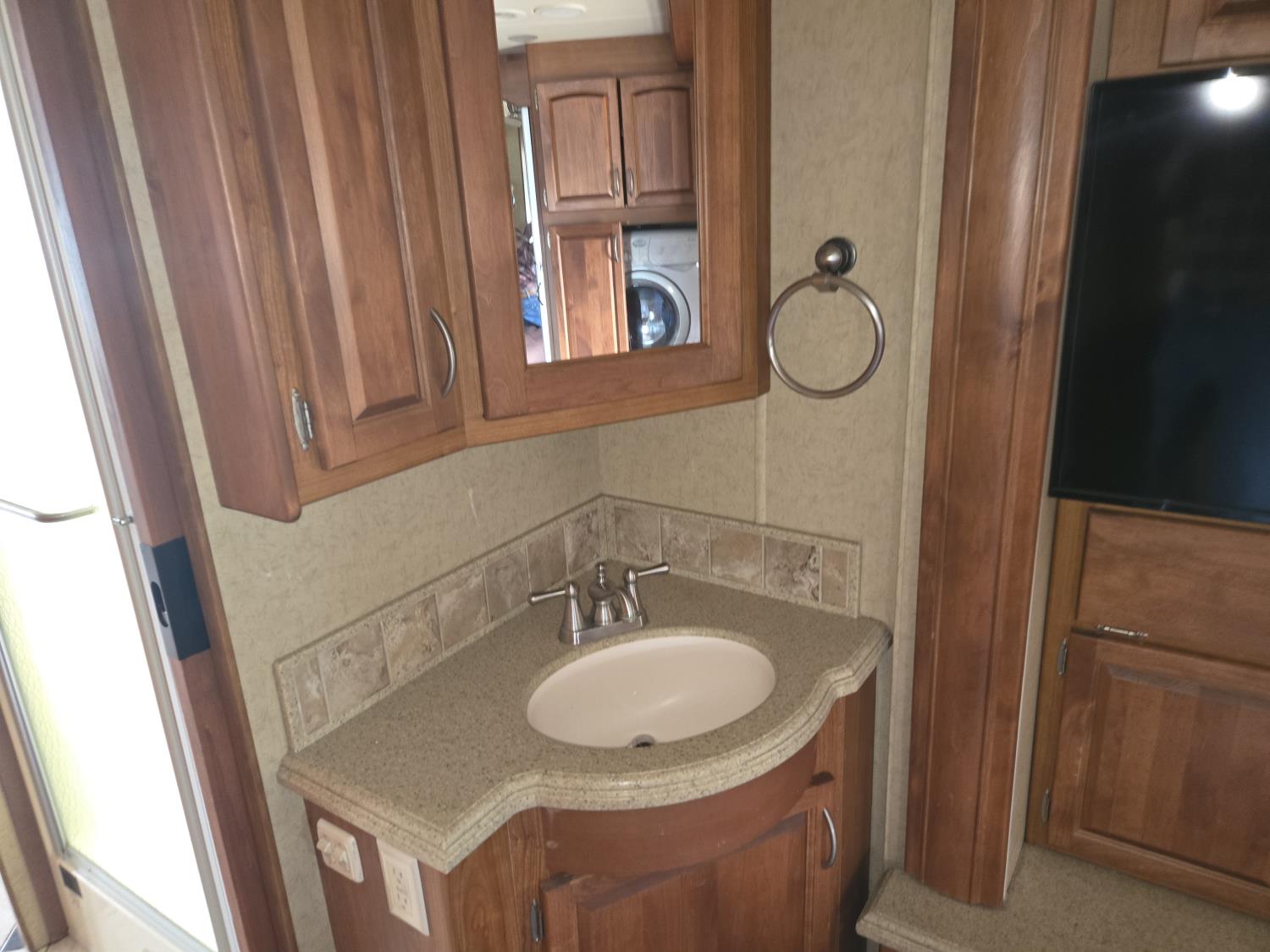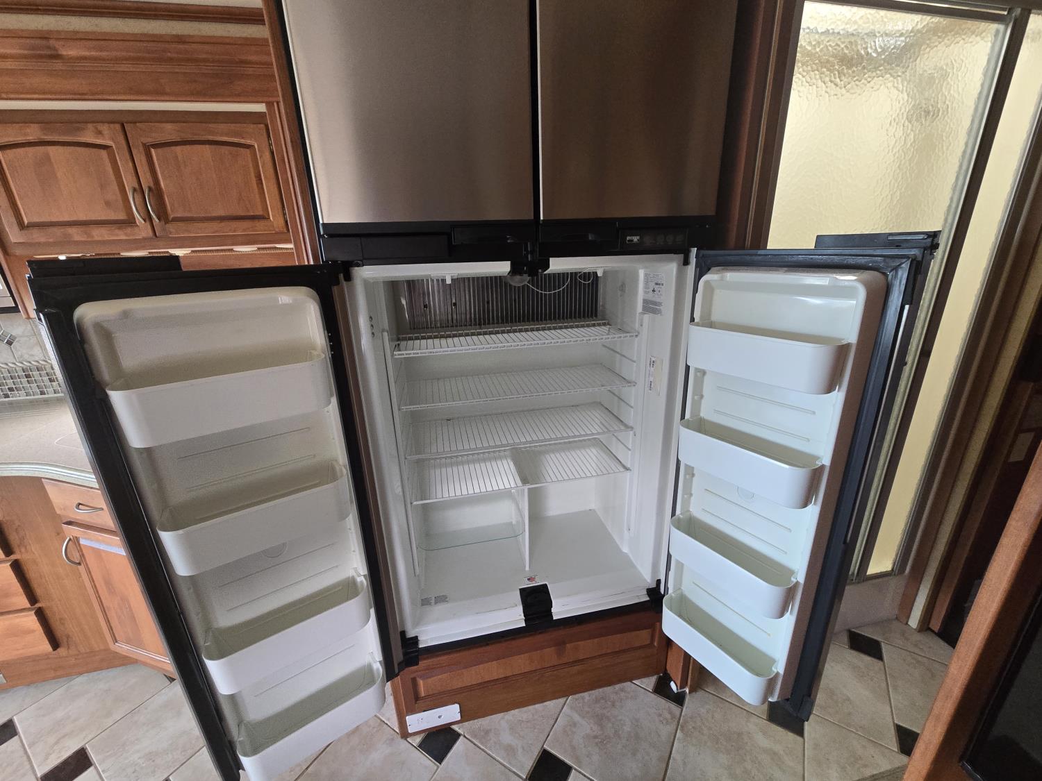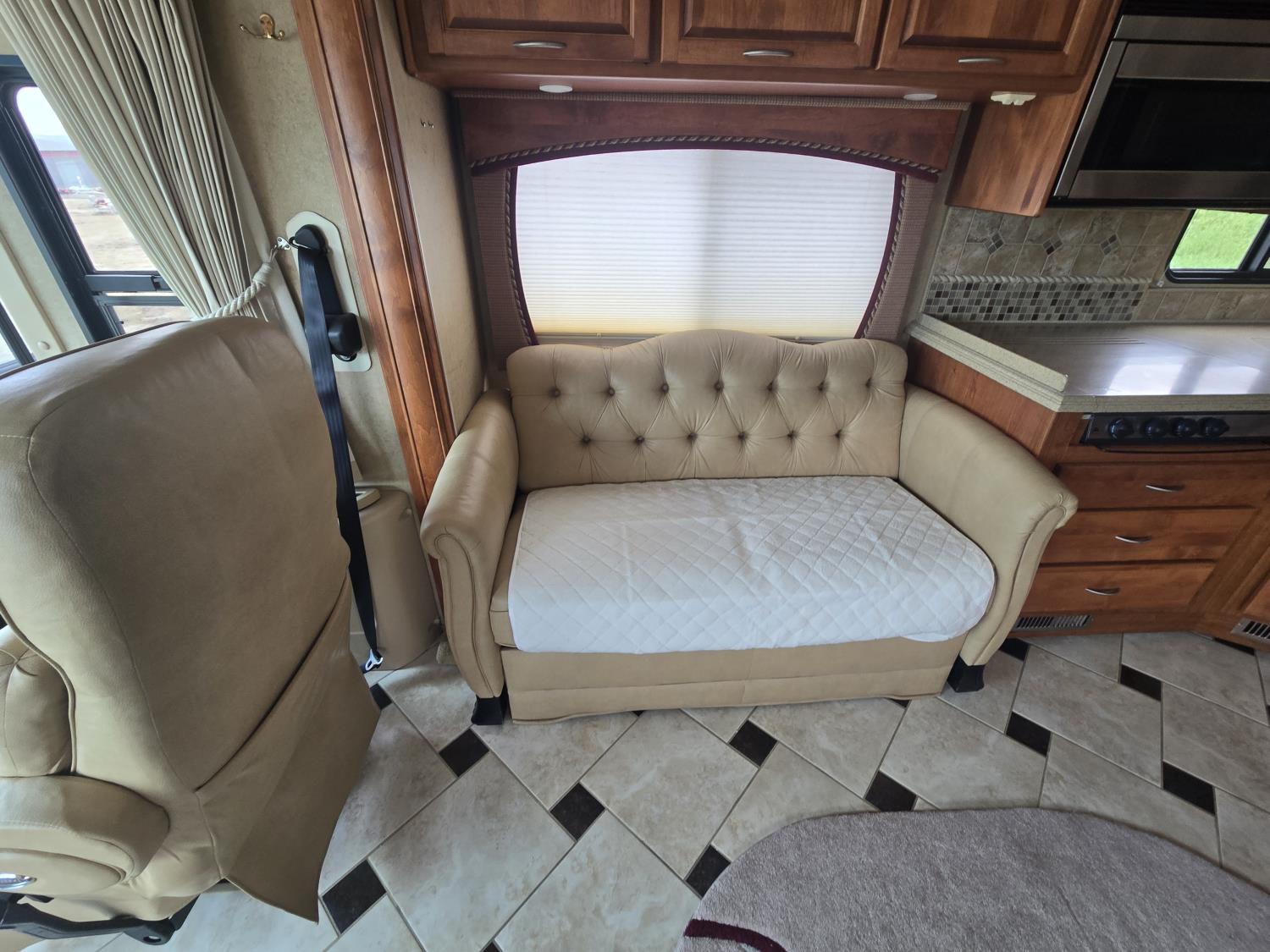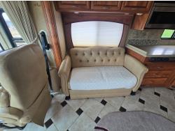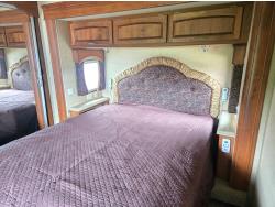 Cummins 400 HP engine, Allison transmission, (4) slides, (1) main awning, (4) smaller awning over windows and door, Onan 8000 watt quiet diesel generator with 2377 hrs, fridge with freezer, stove top, microwave, full washroom, rear bedroom with queen bad, vacuum, (2) AC units, (2) TV's, aluminum wheels, 11R22.5 tires