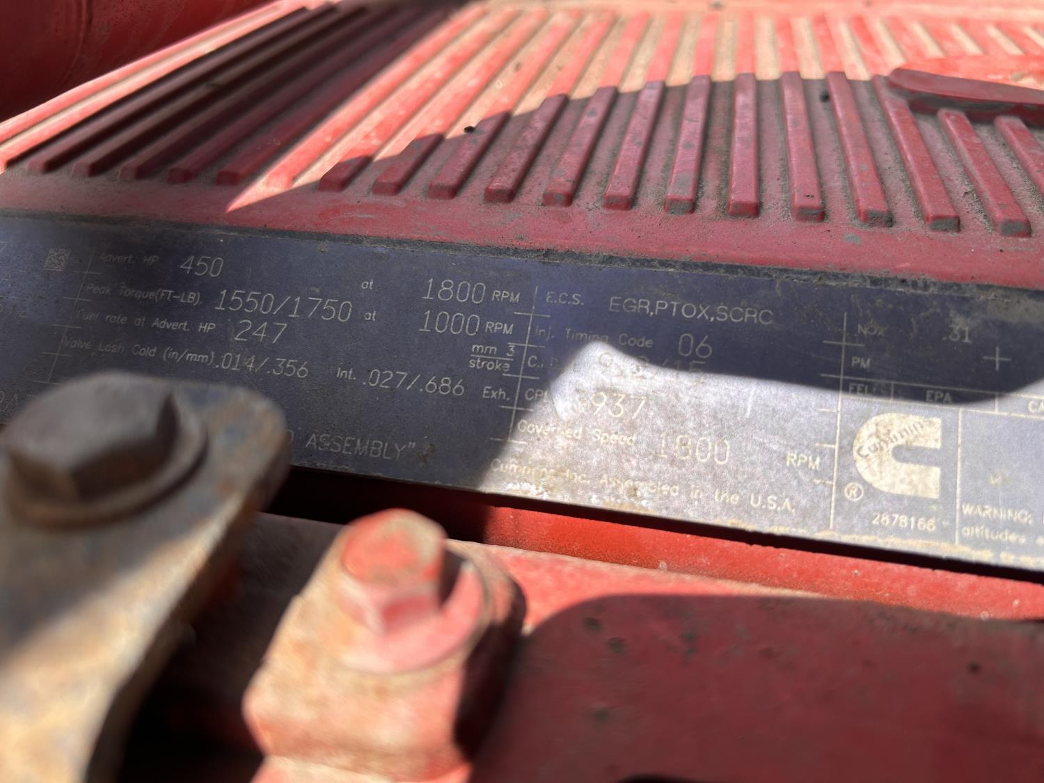 Cummins ISX15 15 L 6 cylinder 450 HP engine, DEF required, automatic transmission, integral sleeper, A/C, cruise control, air ride driver seat, CB radio, stereo, air ride cab, air ride suspension, 13,000 lb front axle, 40,000 lb rear axles, diff lock, all aluminum wheels, 11R22.5 tires