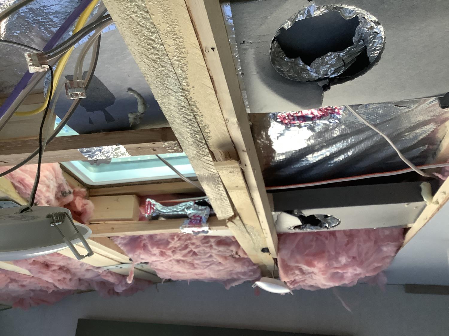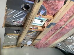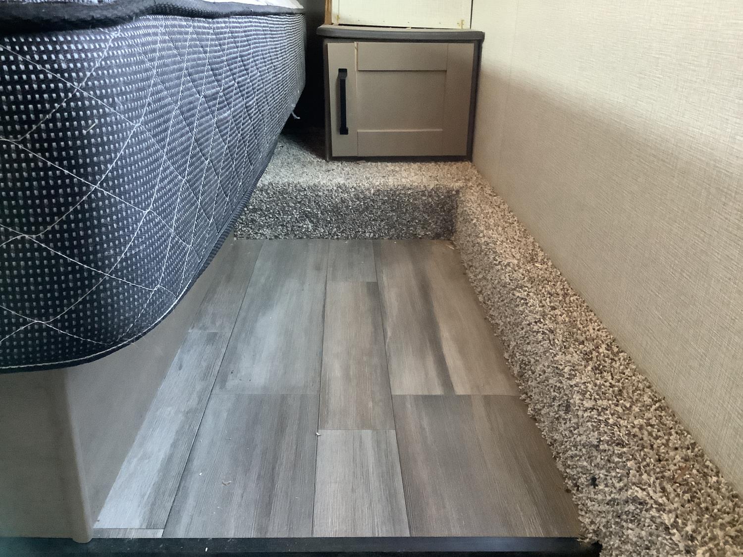 Here is the story on the front roof damage. Customer bought the trailer brand new. Took it to a RV camp ground that was very well treed set it up and left it to return on the weekend. A storm came and a tree broke and fell on the roof at the front of the trailer. There are a few fine cracks that you can see are taped up, the ceiling was removed as you can see some of the wood rafters are broken. This is a perfect trailer for the handy man to fix up. It was never used. A new one we priced is around $90,000 today.