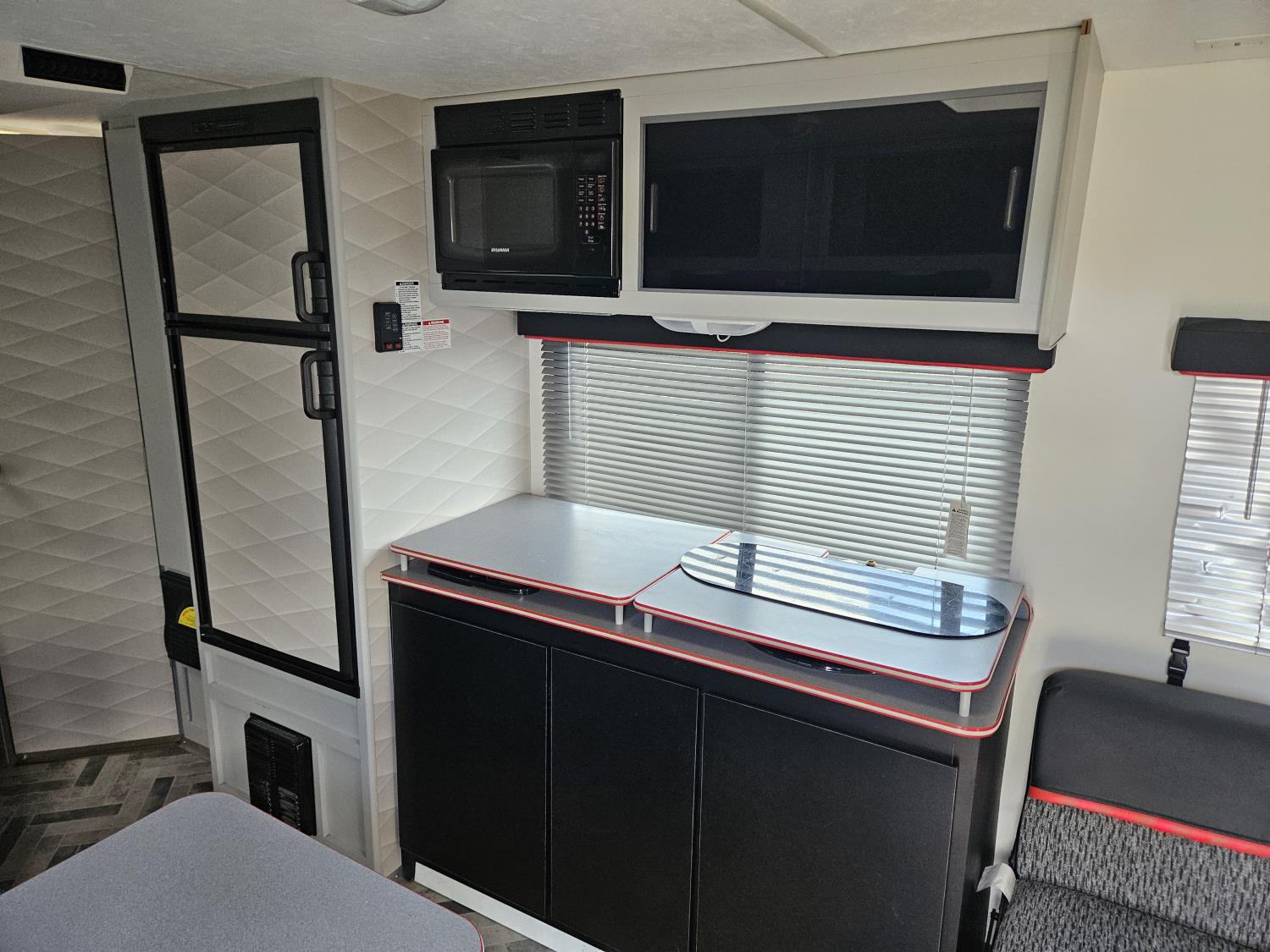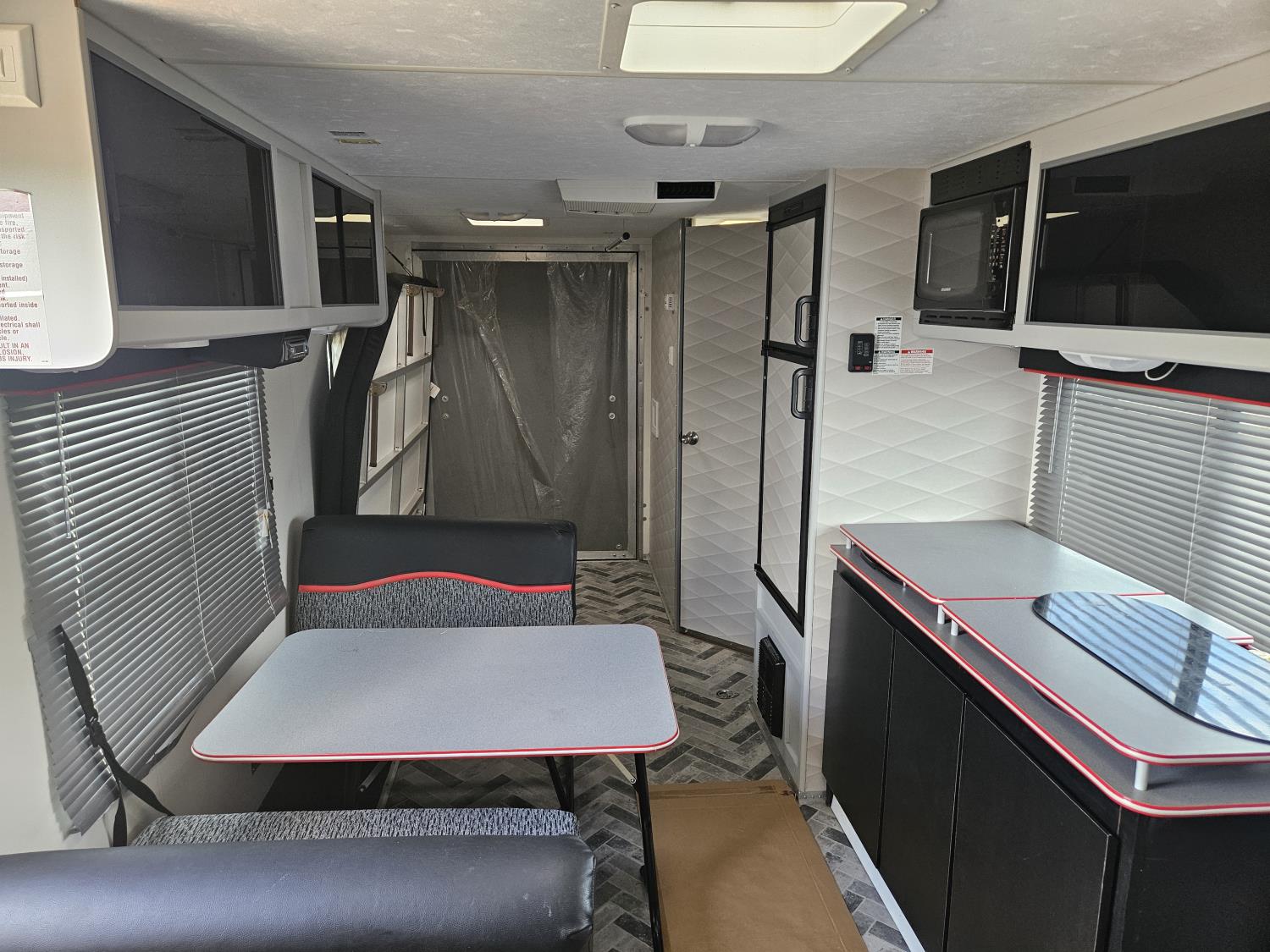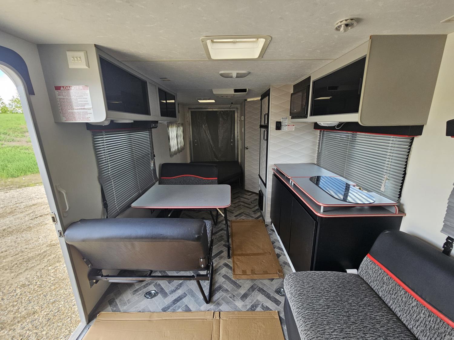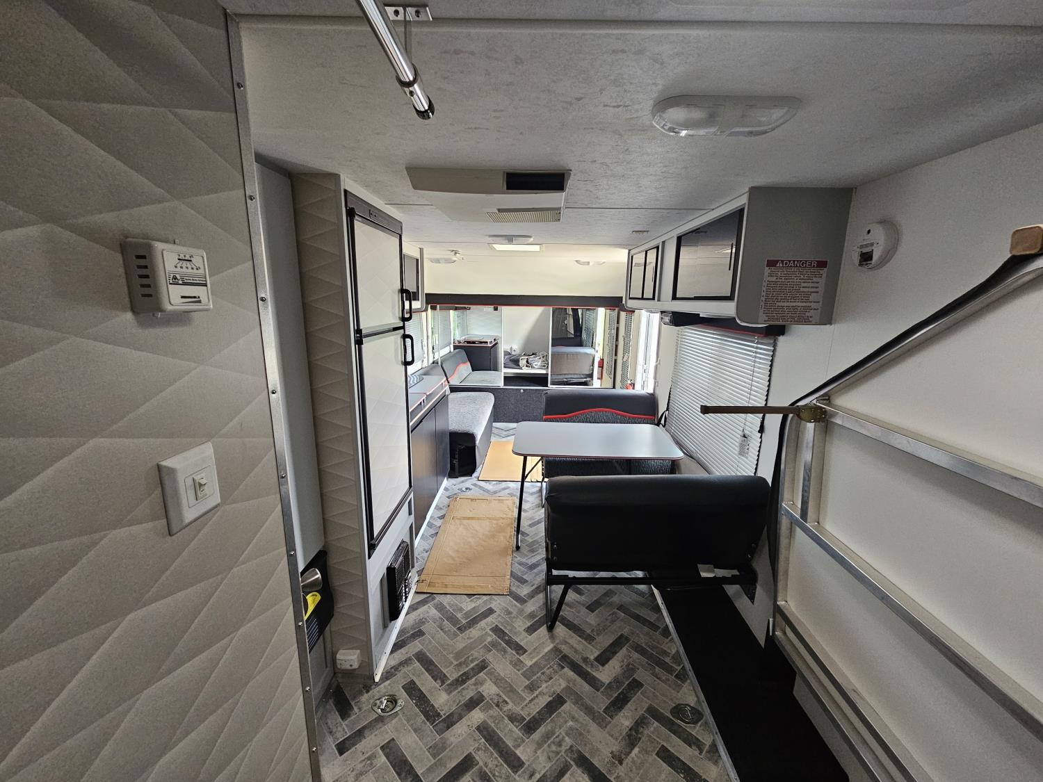fridge, microwave, full bath, A/C, manual awning, spring suspension, electric brakes, 205/75D14 tires