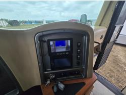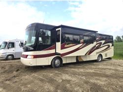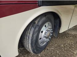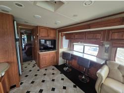 Cummins 400 HP engine, Allison transmission, (4) slides, (1) main awning, (4) smaller awning over windows and door, Onan 8000 watt quiet diesel generator with 2377 hrs, fridge with freezer, stove top, microwave, full washroom, rear bedroom with queen bad, vacuum, (2) AC units, (2) TV's, aluminum wheels, 11R22.5 tires
