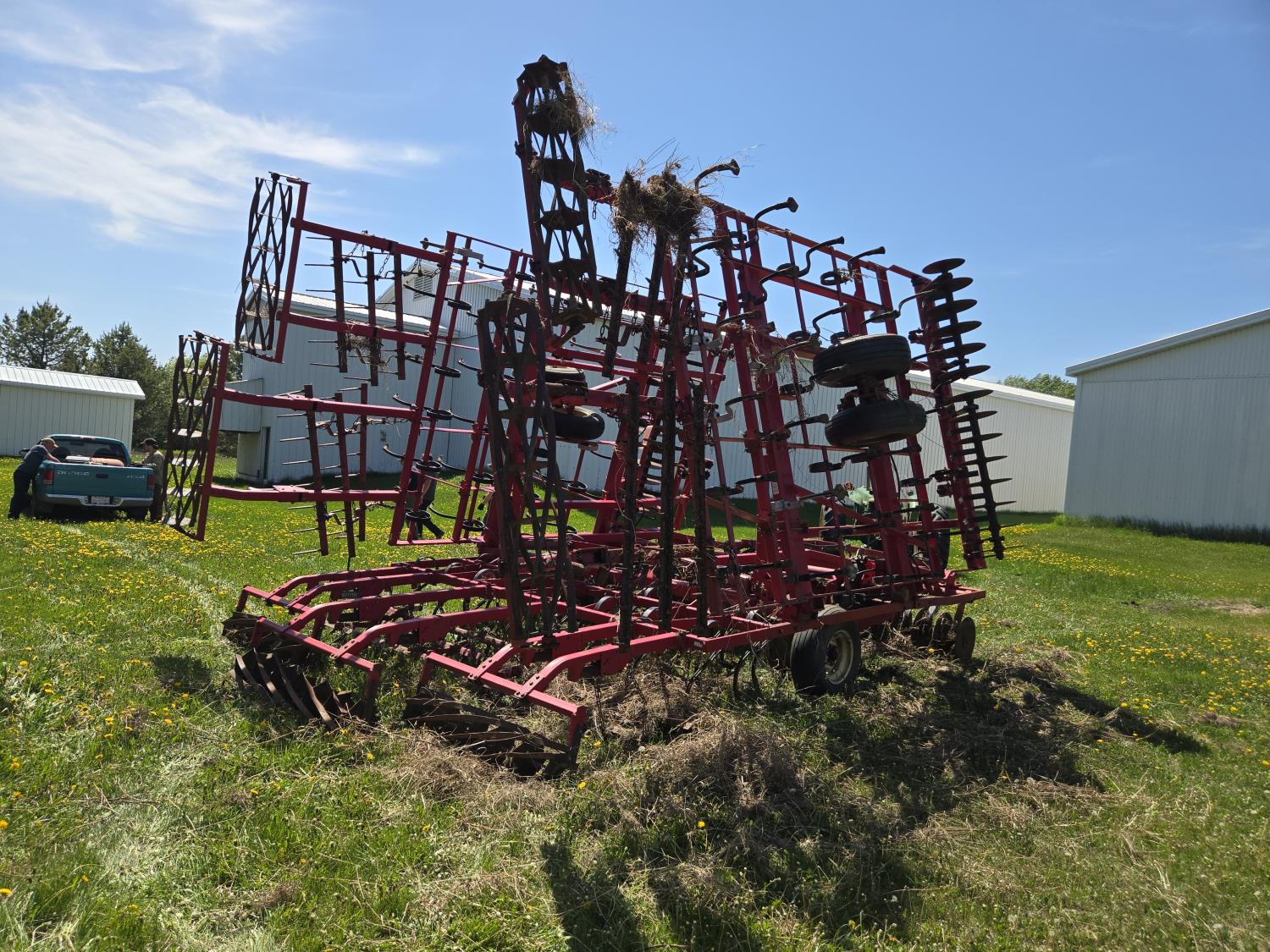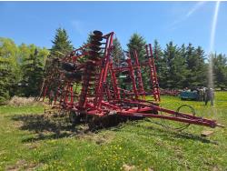 4 inch spacing, single 17.5 inch disc row, 3 bar stiff tooth mounted harrows, 11 inch rolling harrow baskets, walking axles on main frame and wings, 9.5-15 tires