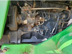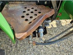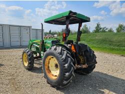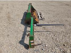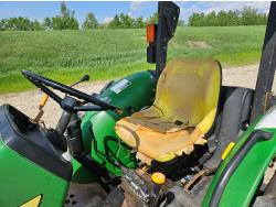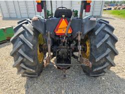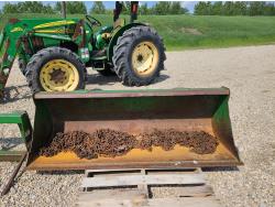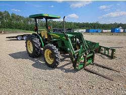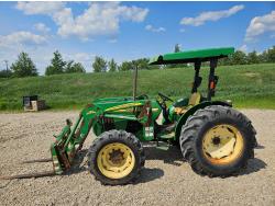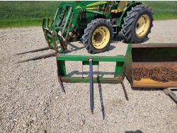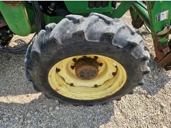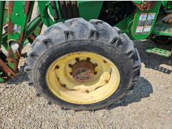 John Deere 522 loader, Q/A, 72 inch bucket, bale forks, 42 inch pallet forks, grill guard, 2.9 L 3 cylinder 53 HP, diesel engine, 8 speed partial synchro transmission, open station platform, joystick, 540 PTO, 3 point hitch, 2 rear hydraulic outlets, 9.5-24 front tires, 16.9-28 rear tires, (4) tire chains