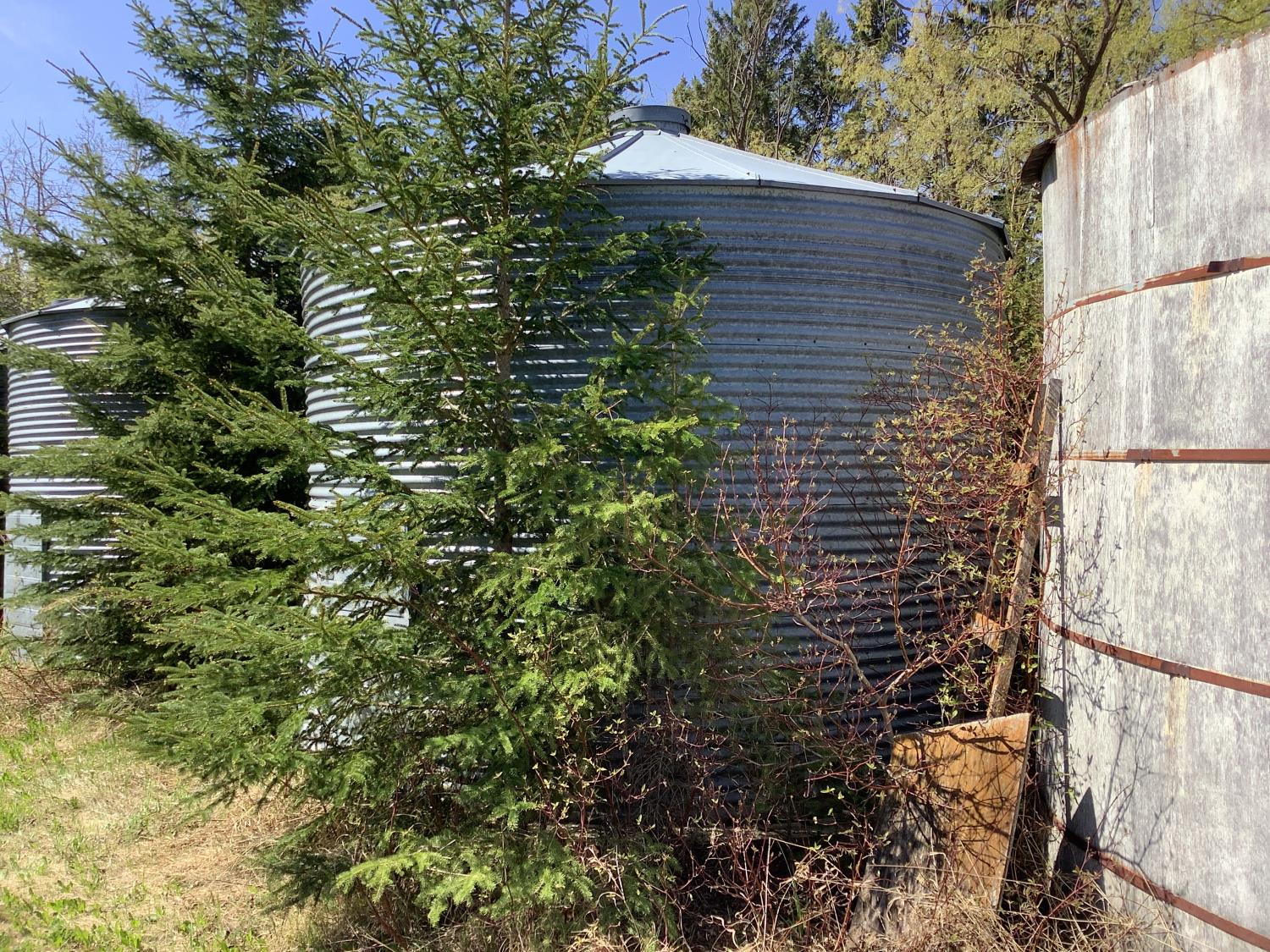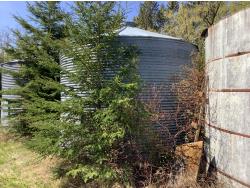 on concrete floor, Bin # 10. Note: There is a bit of spoiled grain in bin so take caution. Buyer may have to cut trees away to remove bin.