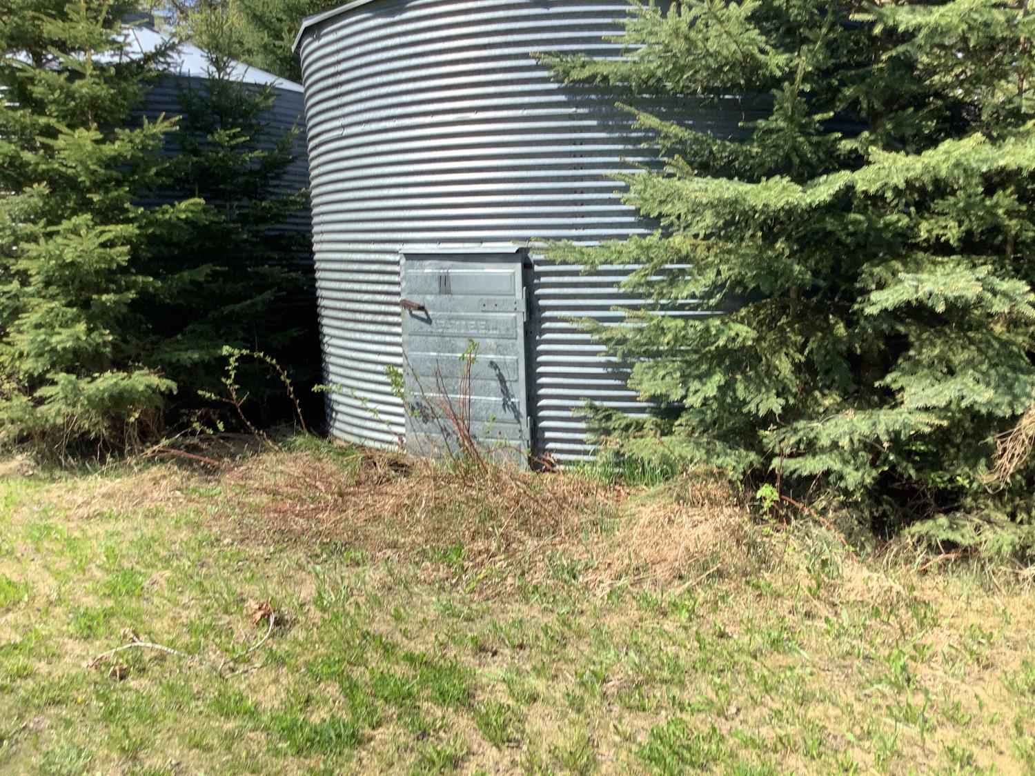 on concrete floor, Bin # 11. Note: There is a bit of spoiled grain in bin so take caution. Buyer may have to cut trees away to remove bin.