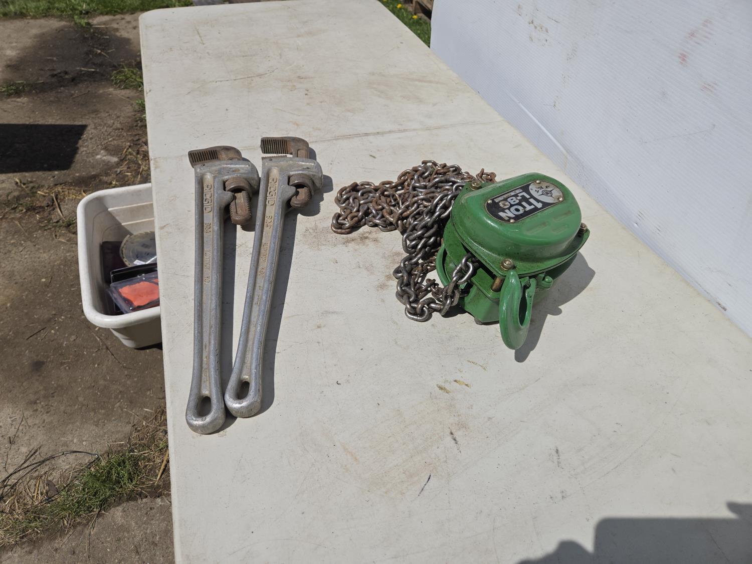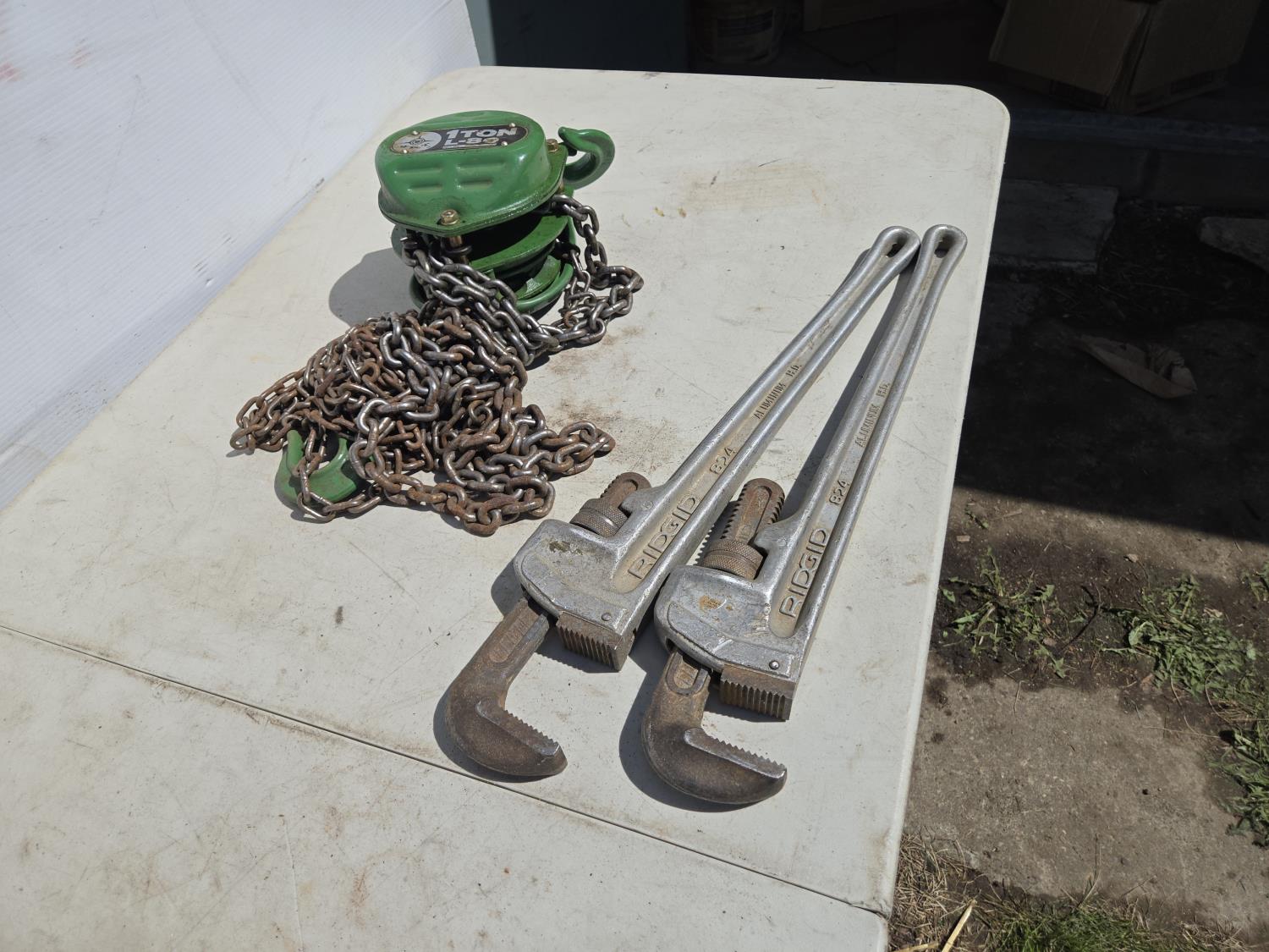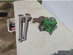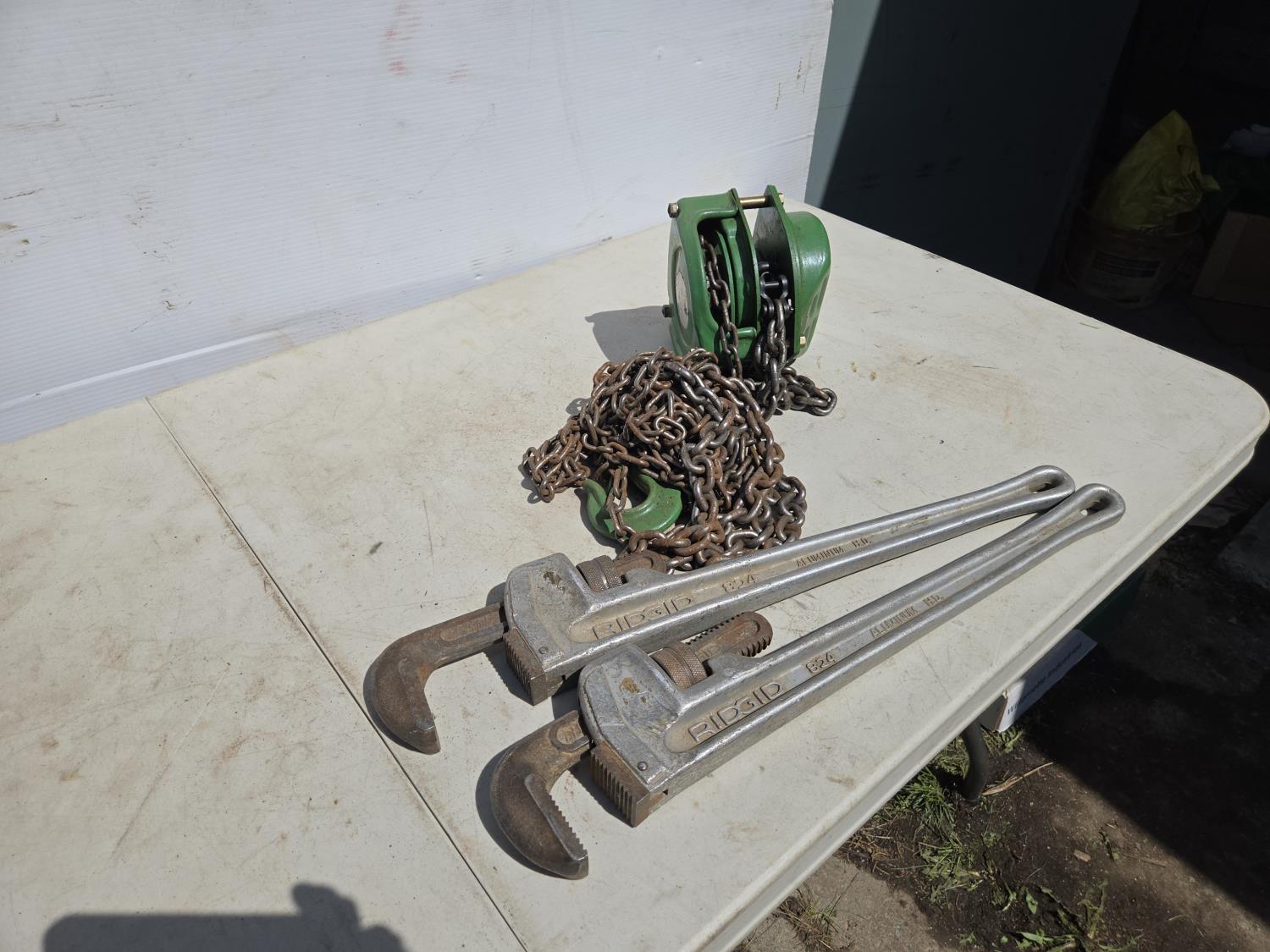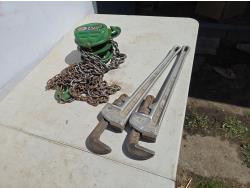 2143 (2) 24 Inch Ridgid Pipe Wrench's & 1 Ton Chain Hoist