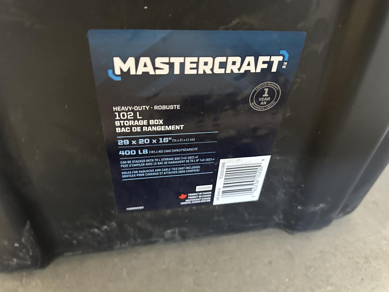 1689 (4) Mastercraft 102 L Heavy Duty Stackable Storage Boxes with Lids