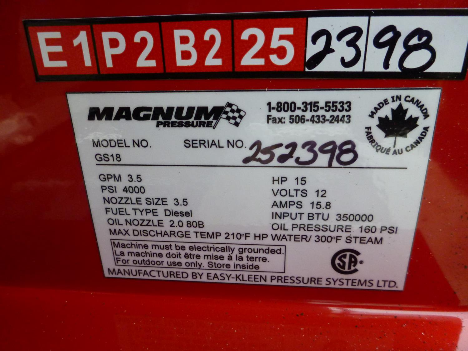 3.5 GPM at 4000 PSI, 15 HP, gasoline engine, electric start, 12 volt burner, oil/diesel fired burned/thermostat, schedule 80 coil with stainless steel housing, fully welded, powder coated frame, 10 gallon poly fuel tank, 30' hose and wand