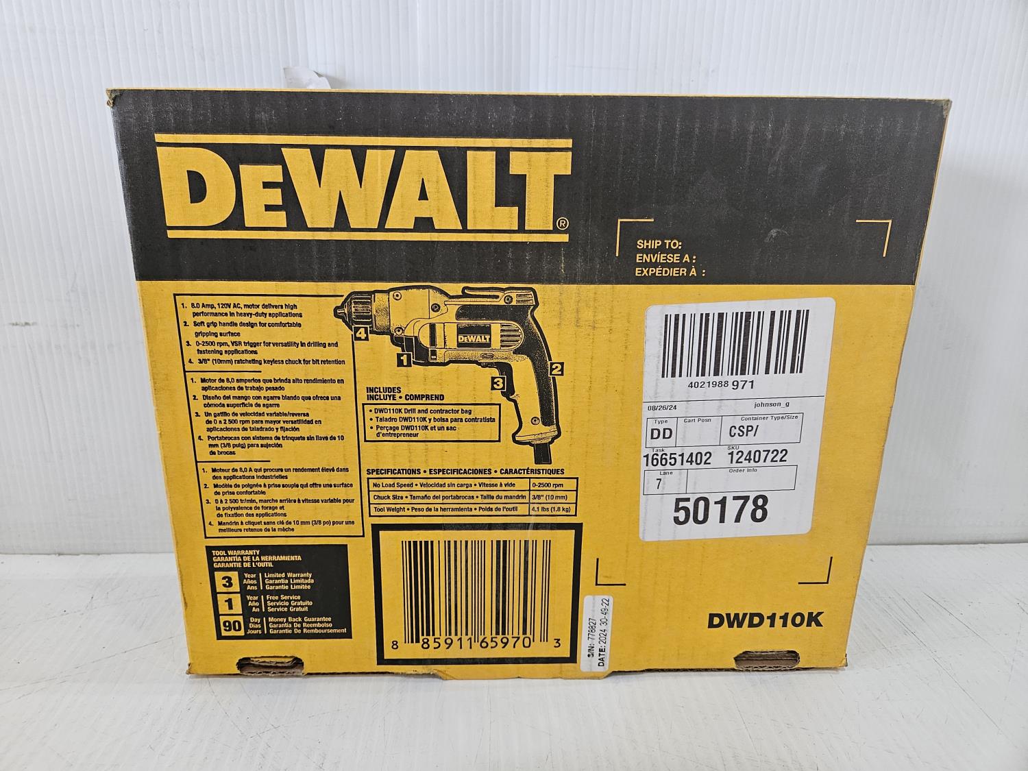 1043 DeWalt 3/8 Inch Keyless Chuck Drill (Unused)