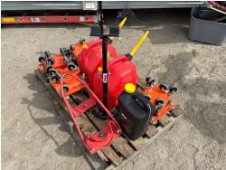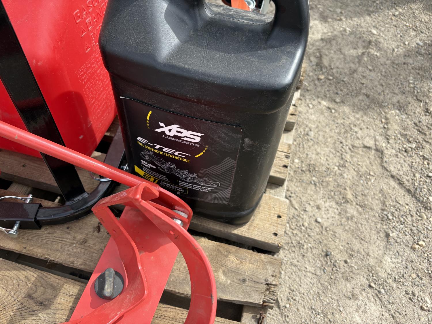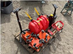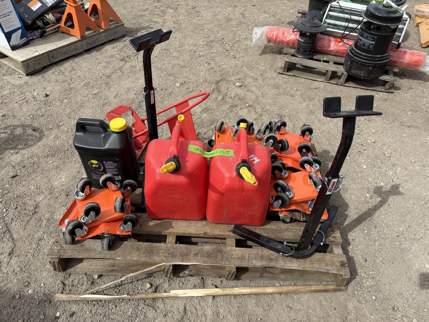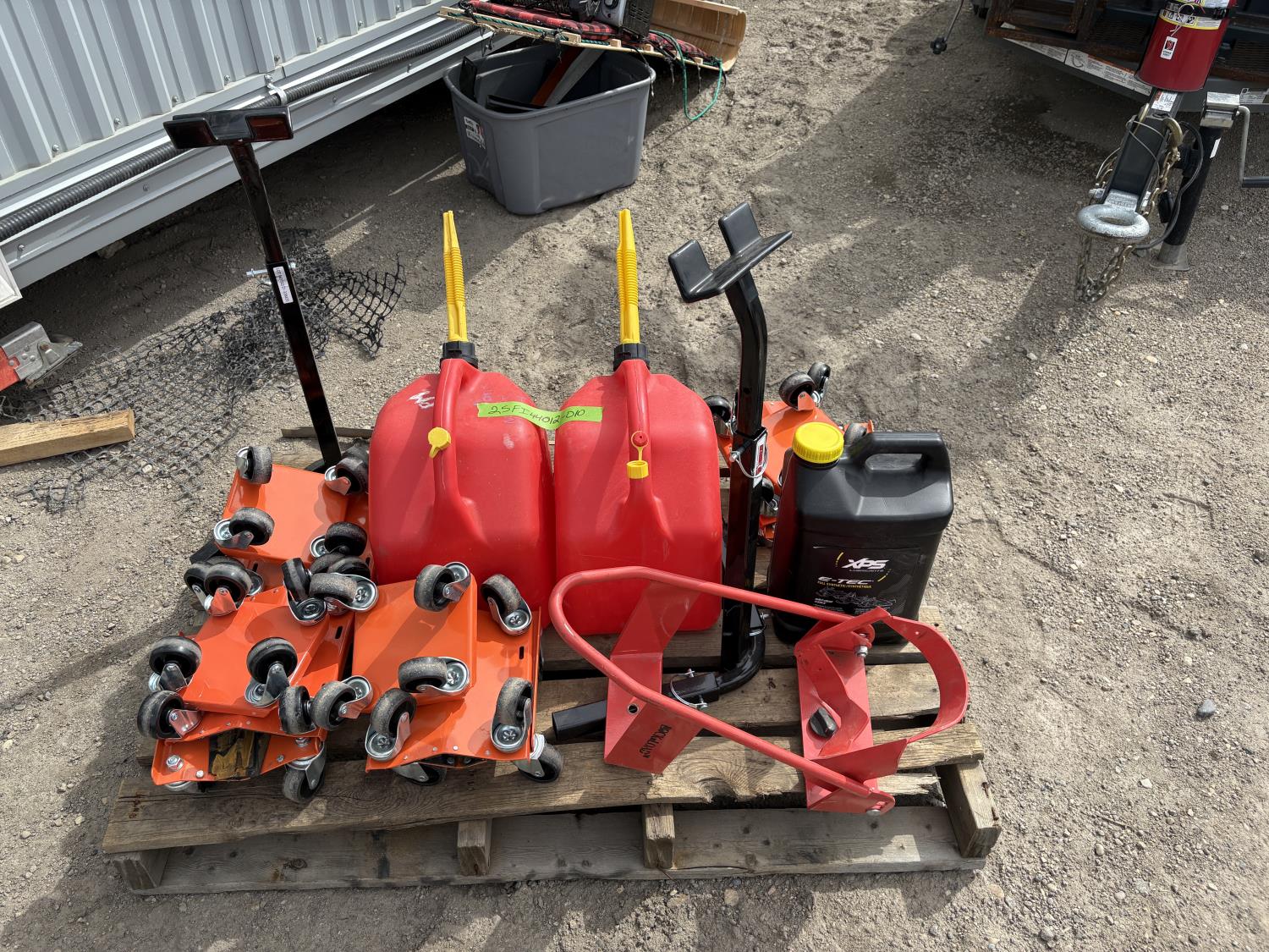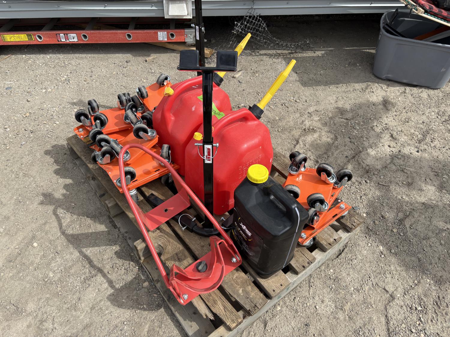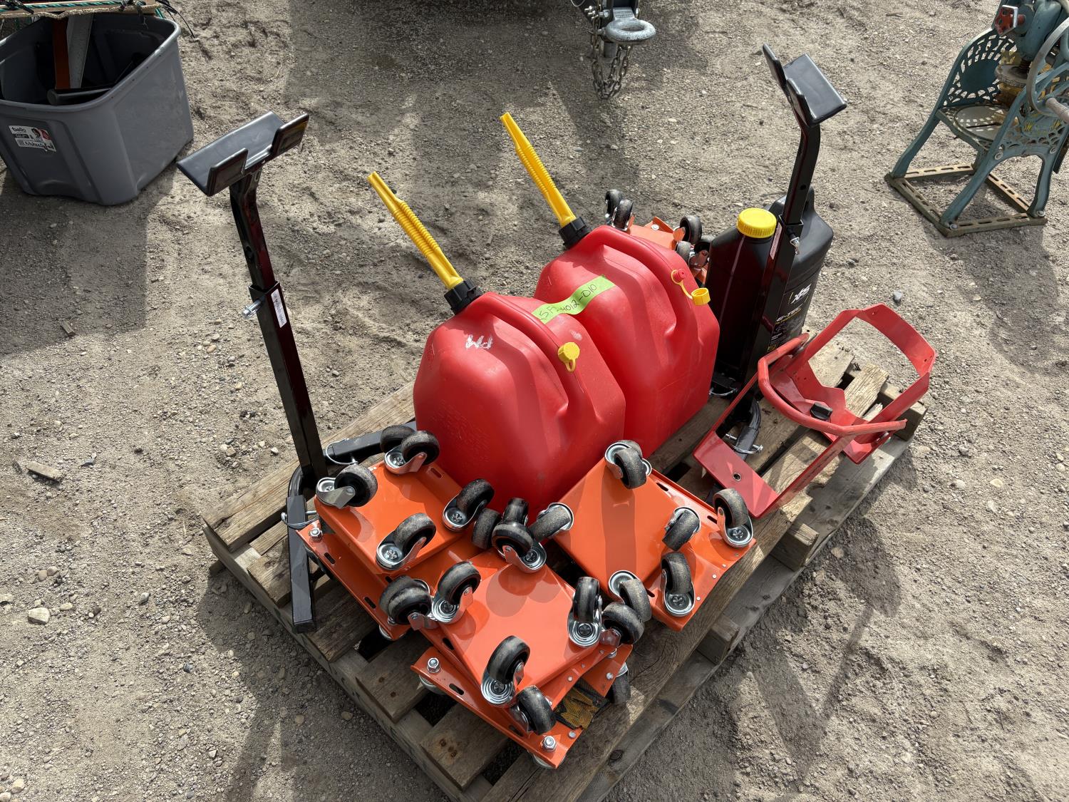 (4) sets of dolly for snowmobiles, (2) jerry cans, (2) Track lifts, (1) motorcycle wheel chock, Jug of snowmobile oil