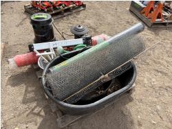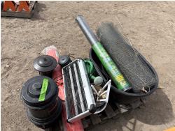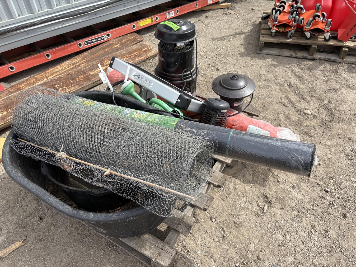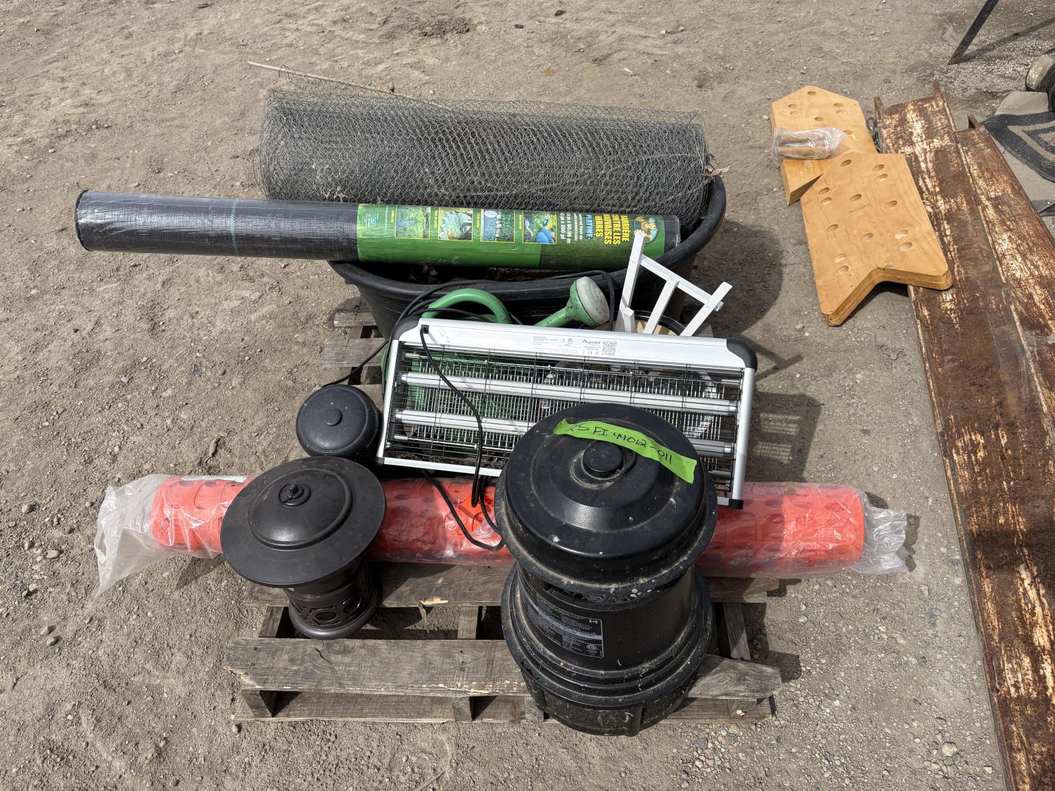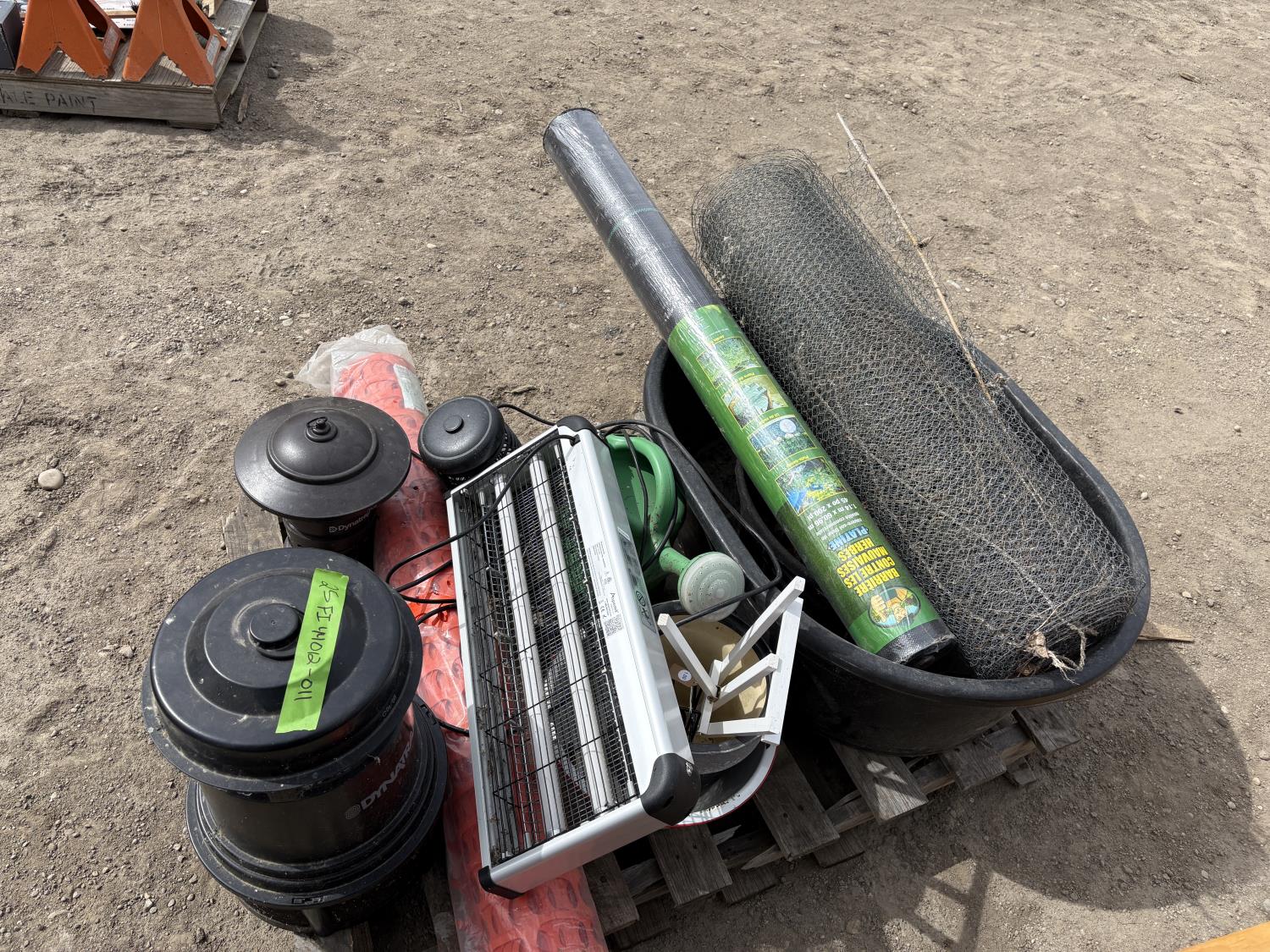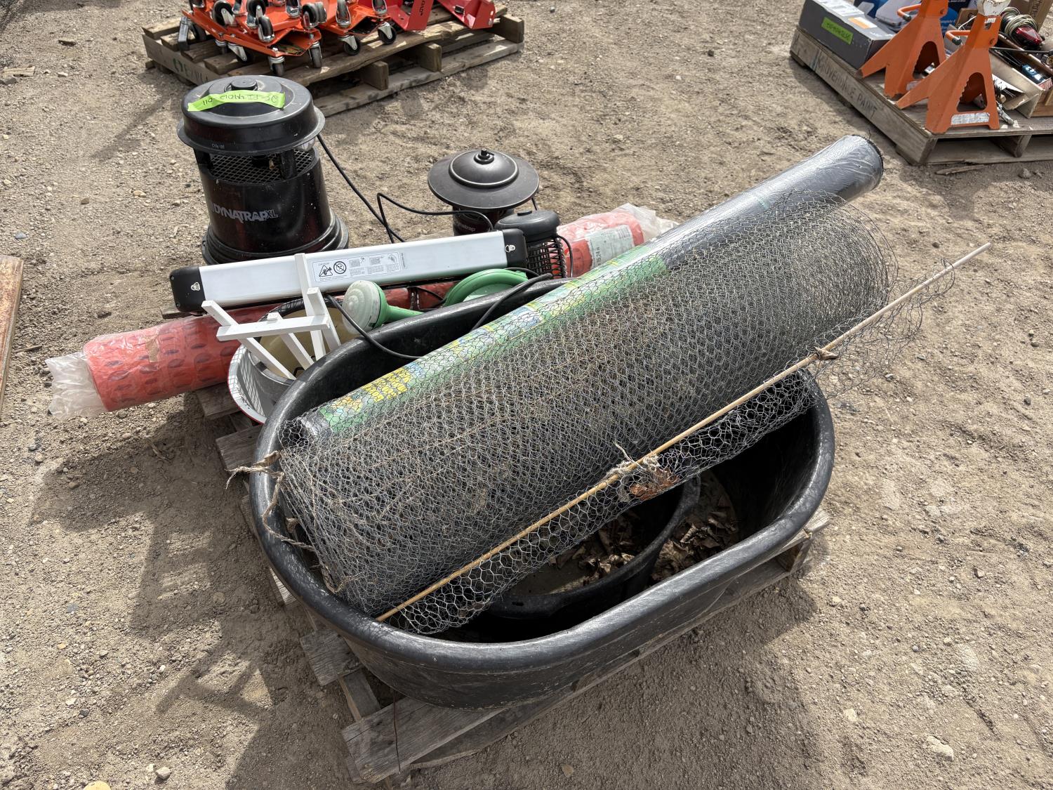 (1) roll underlay, (1) Snow fence, (1) Chicken fence, (2) water containers, (4) Bug zappers, flower pots, water can