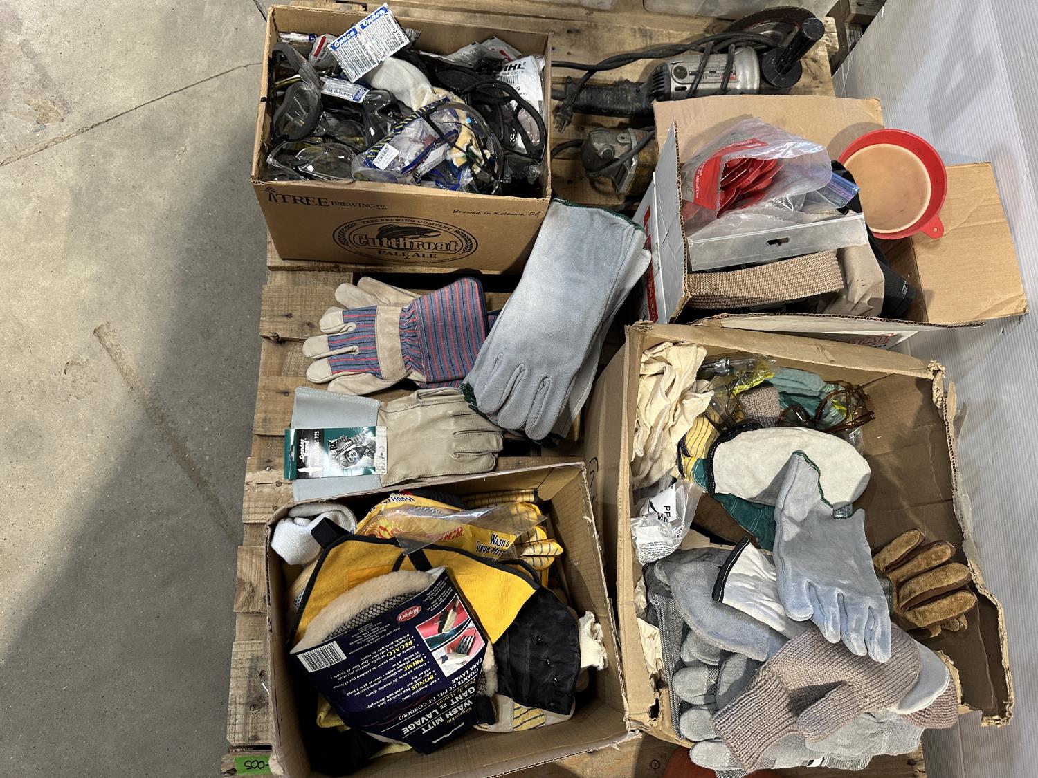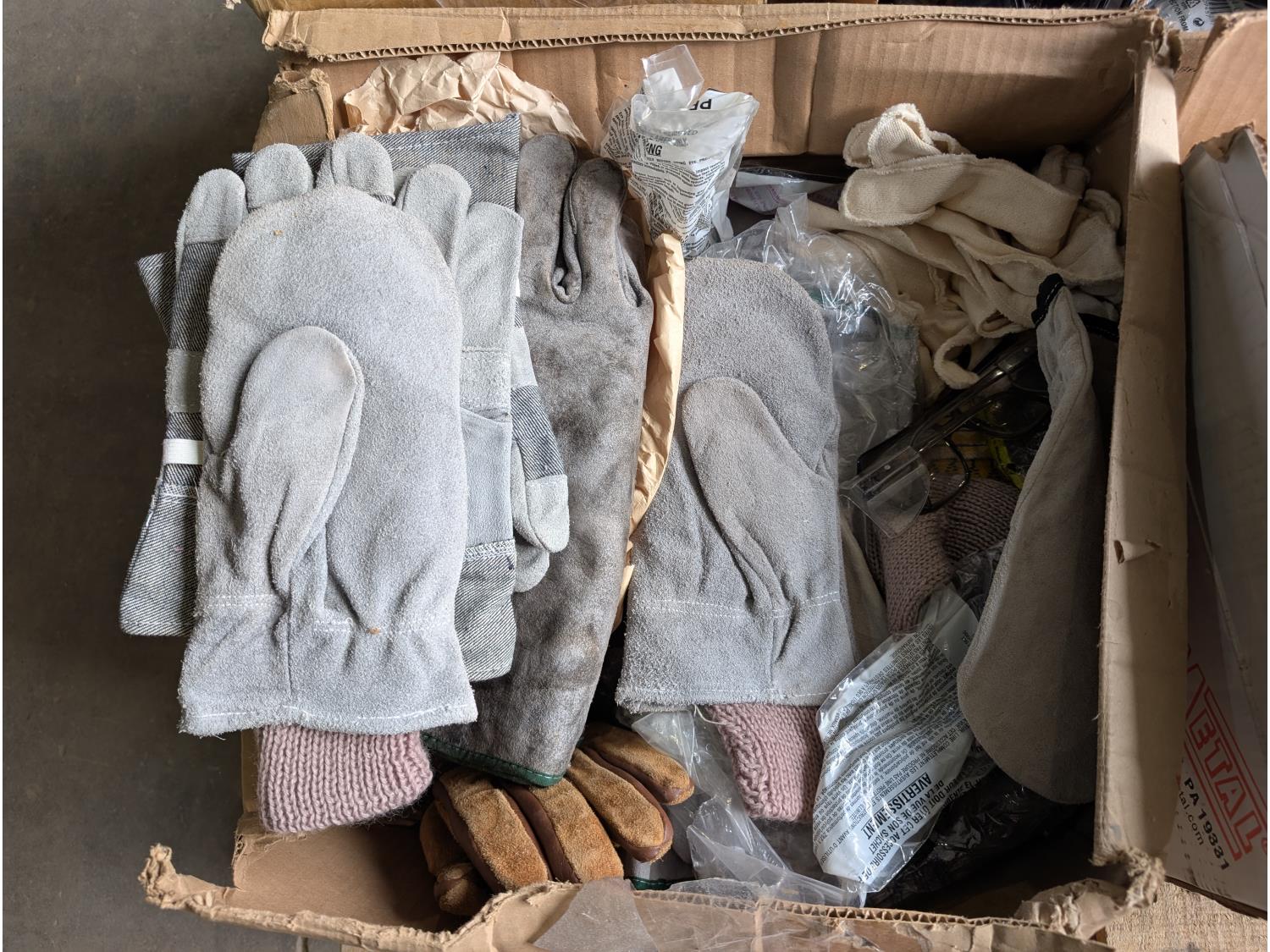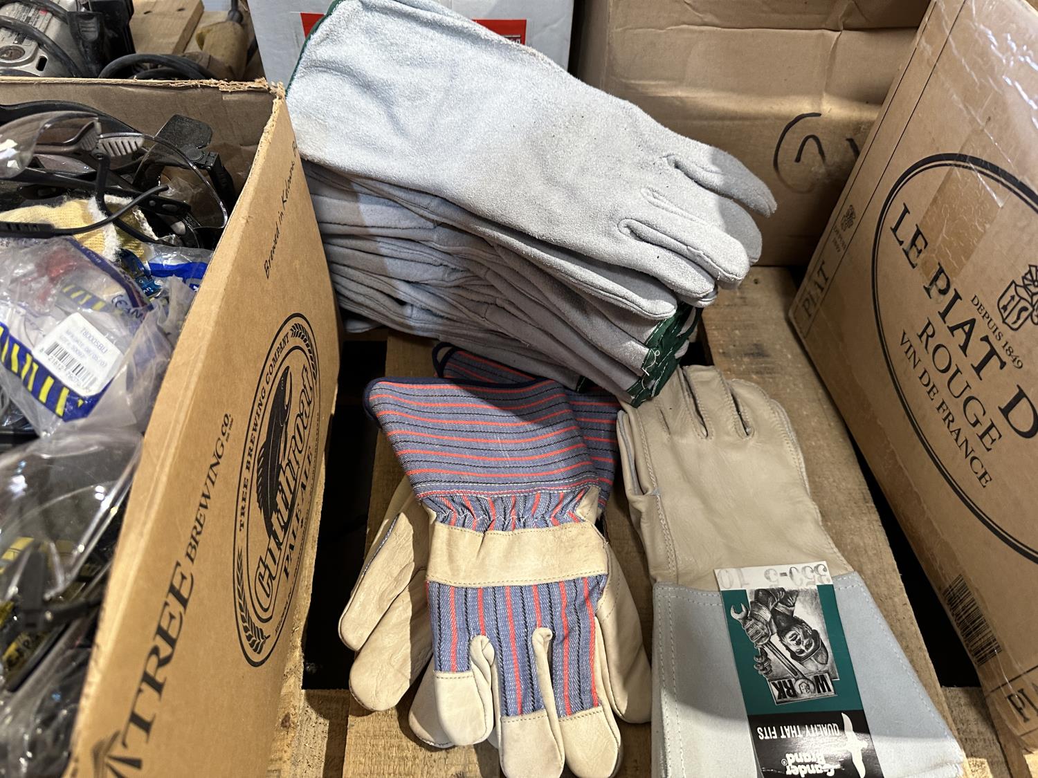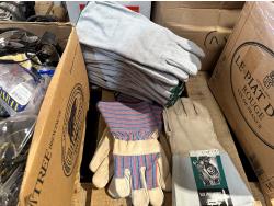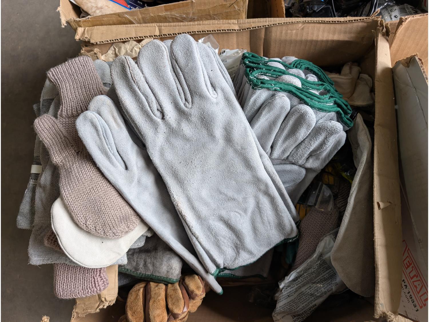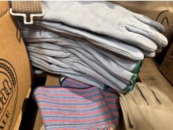 qty of leather welding gloves, leather work gloves, winter gloves, safety glasses, mostly unused