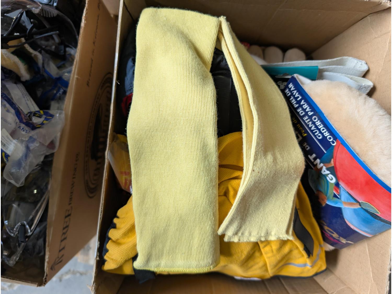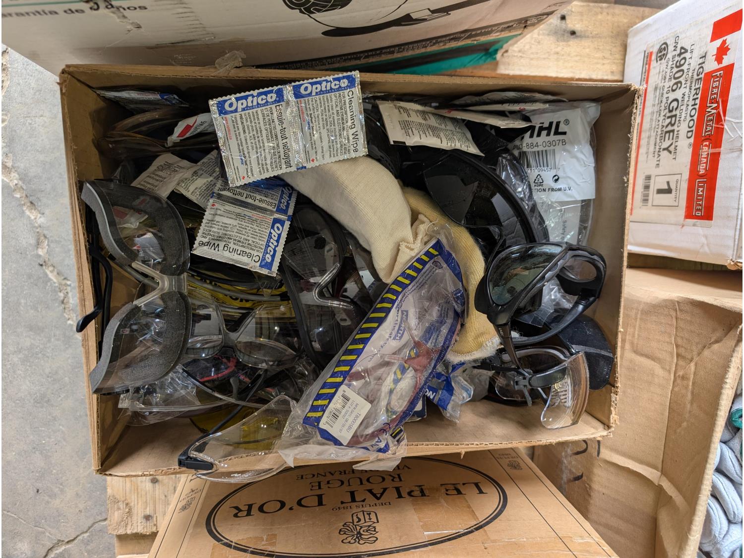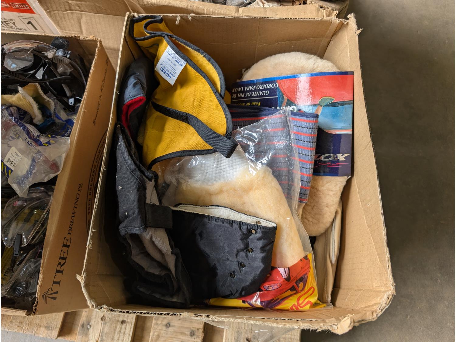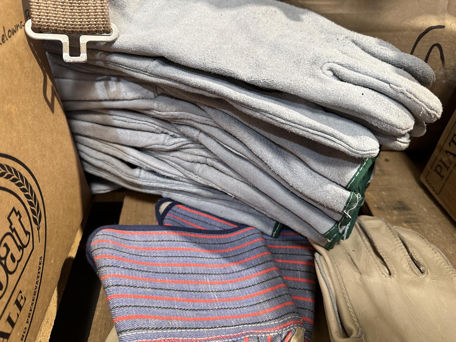 qty of leather welding gloves, leather work gloves, winter gloves, safety glasses, mostly unused