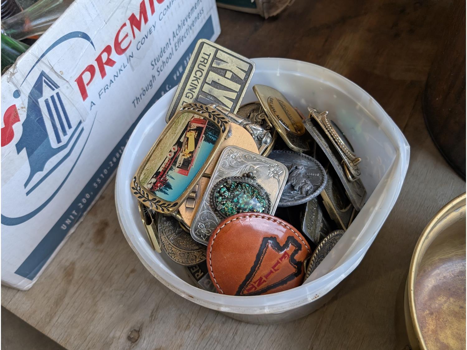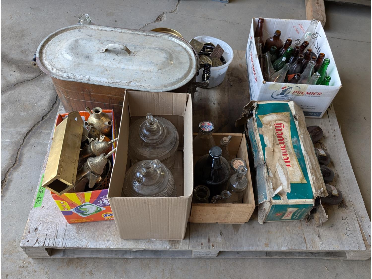 1422 Qty of Antique Bottles, Brass Items and Belt Buckles