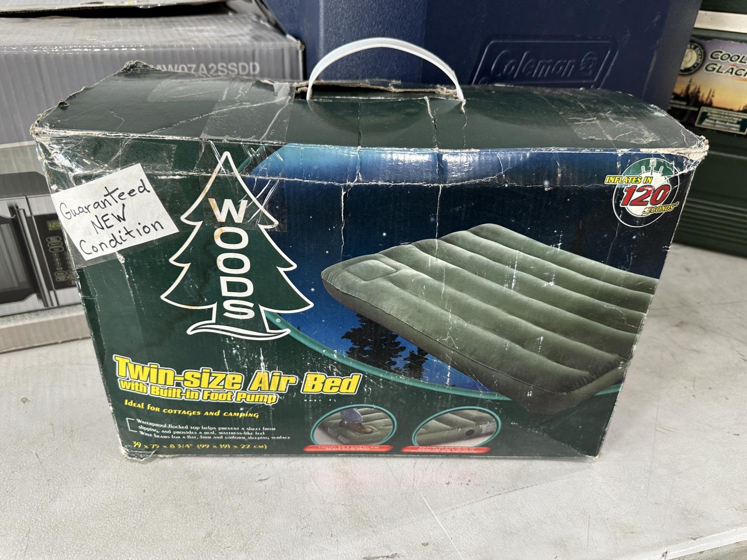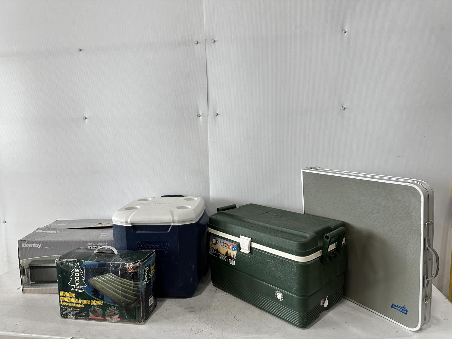 Woods twin-size air bed, Danby microwave, (2) coolers, small folding table