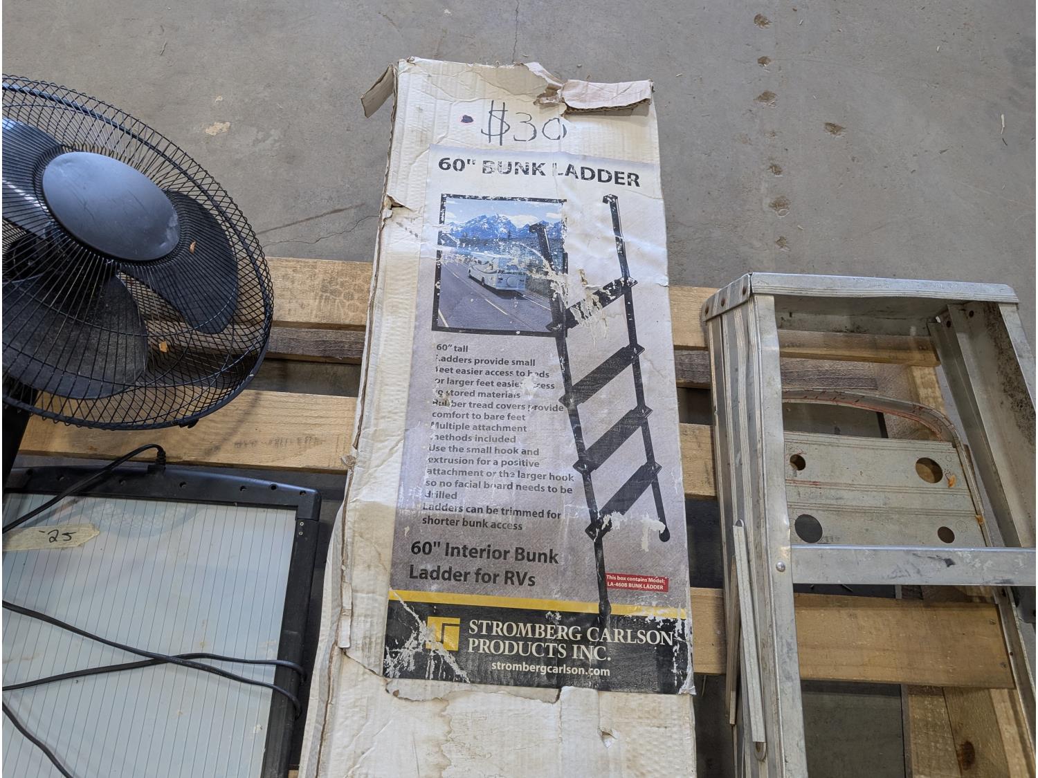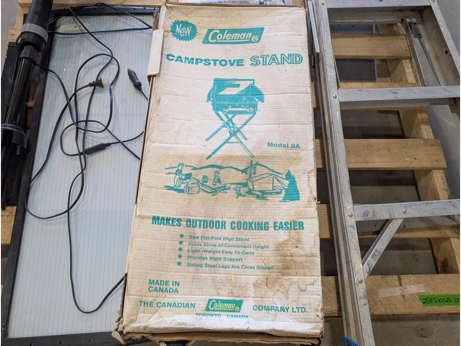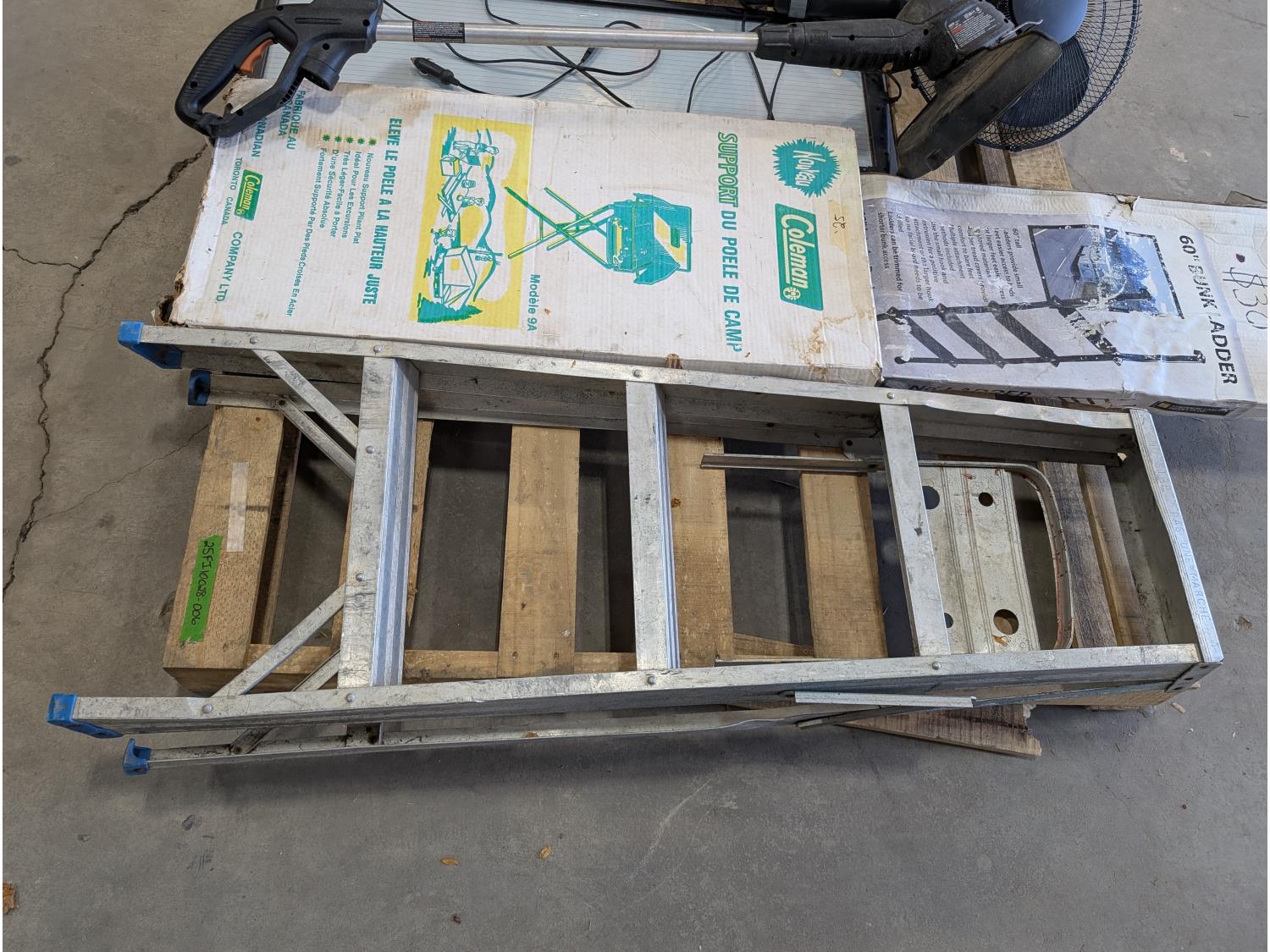 3 ft aluminum step ladder, solar panel, camp stove stand, bunk ladder, shovel, electric grass trimmer
