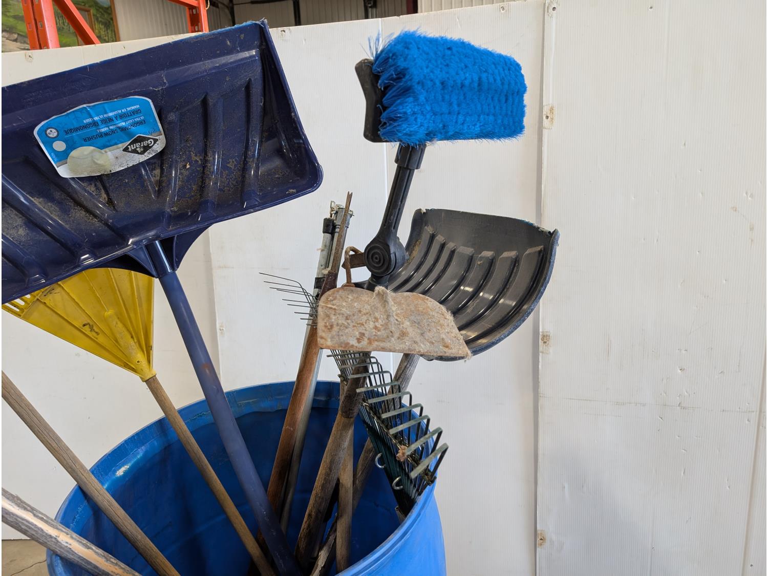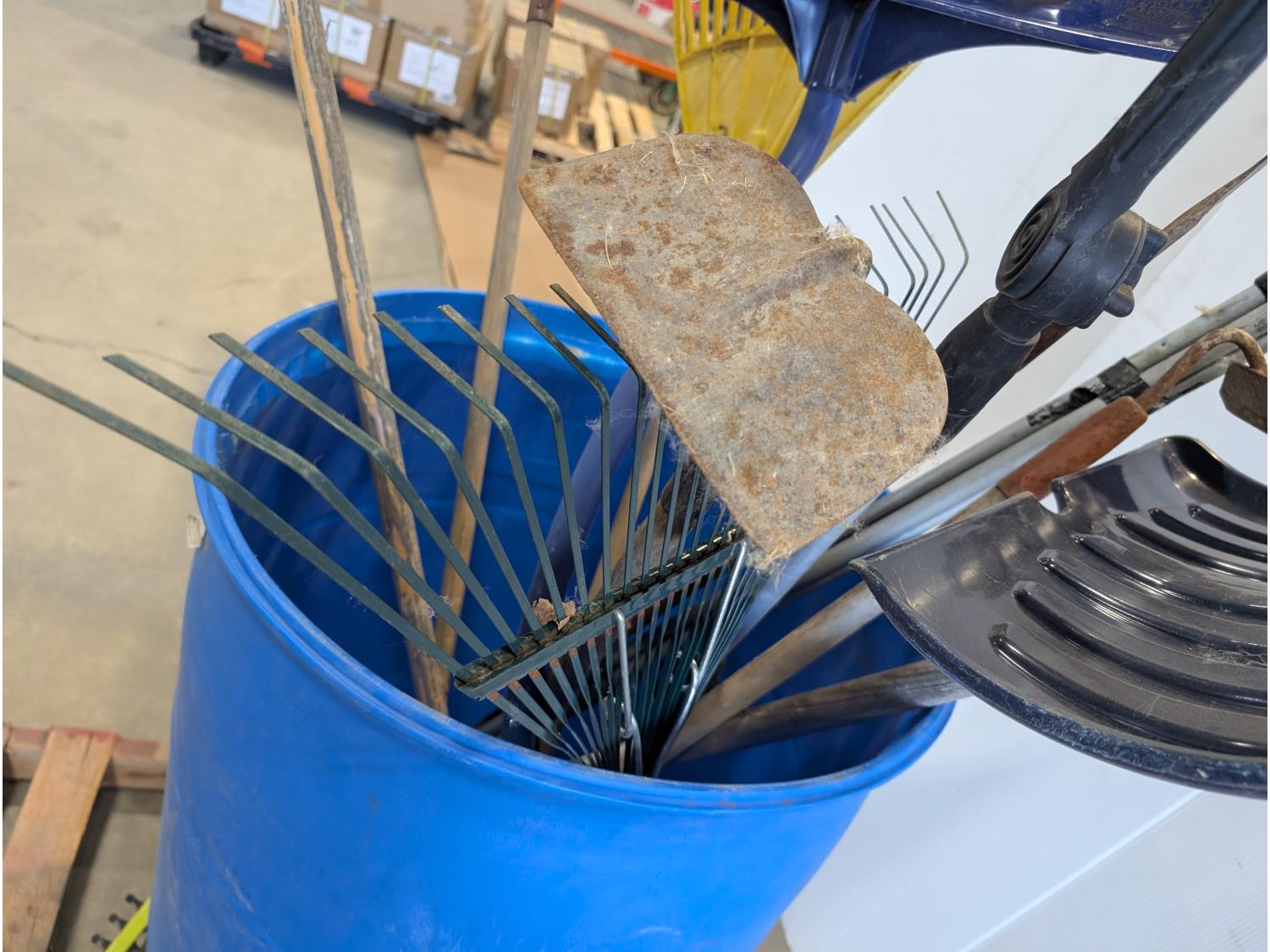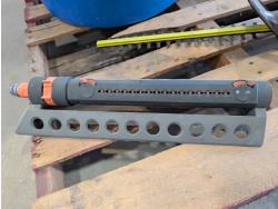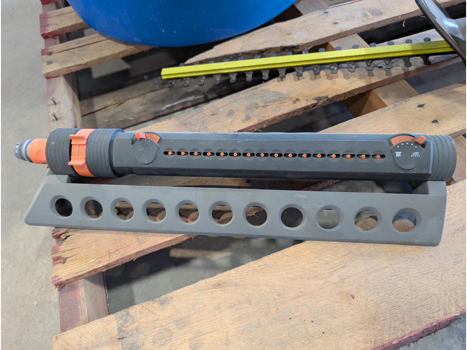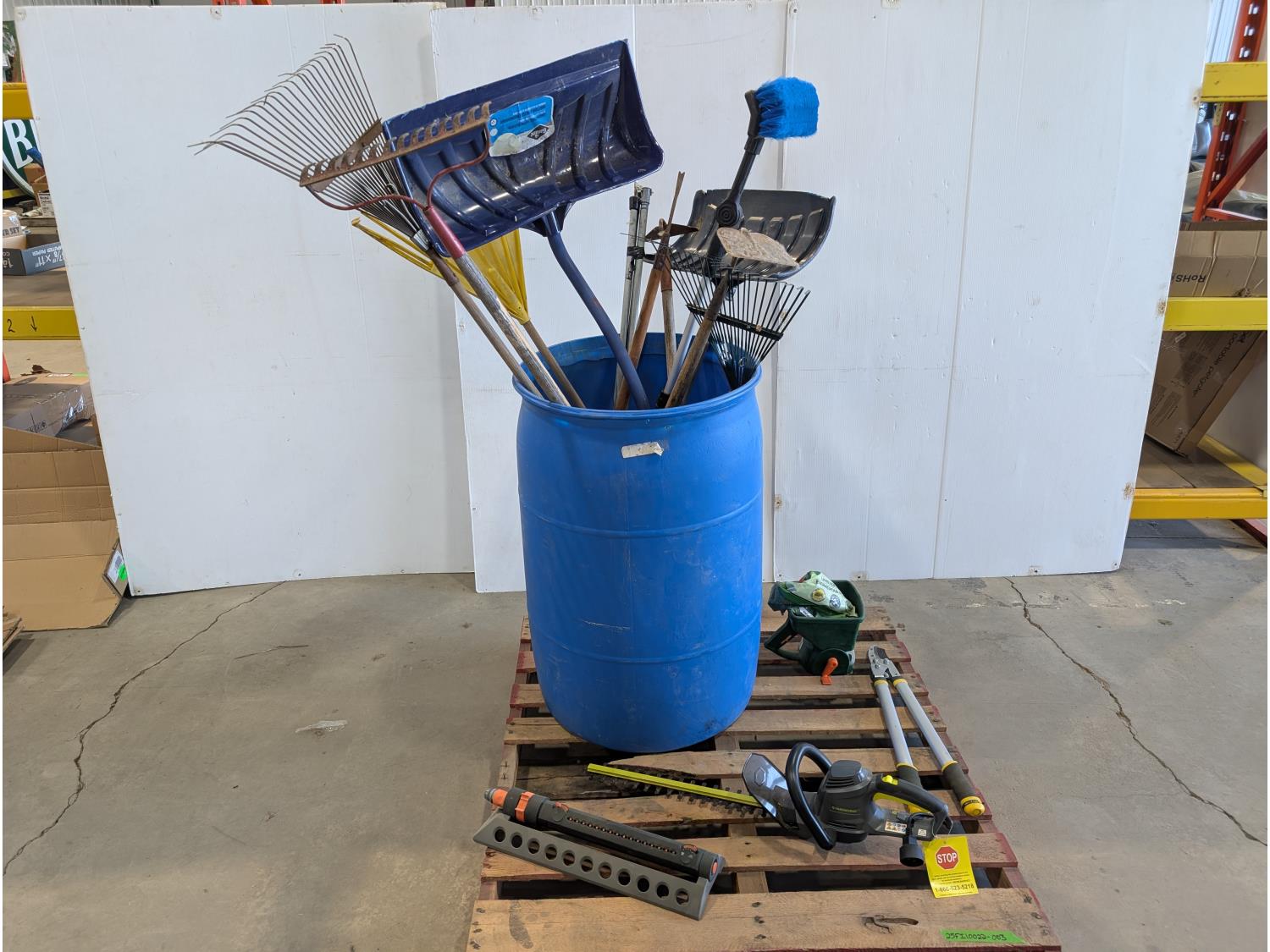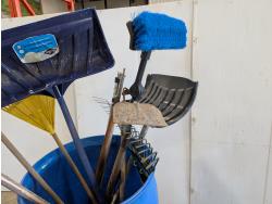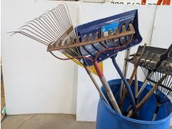 Rakes, shovels, sprinkler, electric hedge trimmer, pruning shears, hand-held broadcast seeder