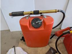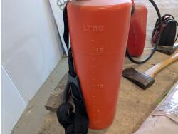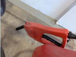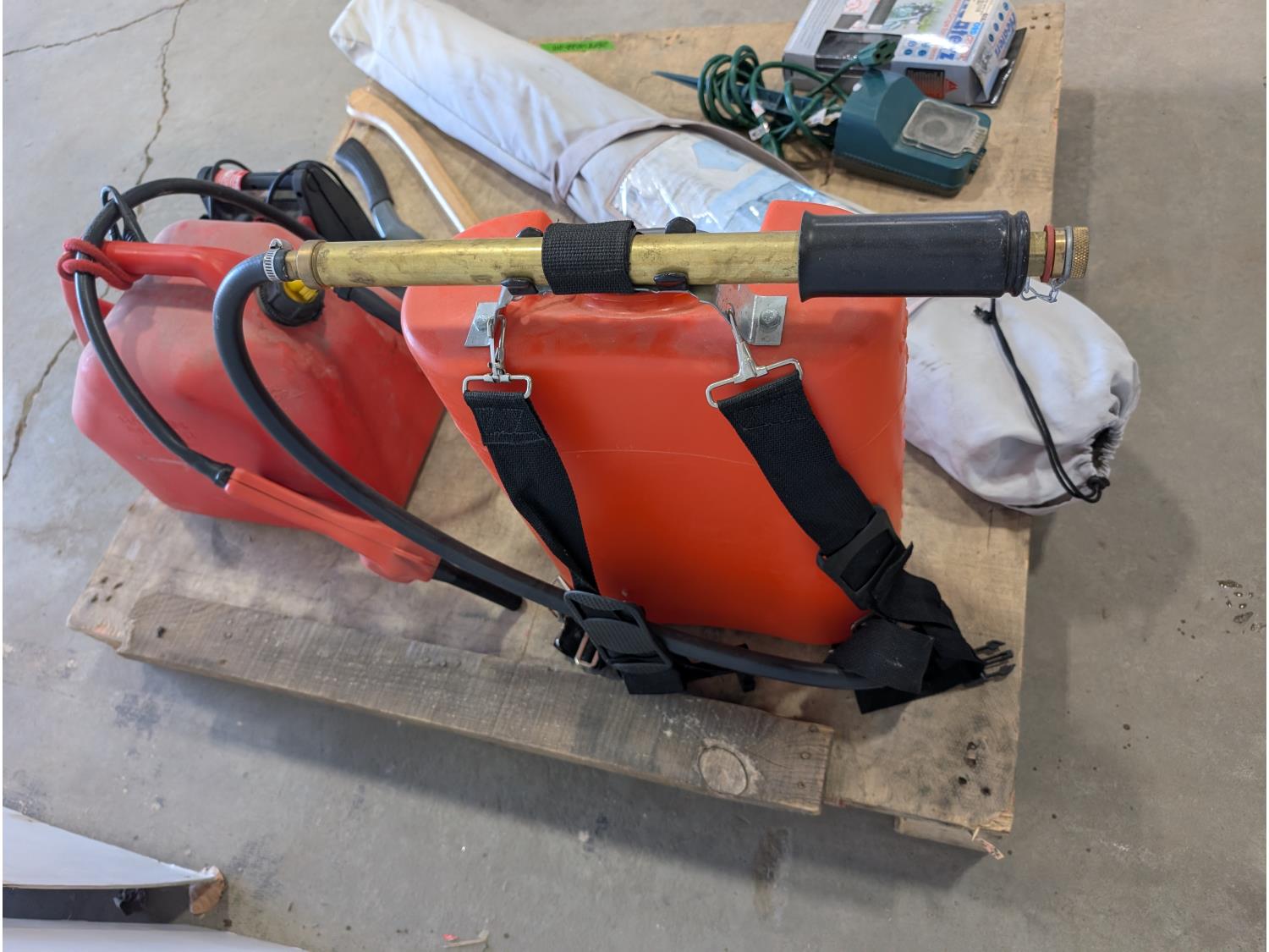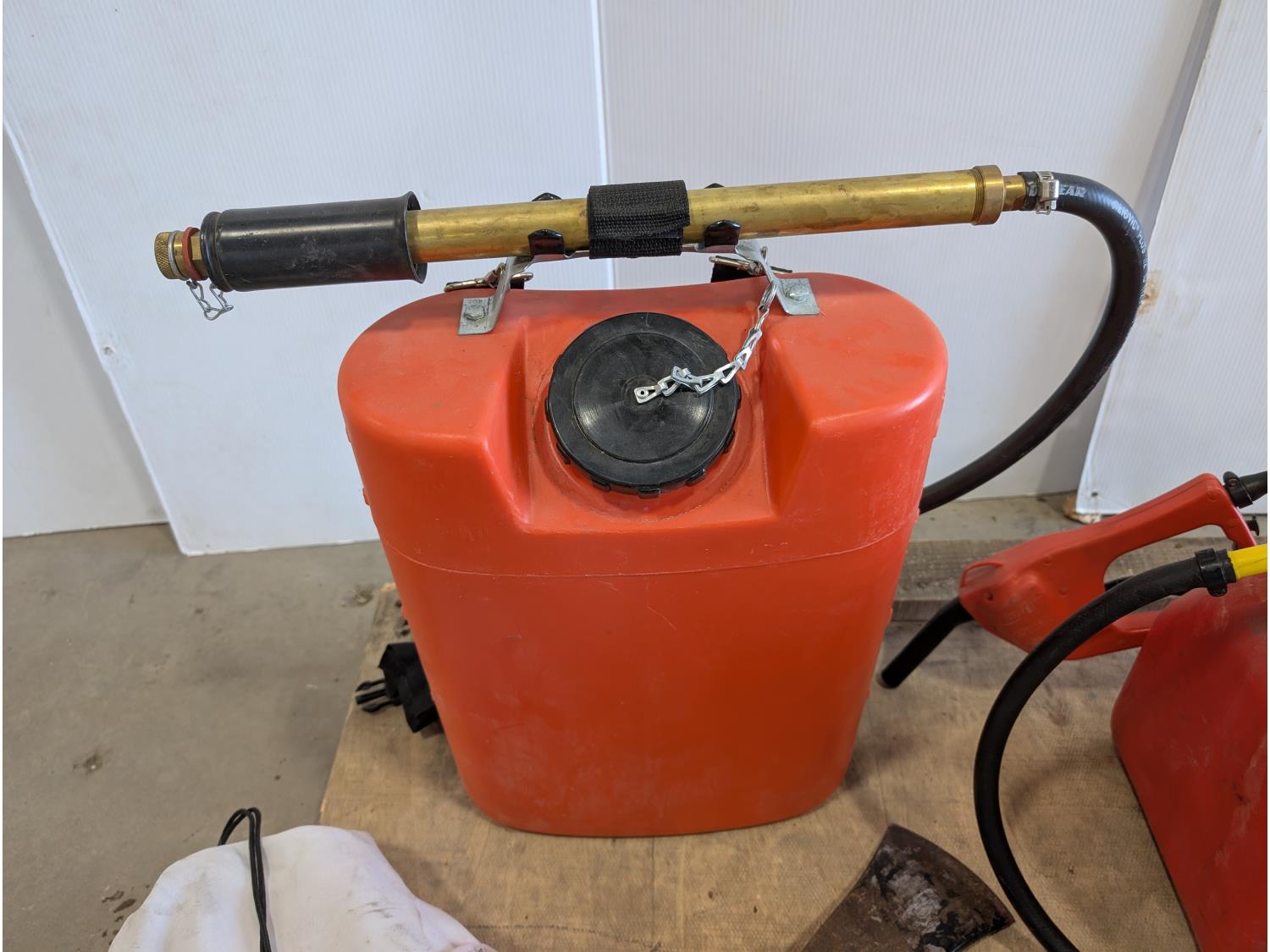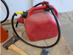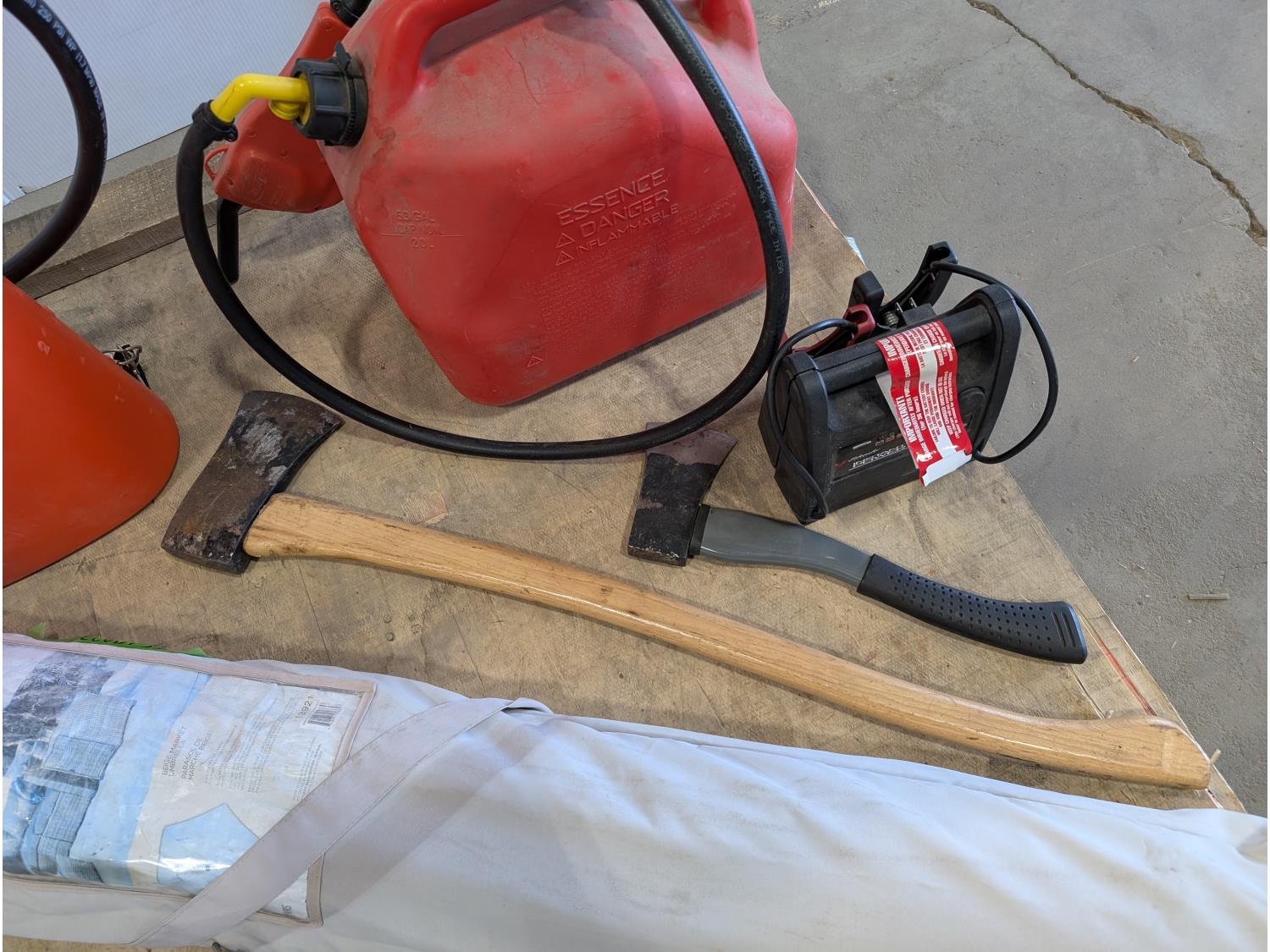 Poly backpack tank, 20L jerry can with fuel nozzle, 400 amp jump starter, axe, hatchet, garden timer, heated cruiser grips