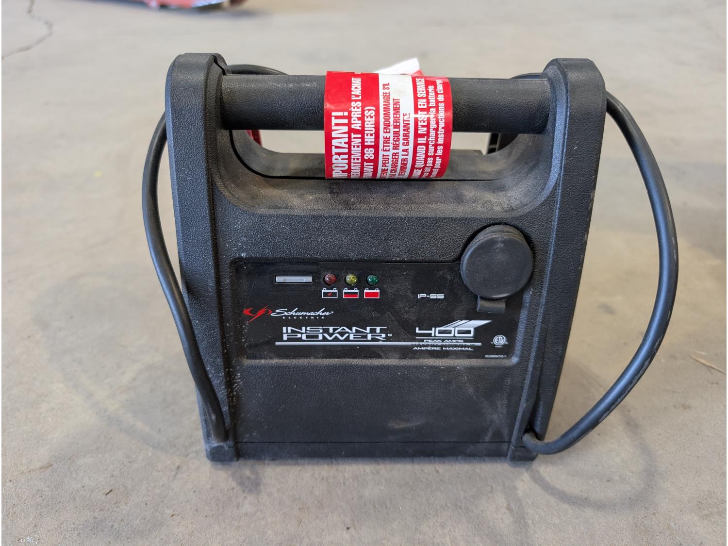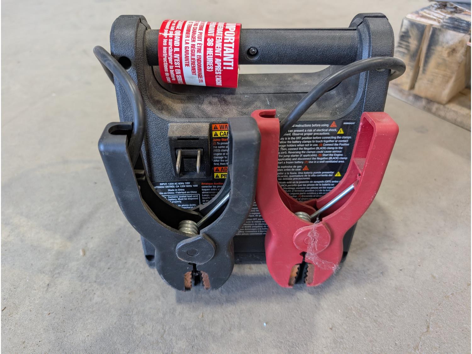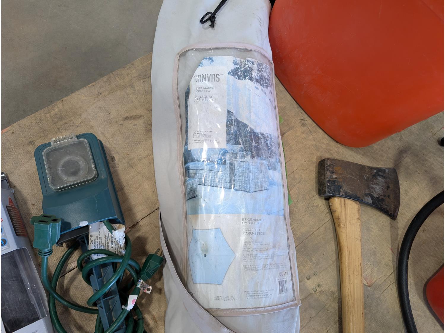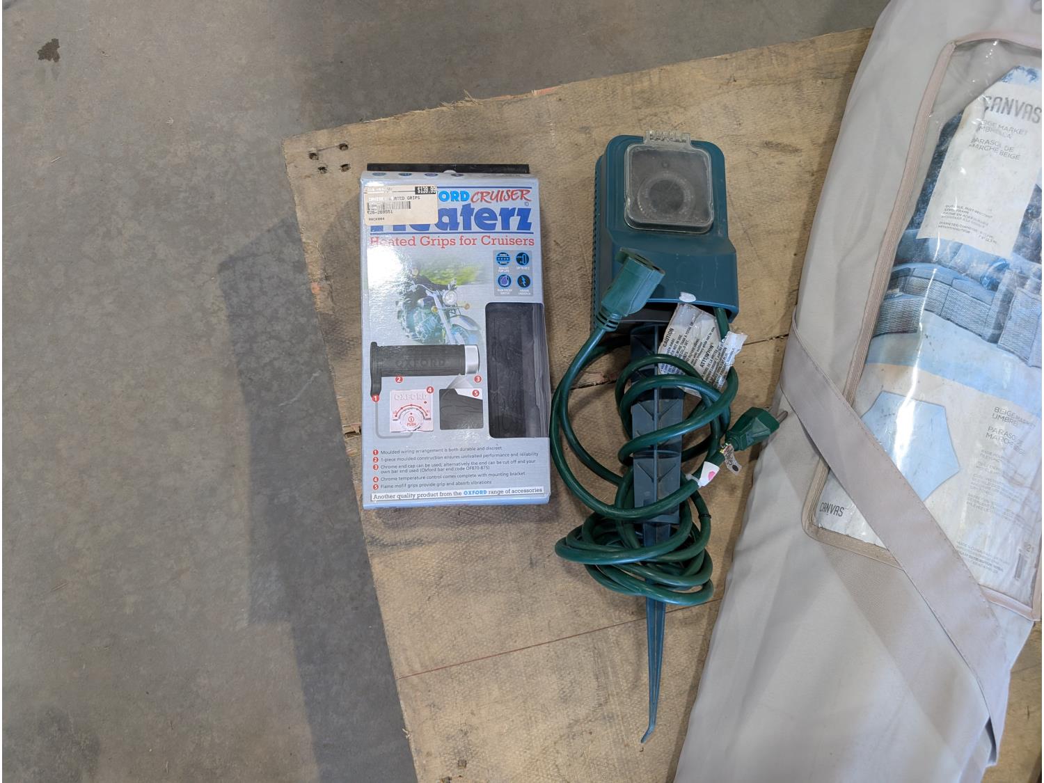 Poly backpack tank, 20L jerry can with fuel nozzle, 400 amp jump starter, axe, hatchet, garden timer, heated cruiser grips
