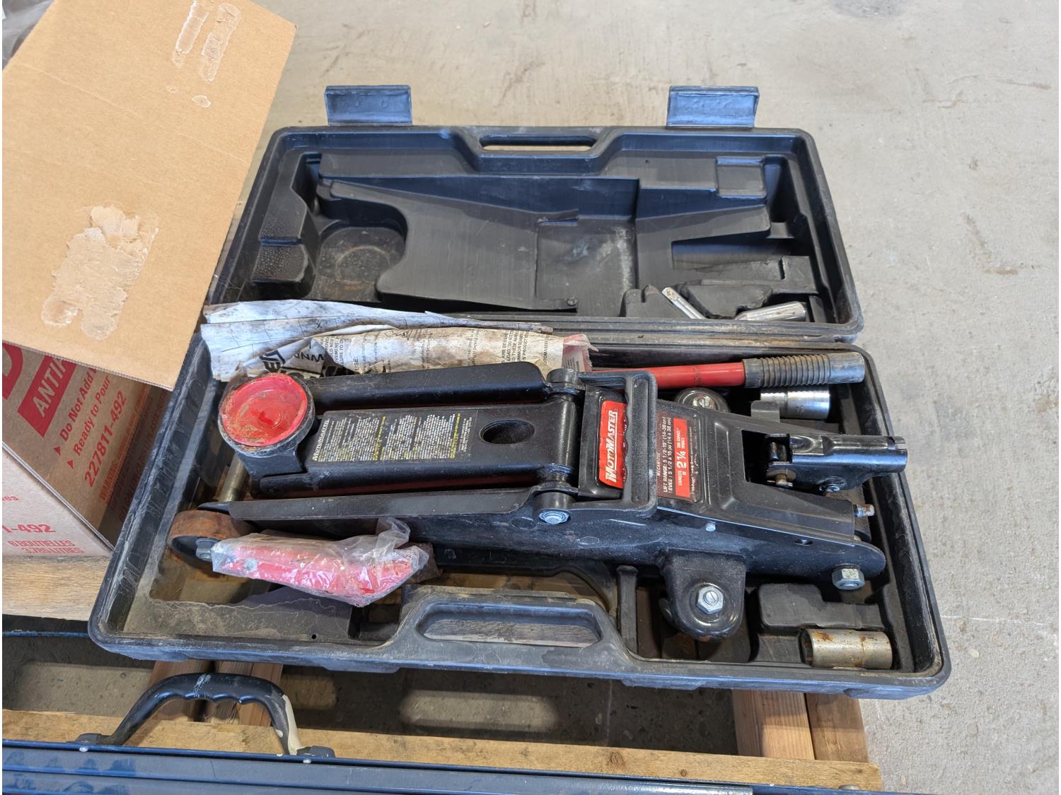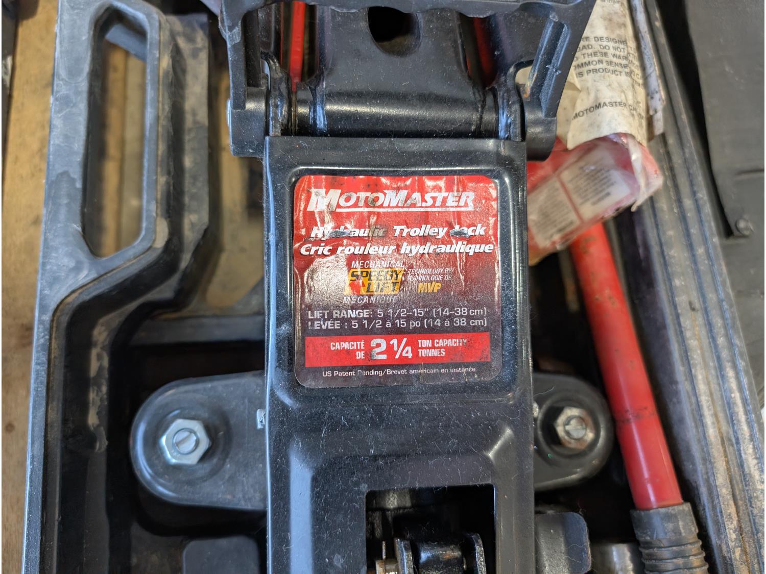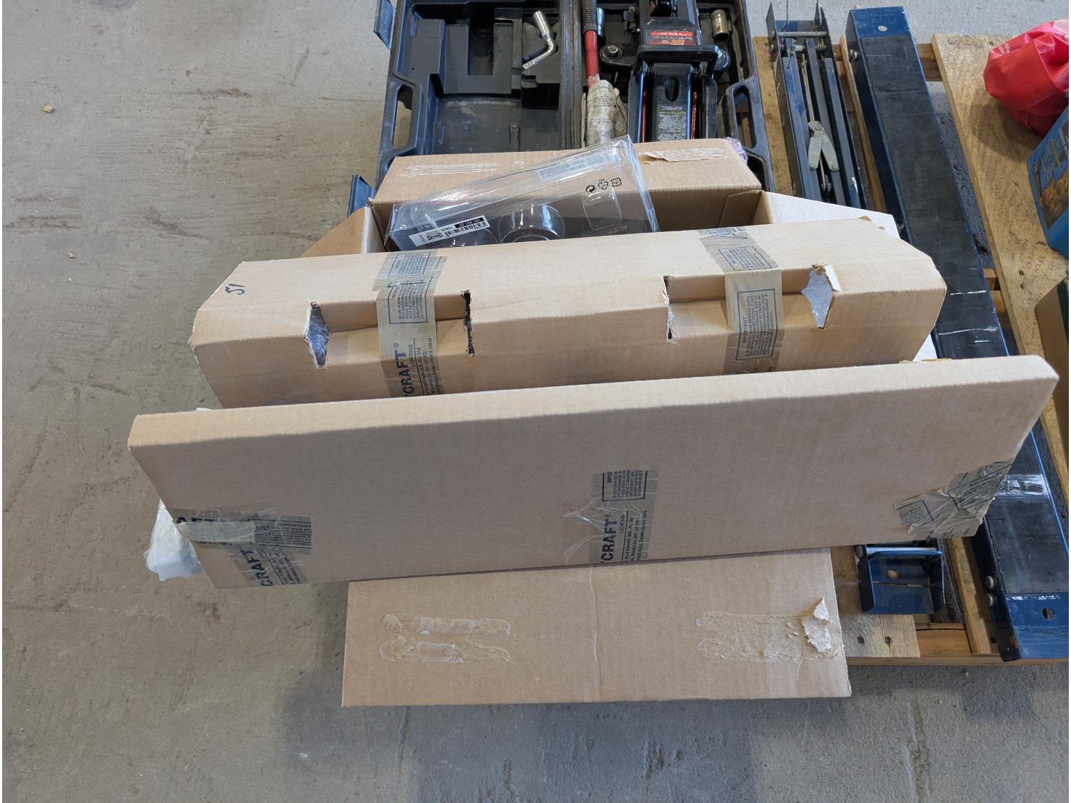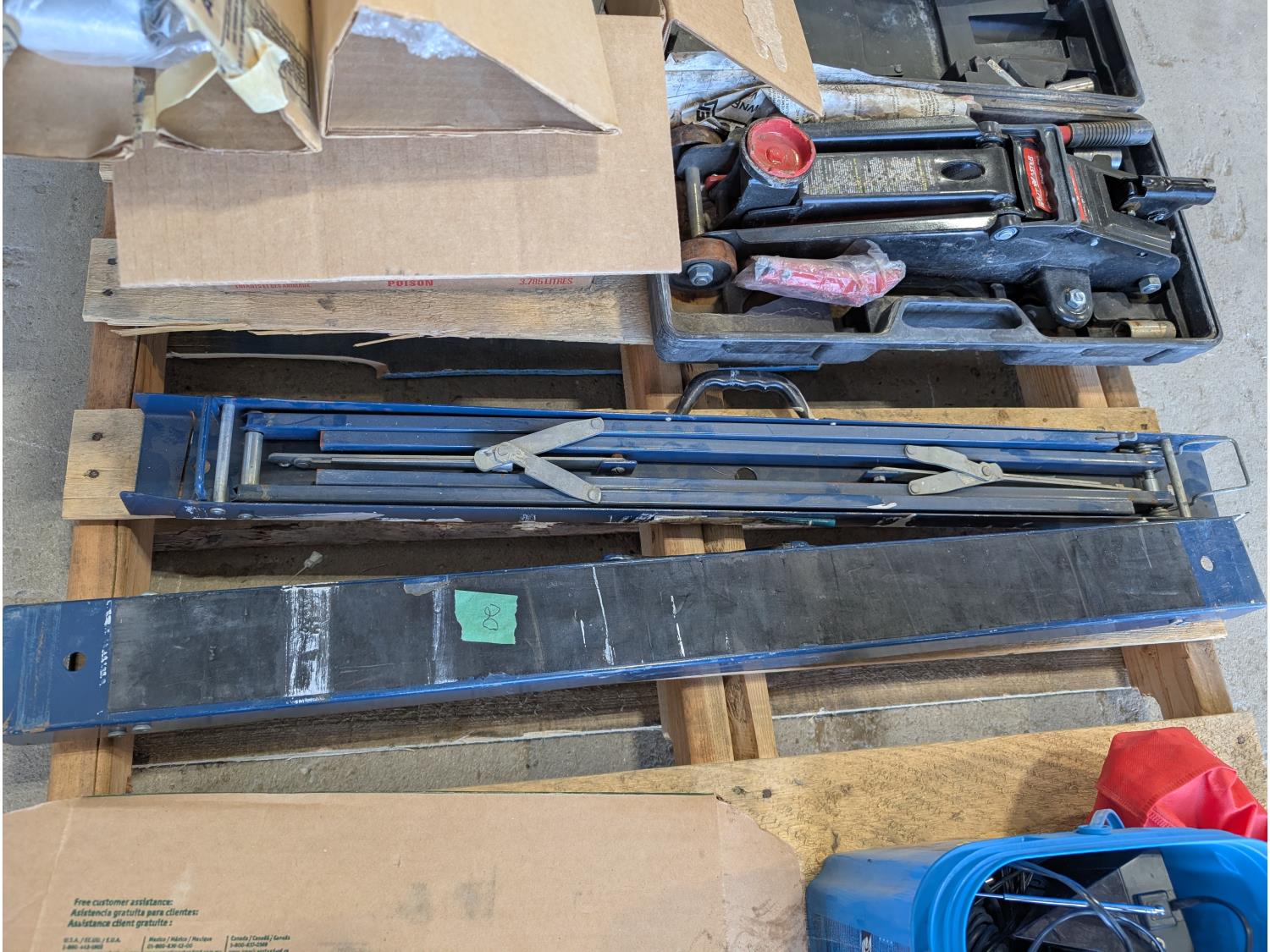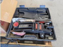 Faucet, (2) Mastercraft folding saw horses, Motomaster 2-1/4 ton hydraulic trolley jack, electrical supplies