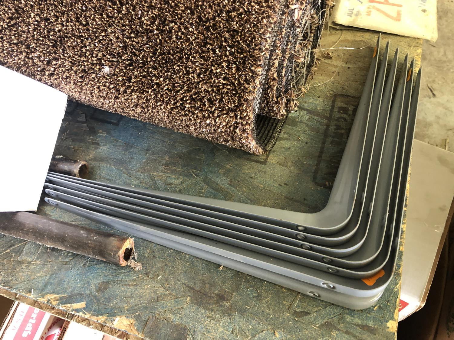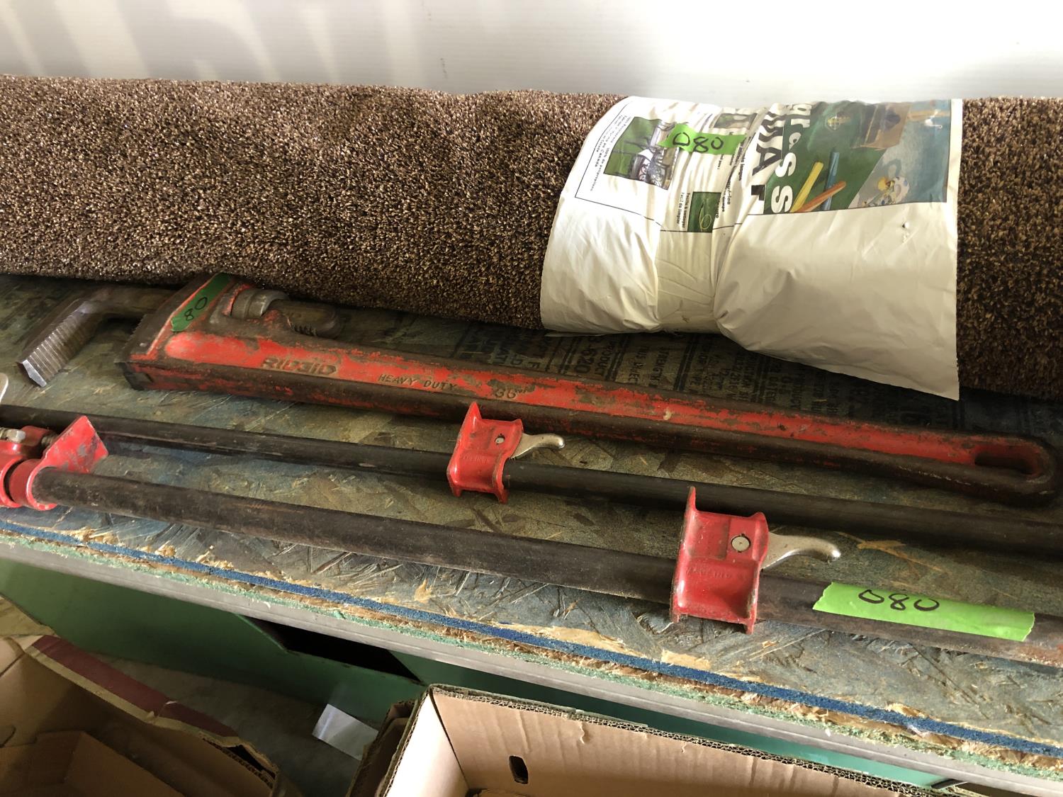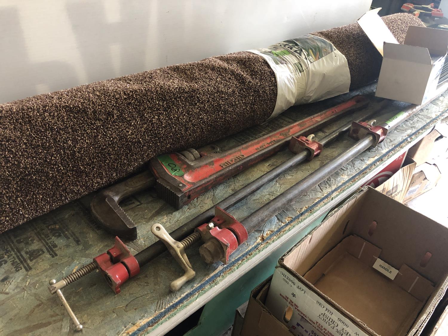 (2) pipe clamps, (6) shelf brackets, outdoor carpet, 36 inch pipe wrench