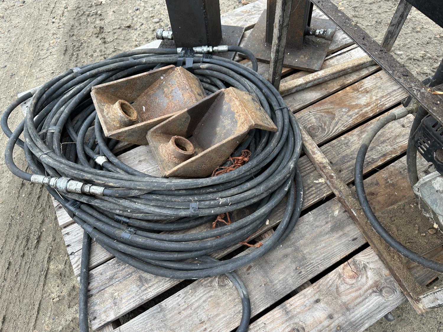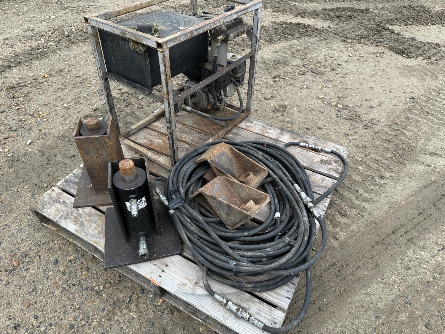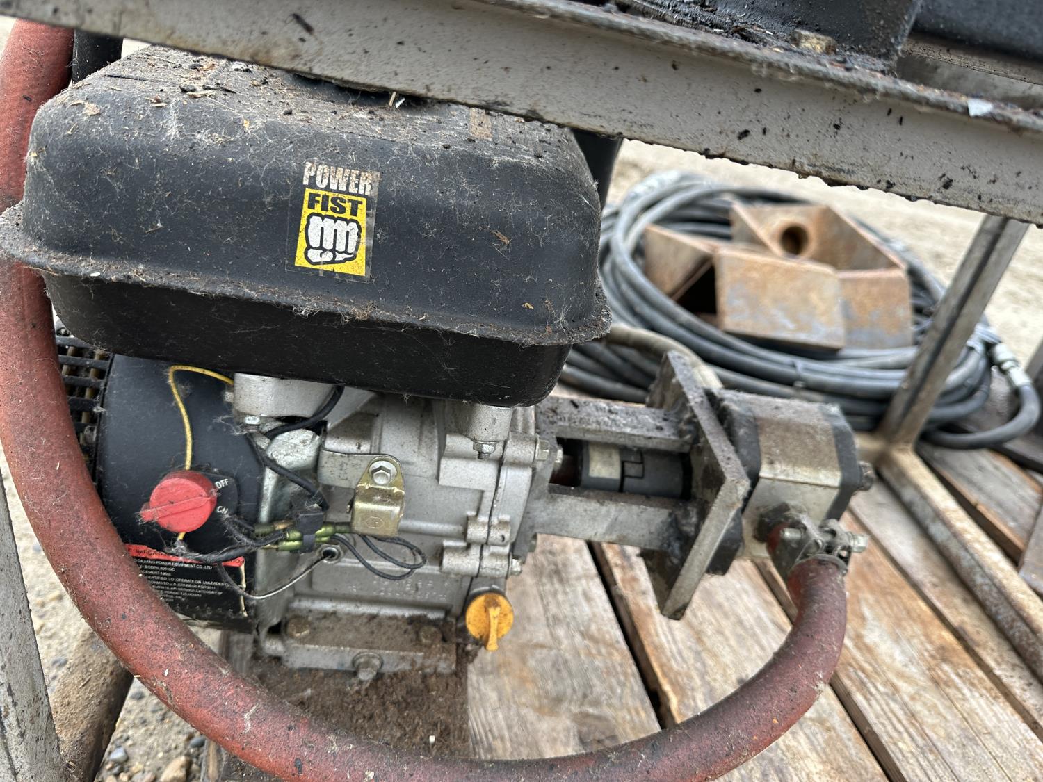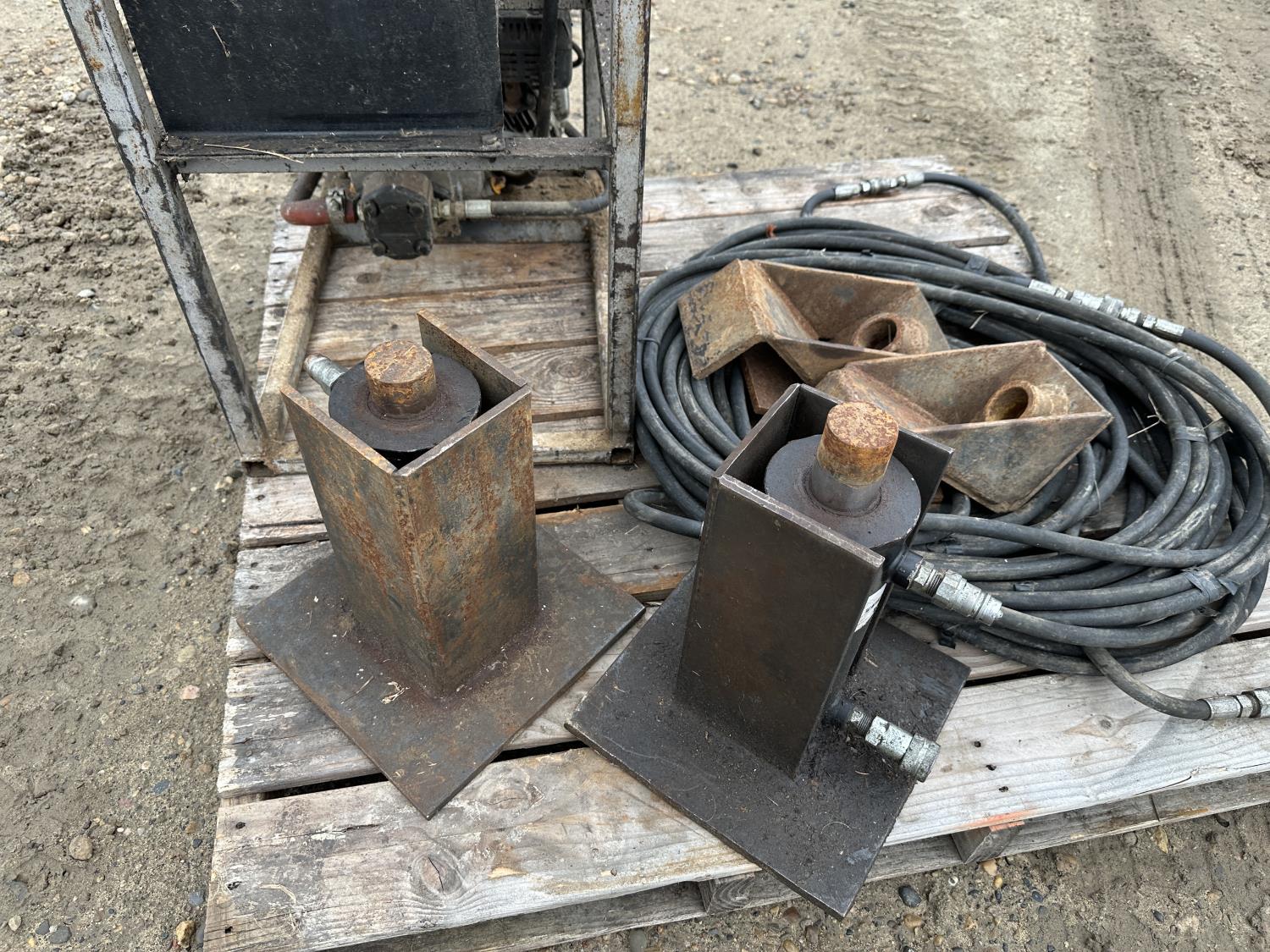 Powerfist 6.5 HP gas motor over hydraulic pump, (2) 50 ft hydraulic hoses with quick connectors, (2) hydraulic jacks in welded cages, (4) hydraulic jack top plates