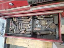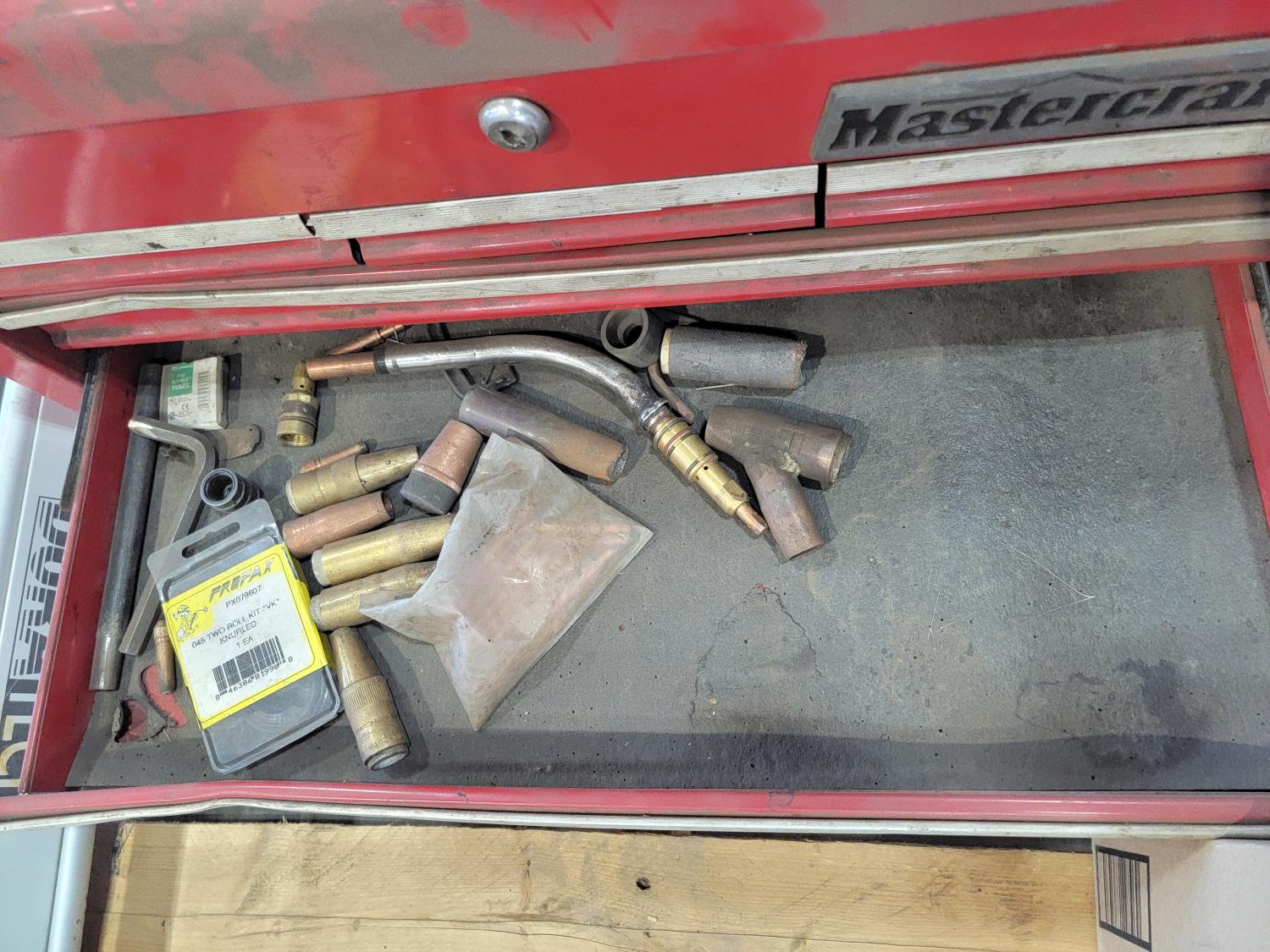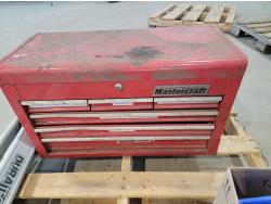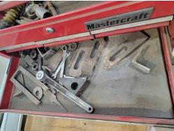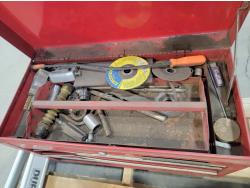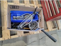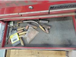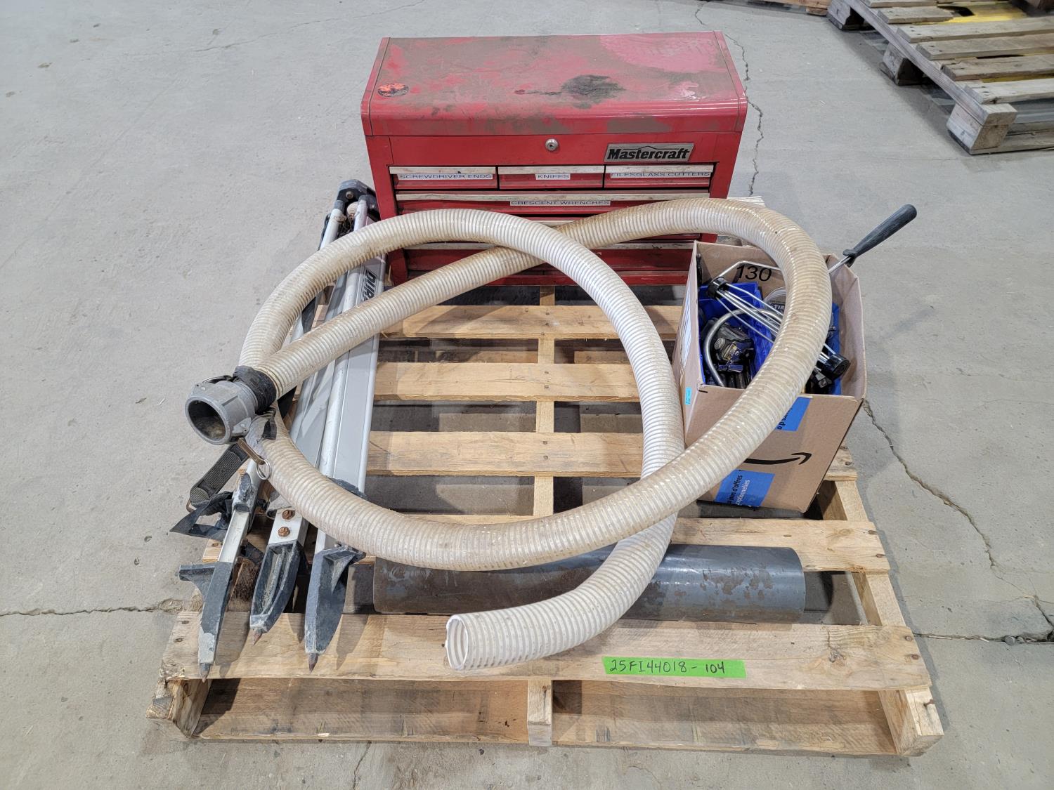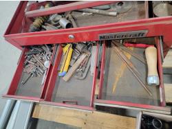 Mastercraft toolbox with contents, tripod, hand tools, hose with camlock