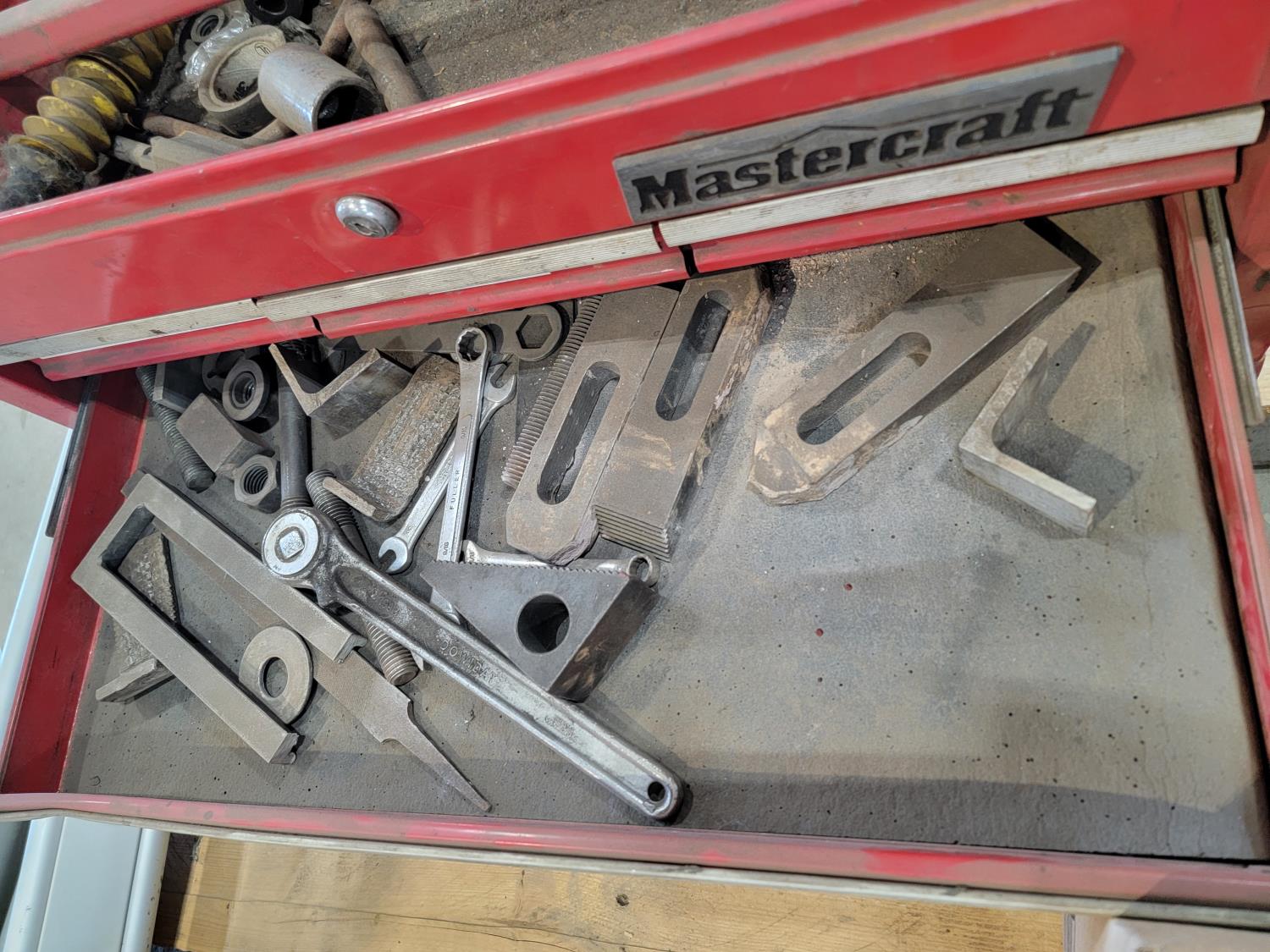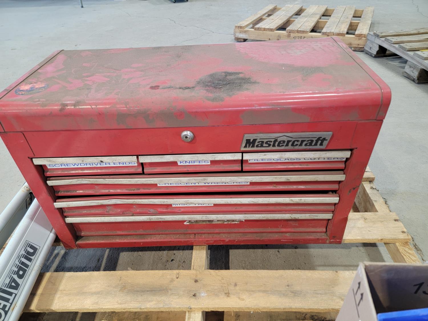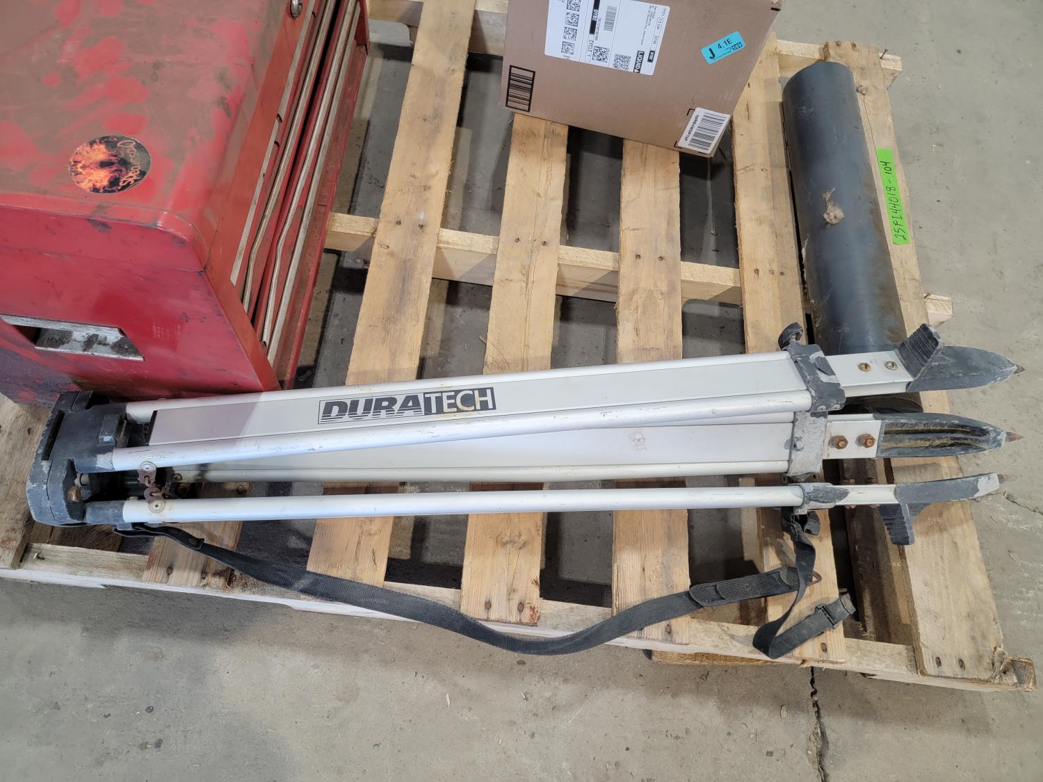 Mastercraft toolbox with contents, tripod, hand tools, hose with camlock