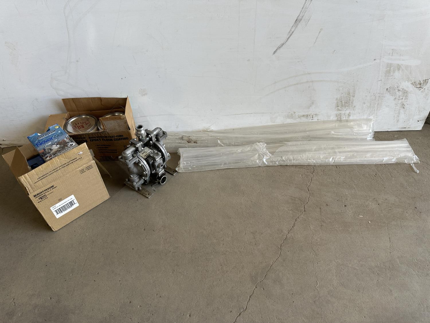 Shrink tubes, 1 inch pump, Rust-Oleum NeverWet kits, Rust-Oleum epoxy floor coating