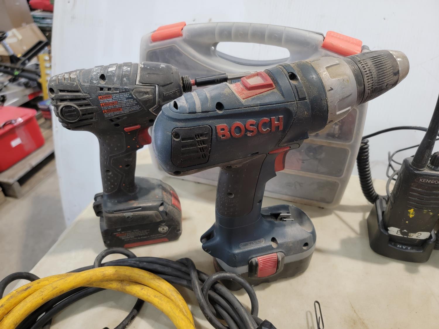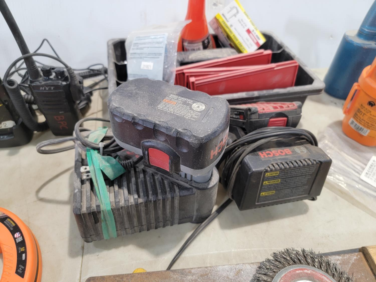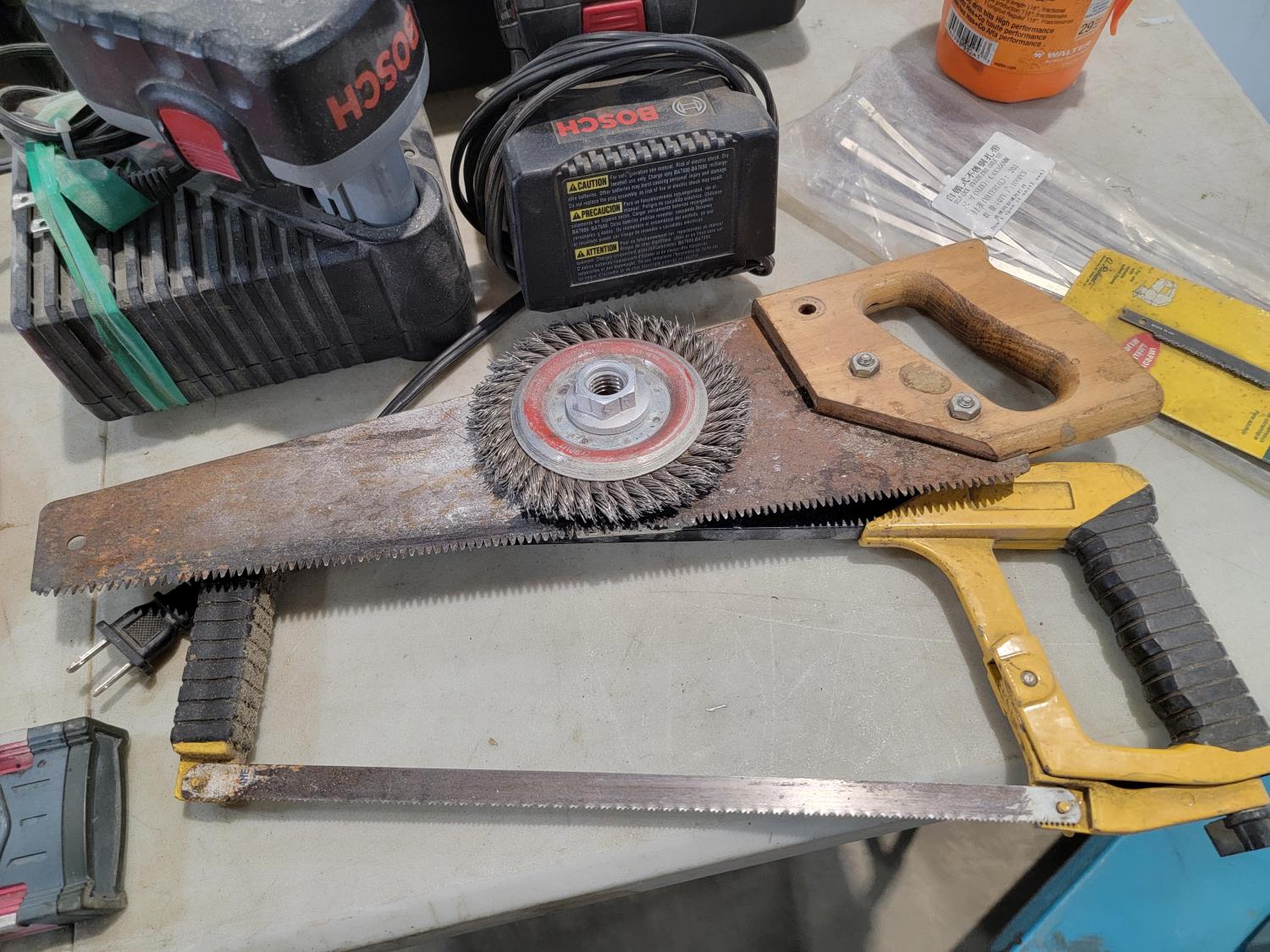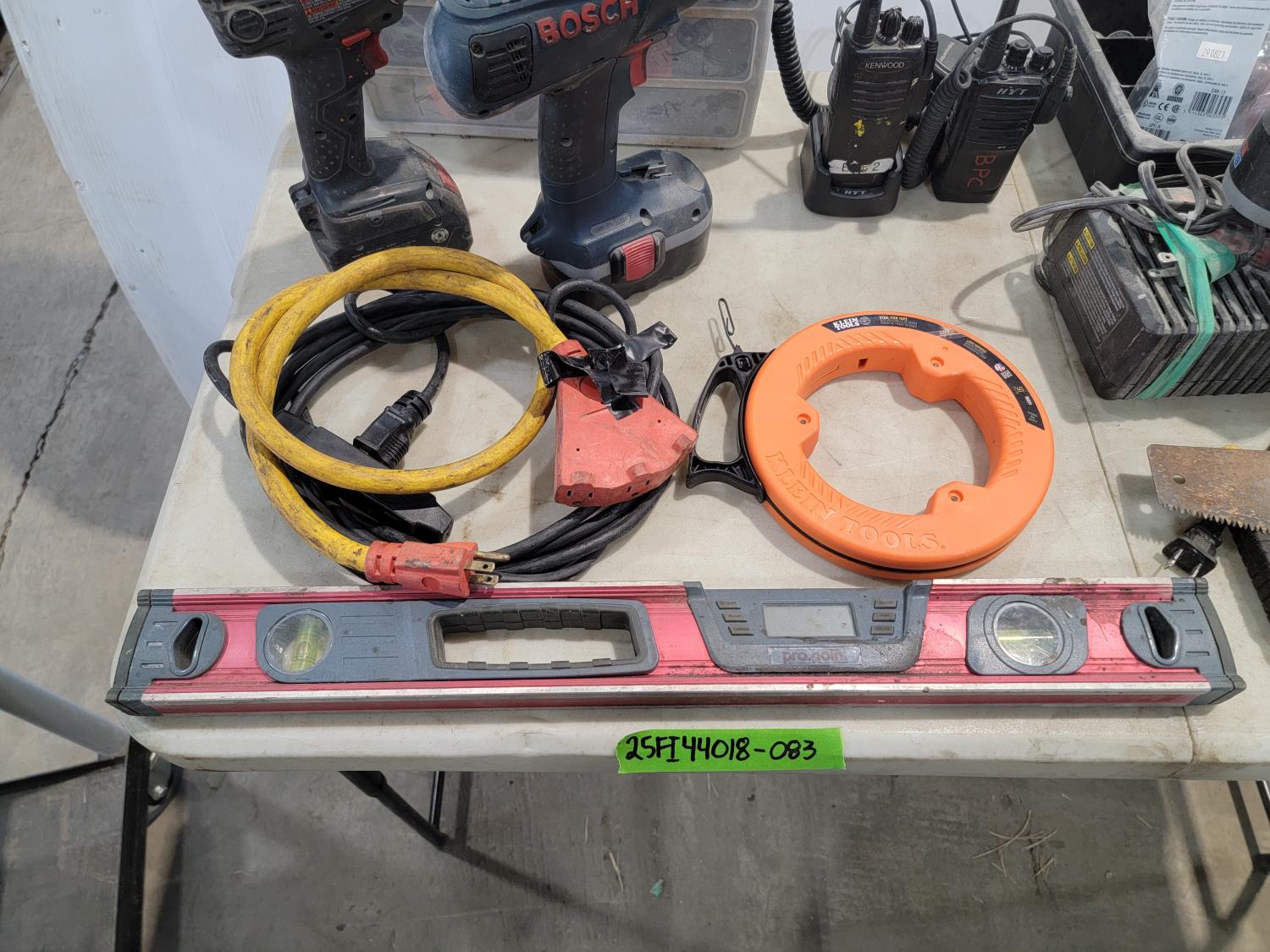 Cordless drill, fish tape, level, radios, hand saw, battery chargers, steel cable ties, drill bits