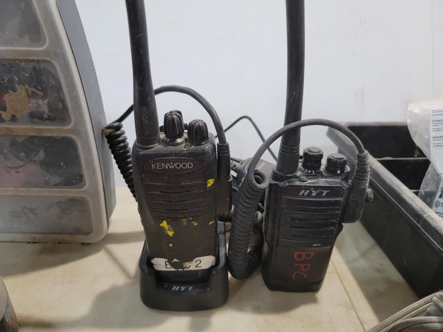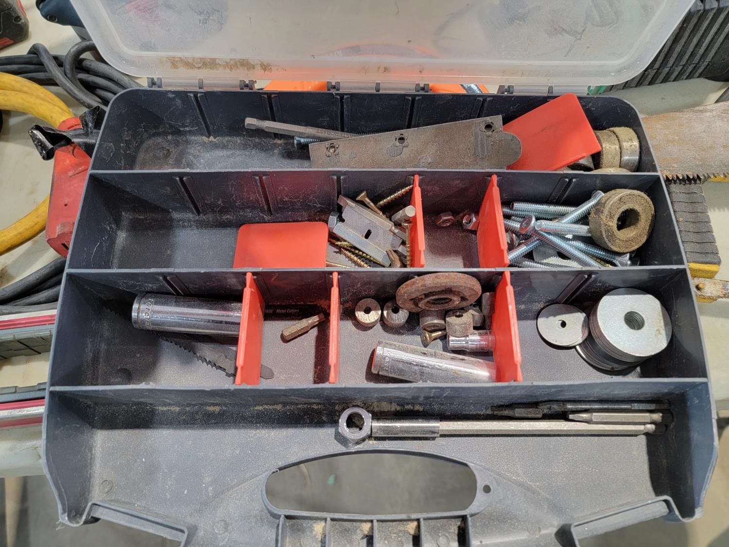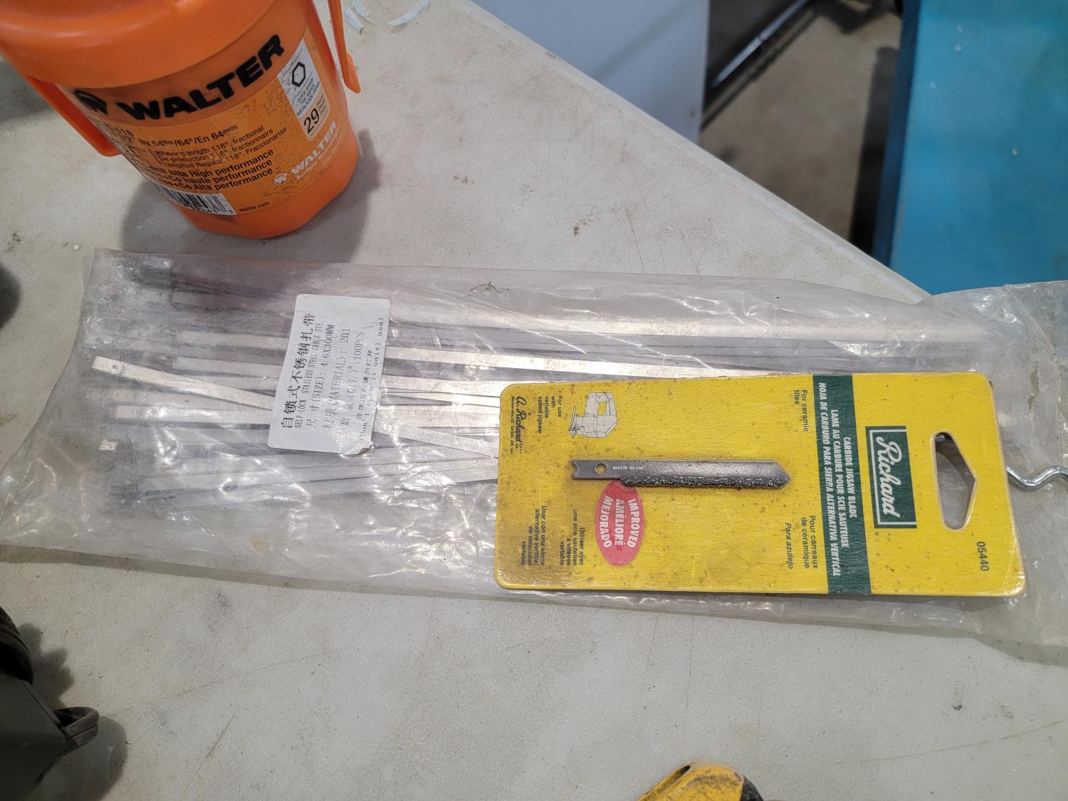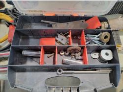 Cordless drill, fish tape, level, radios, hand saw, battery chargers, steel cable ties, drill bits