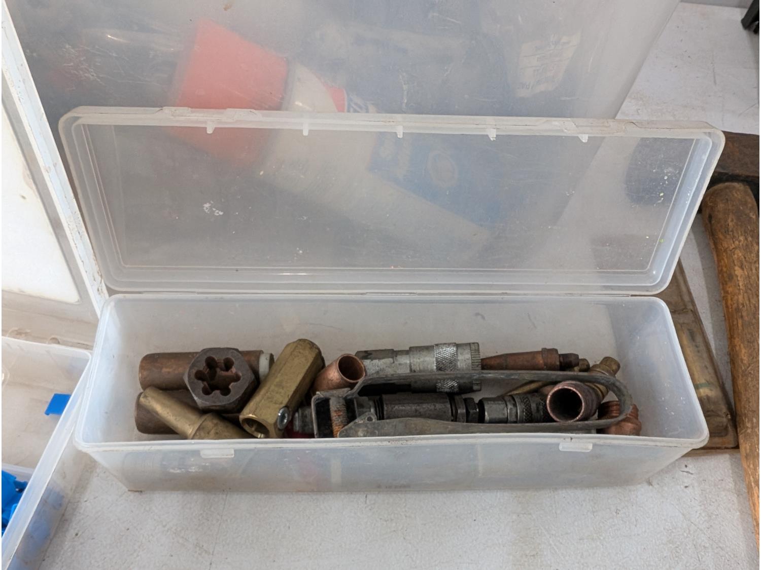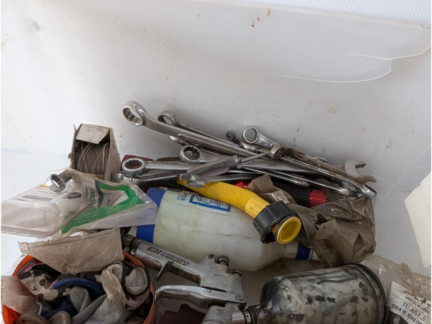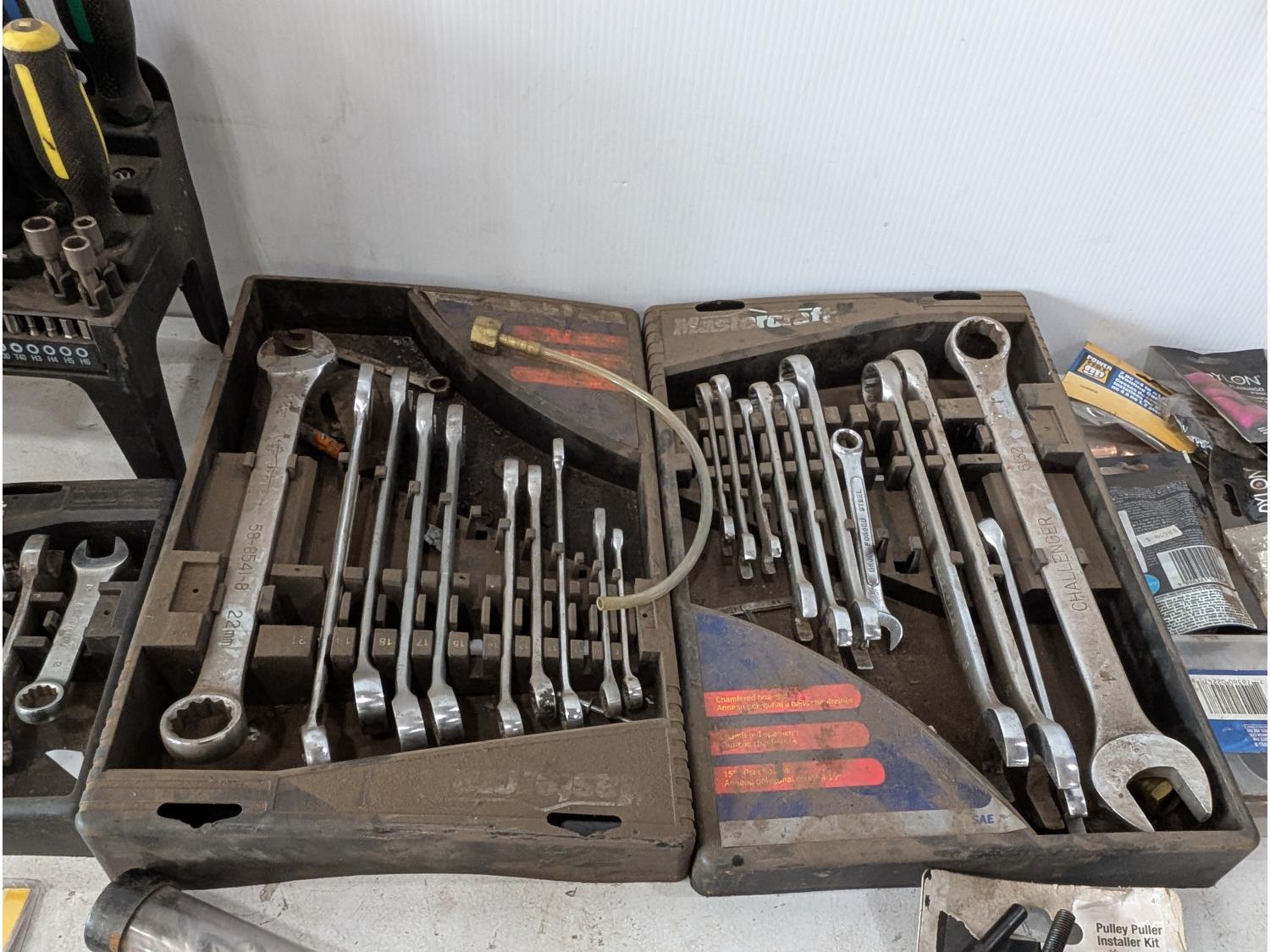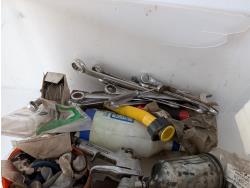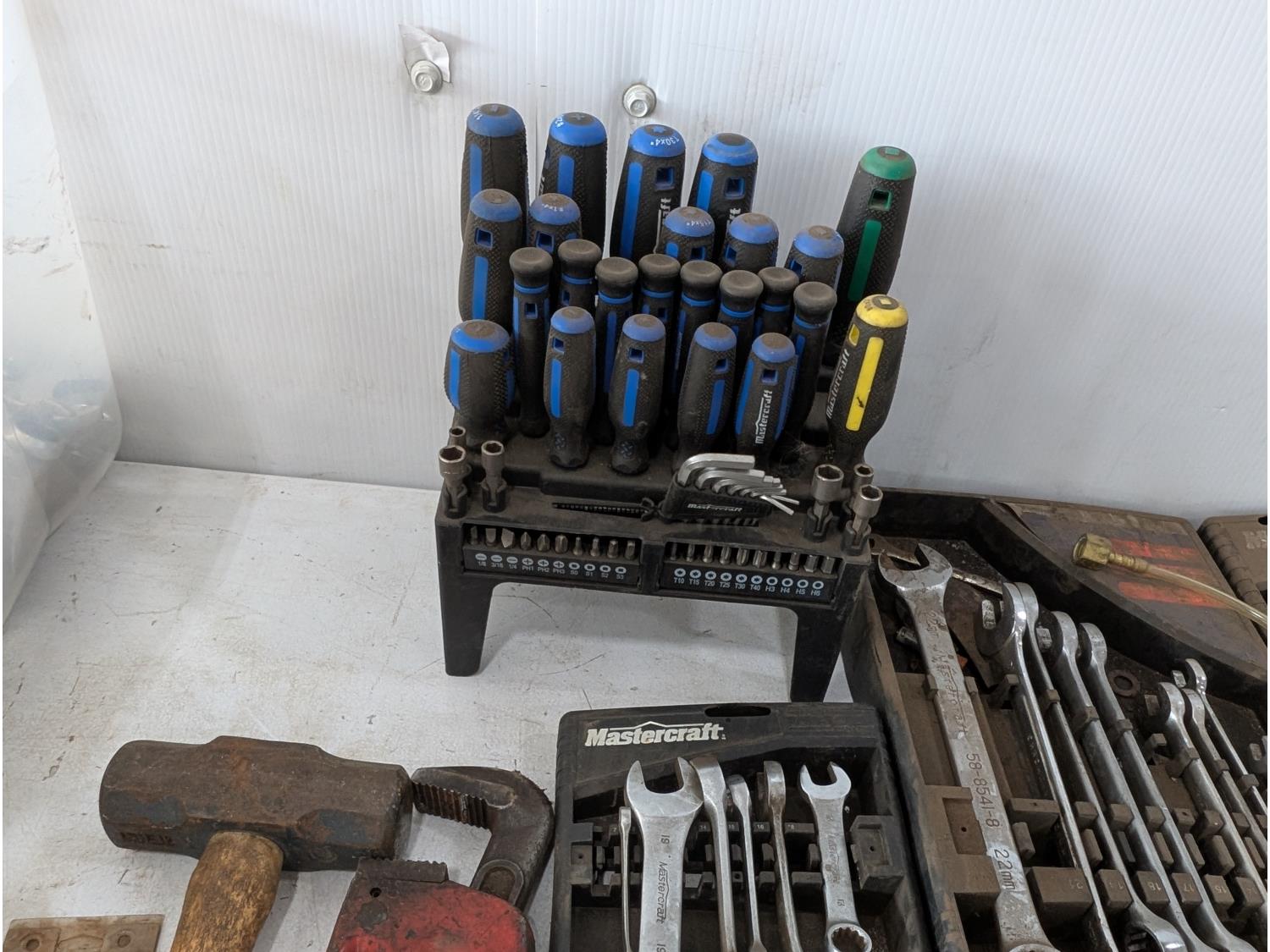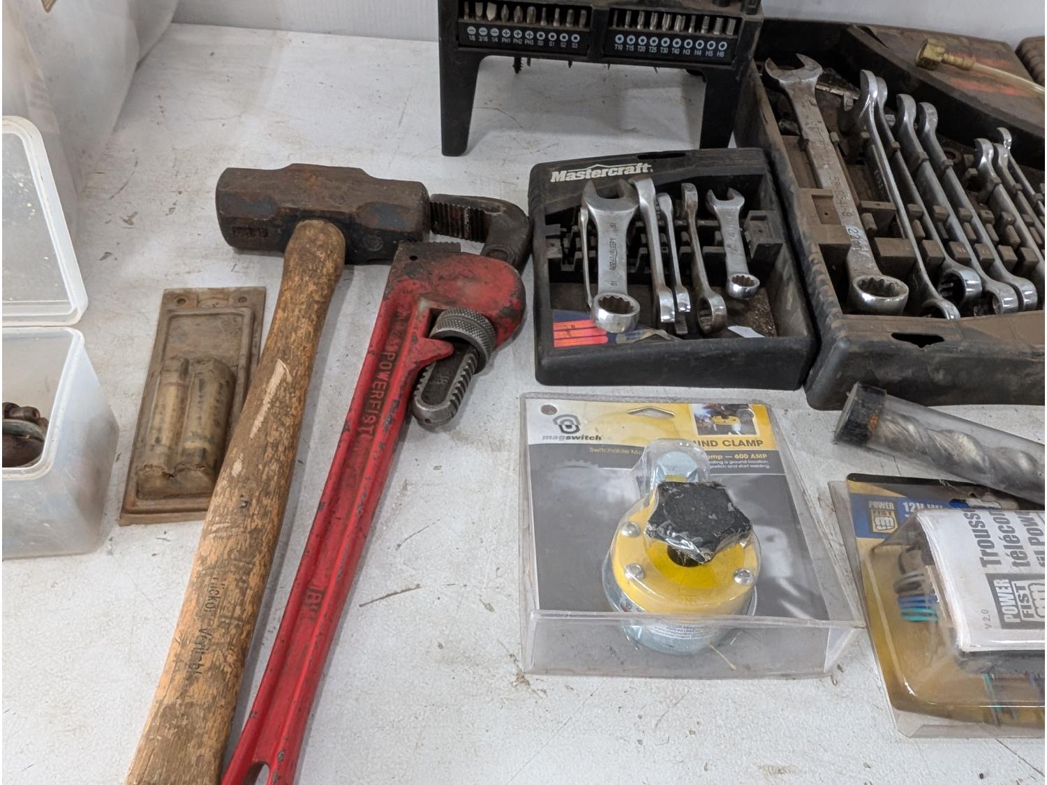 Screwdrivers, wrenches, levels, fabric dye, sledge hammer, 18 inch pipe wrench