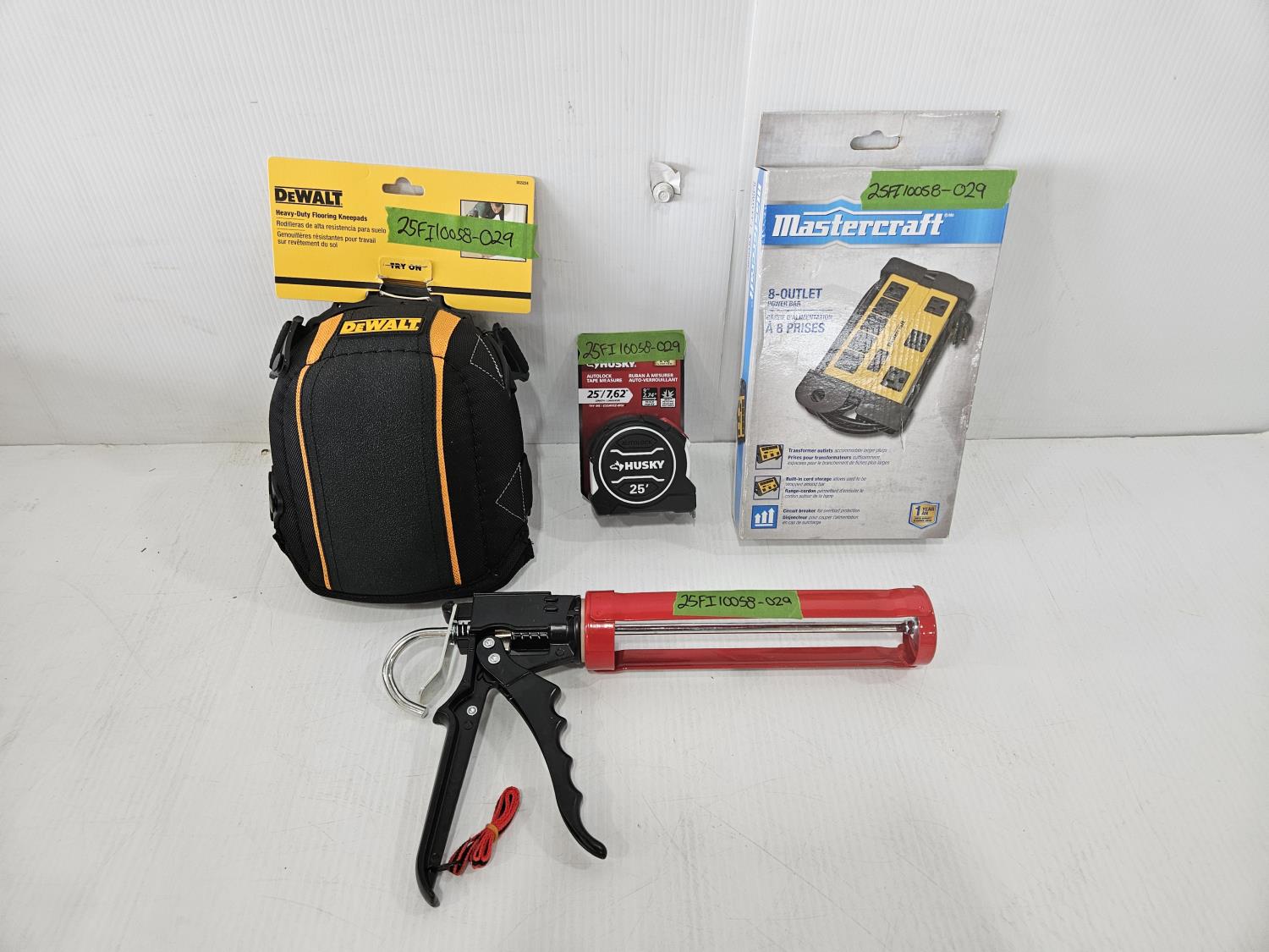 dewalt knee pads, husky 25 ft tape measure, benchmark 9 inch caulking gun, mastercraft power strip
