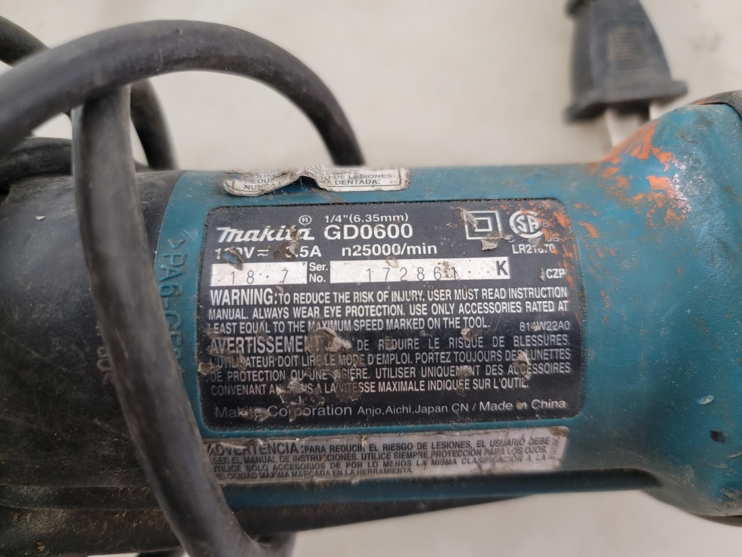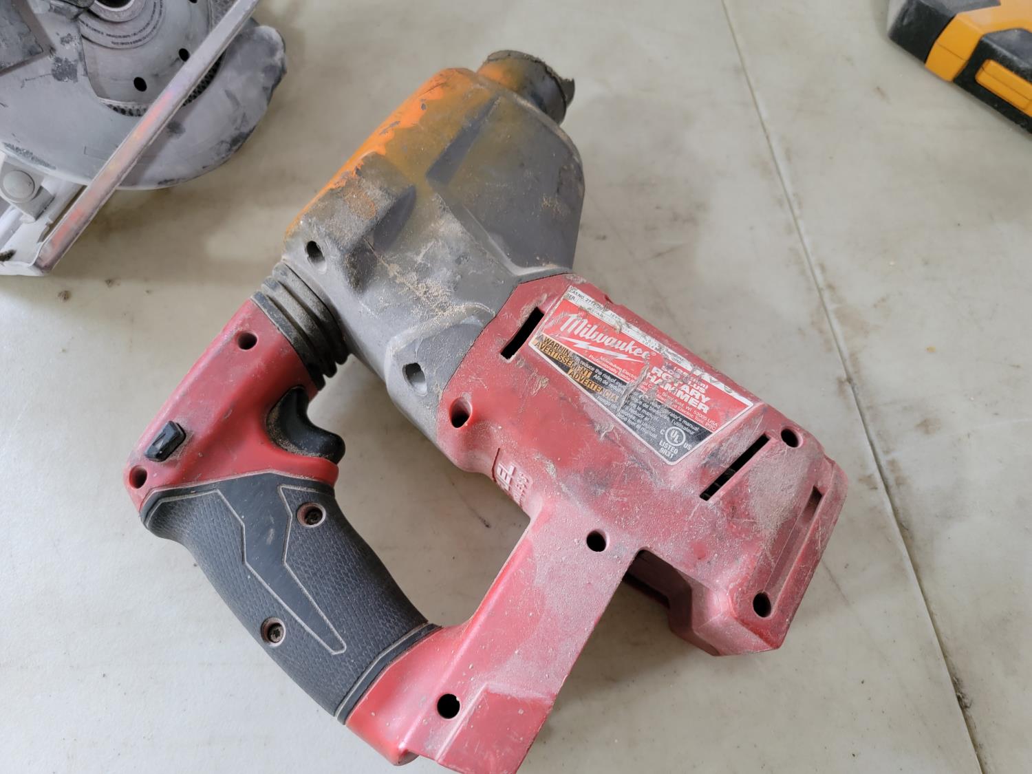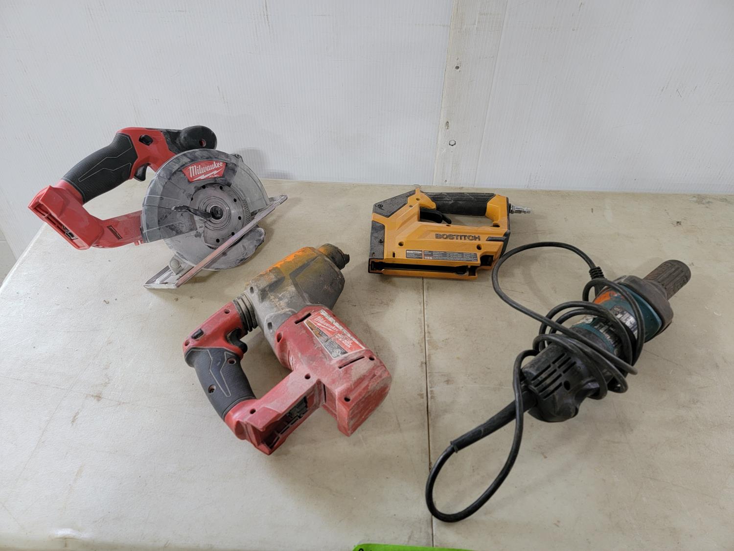 Milwaukee rotary hammer (inoperable), Bostitch air stapler, Makita 1/4 inch die grinder, Milwaukee 18V metal saw (no battery, no charger)