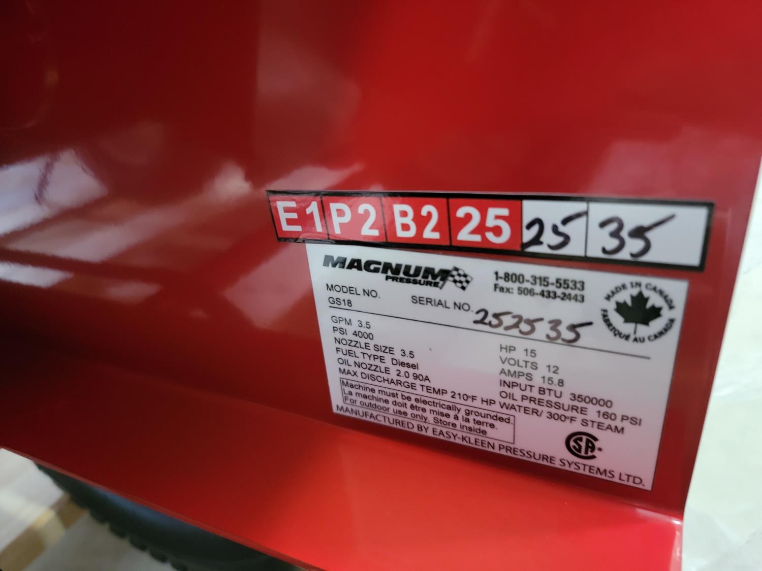 3.5 GPM at 4000 PSI, 15 HP, gasoline engine, electric start, 12 volt burner, oil/diesel fired burned/thermostat, schedule 80 coil with stainless steel housing, fully welded, powder coated frame, 10 gallon poly fuel tank, 30' hose and wand