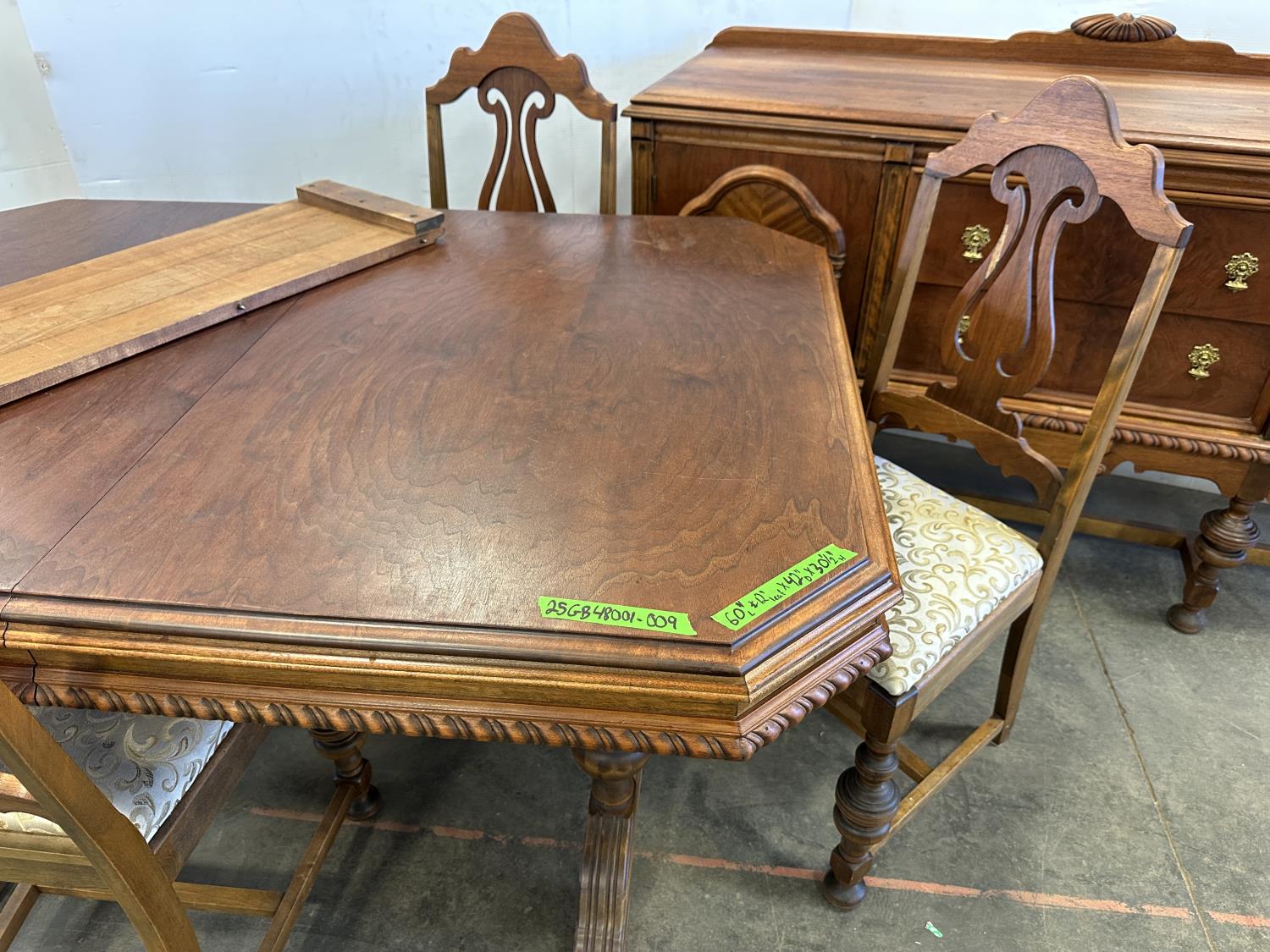 Table 60 inch w x 42 inch d x 30-1/2 inch h, leaf 12 inch, sideboard 66 inch w x 21 inch d x 37 inch h