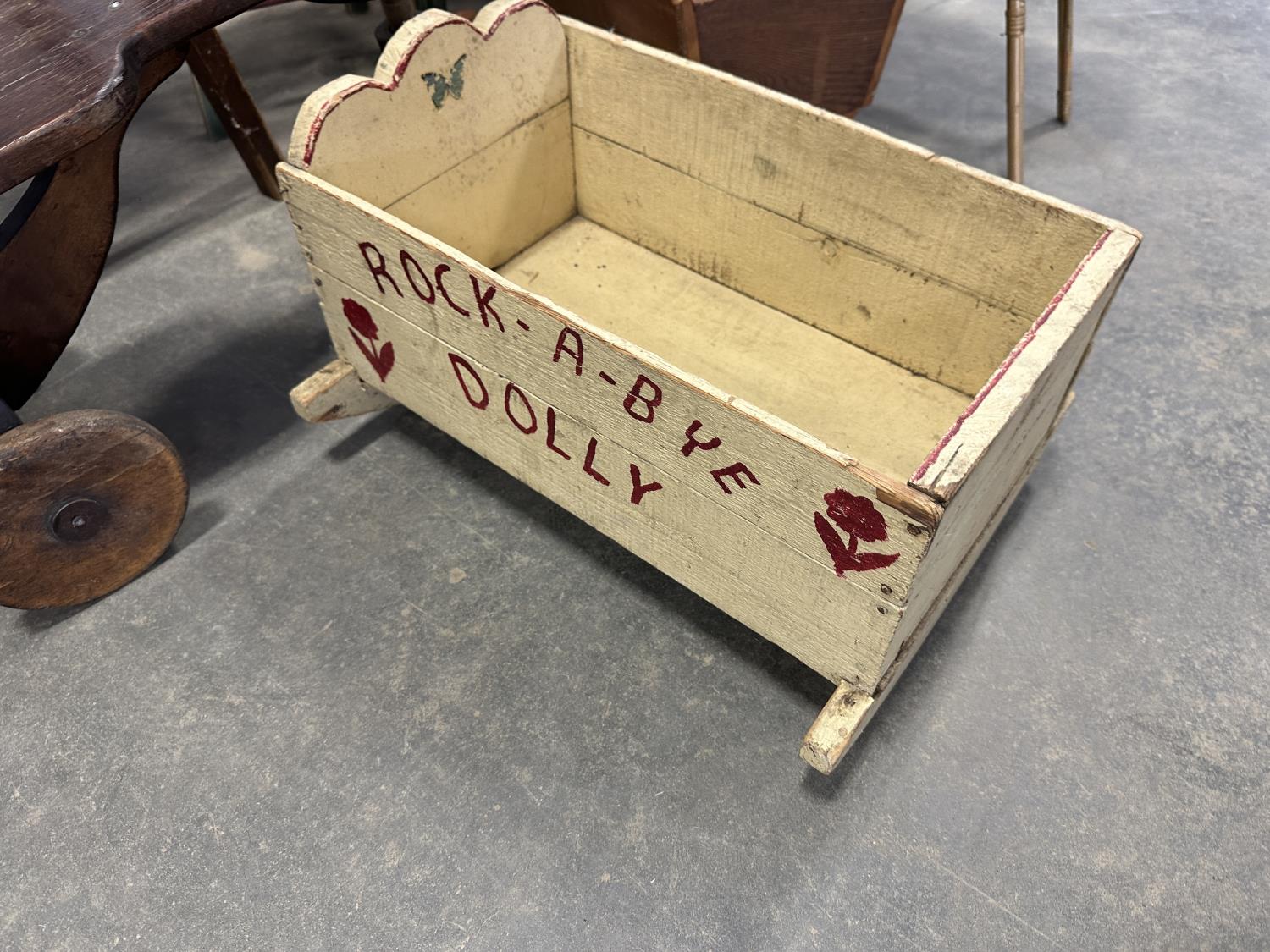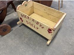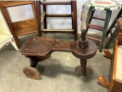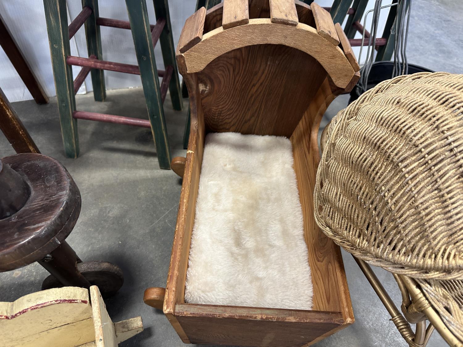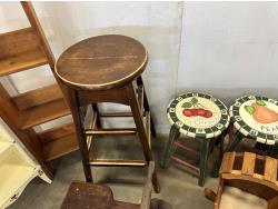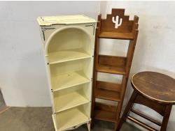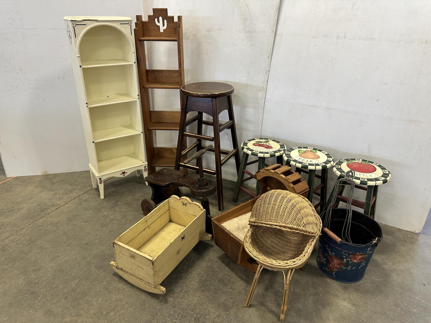 (2) 4 tier shelves, (4) stools, (3) doll cradles, antique wooden trike, painted pail, (5) metal sock forms