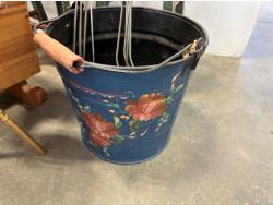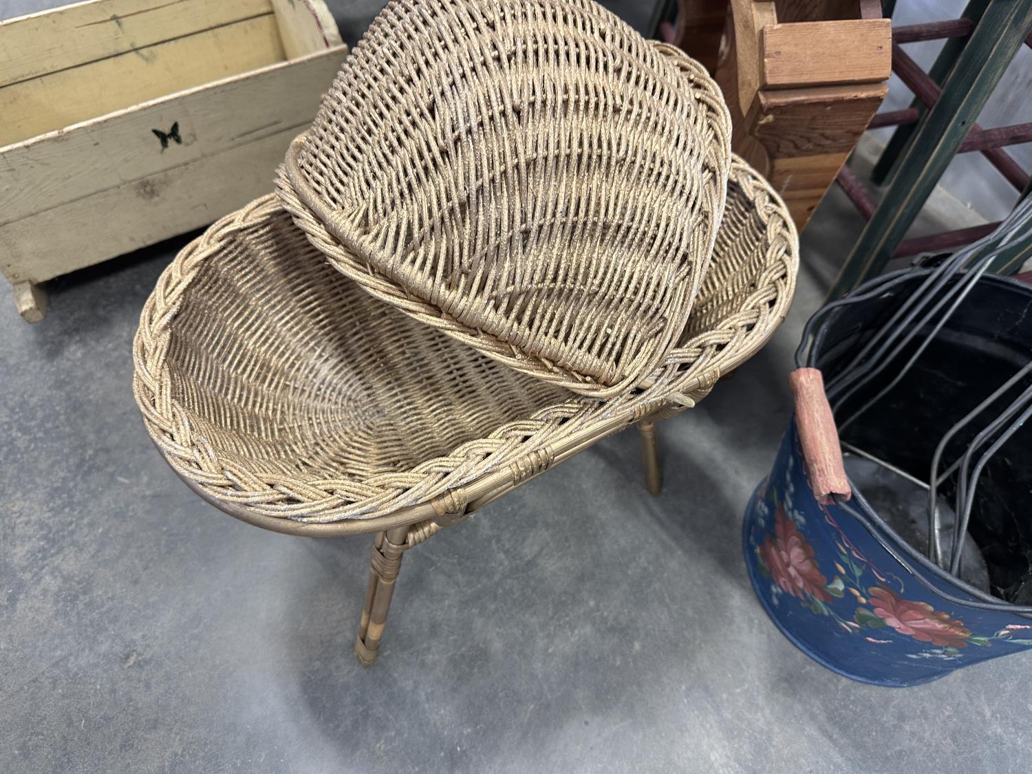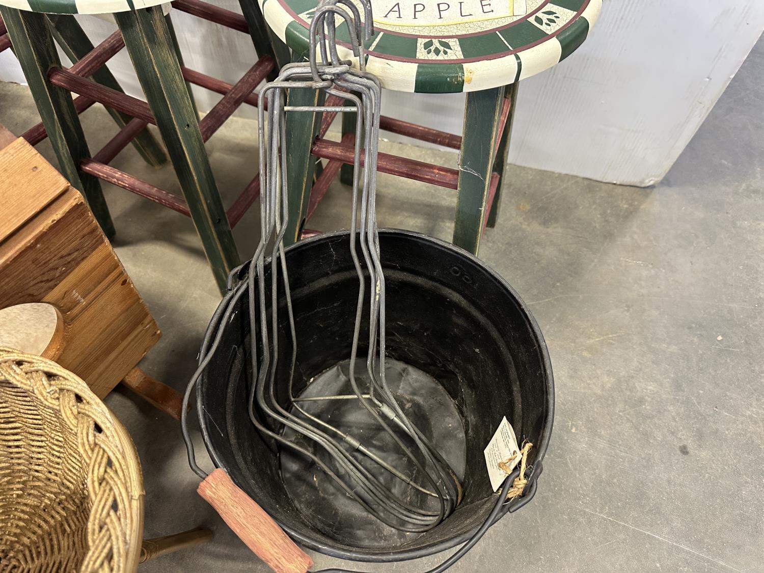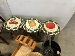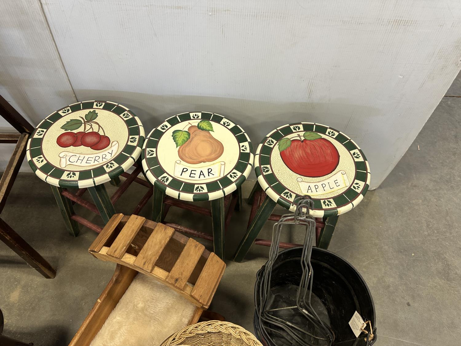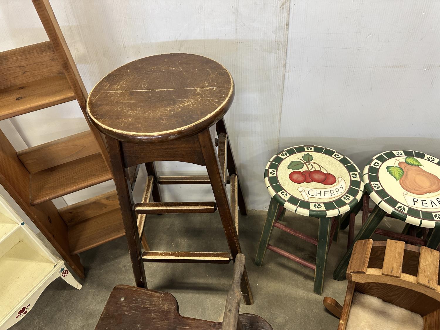 (2) 4 tier shelves, (4) stools, (3) doll cradles, antique wooden trike, painted pail, (5) metal sock forms