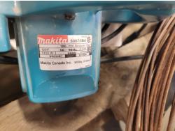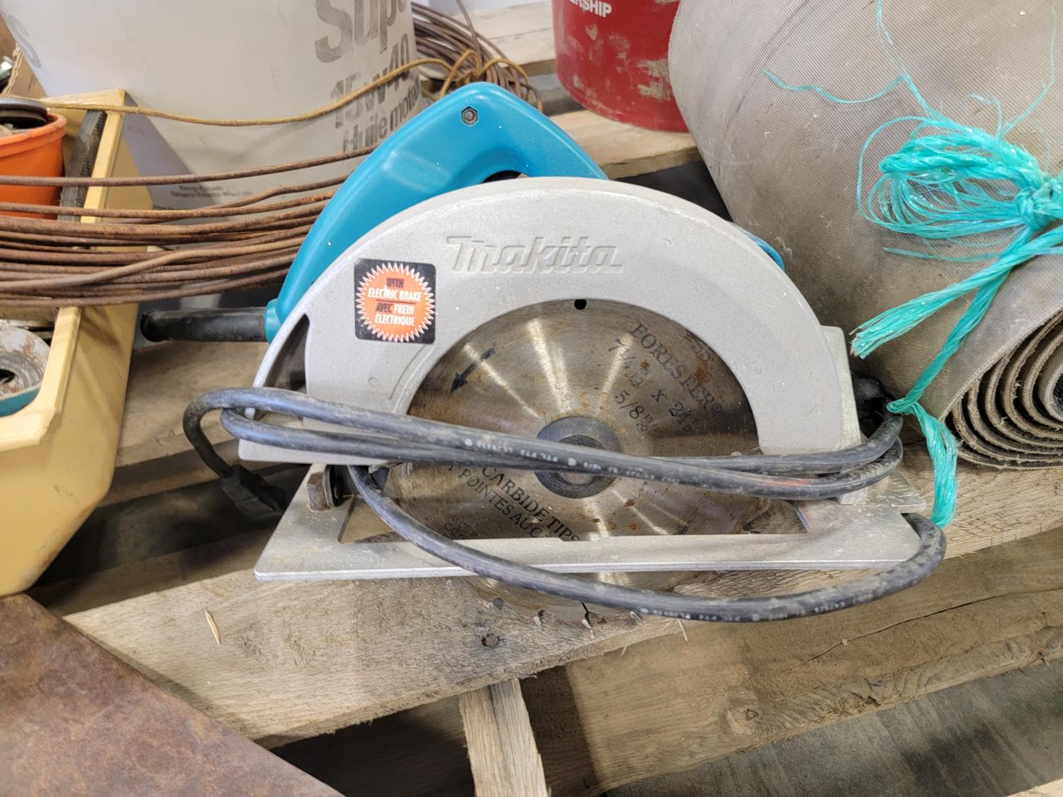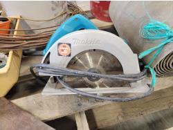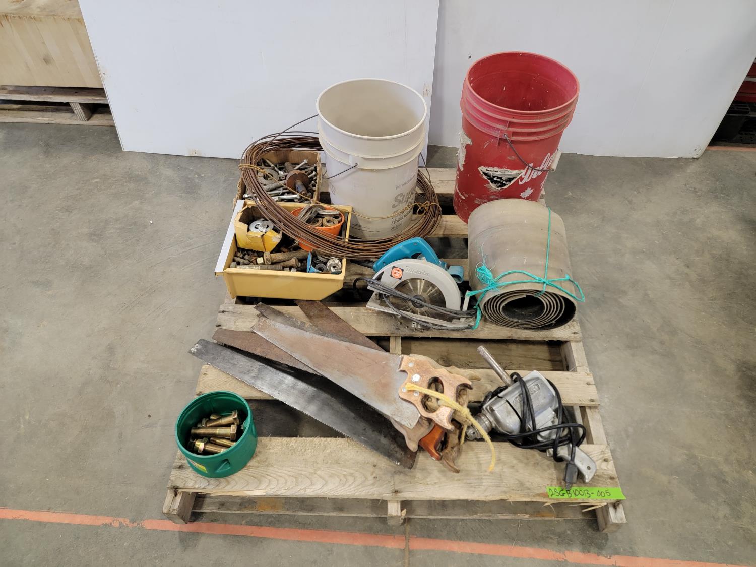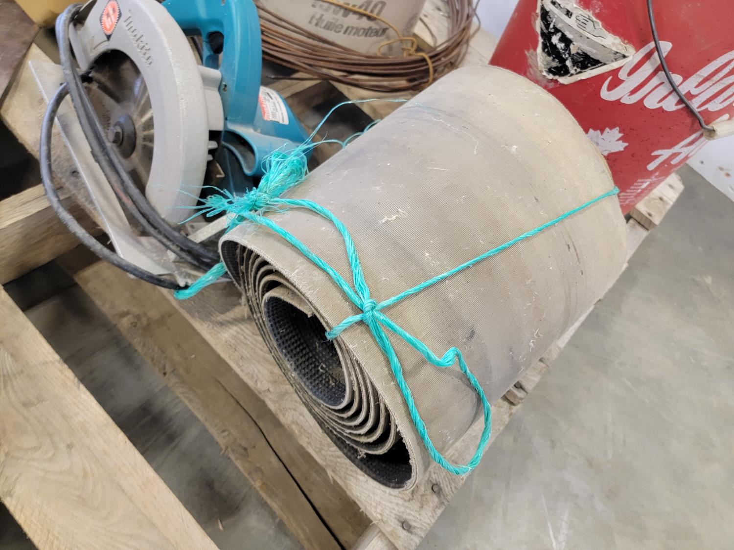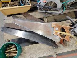 Various hardware, 7-1/4 inch Makita circular saw, (6) hand saws, #9 gauge hay wire, 3/4 inch Craftsman drill, (7) scale bolts for logging trailer, 12 inch x 12 ft belting