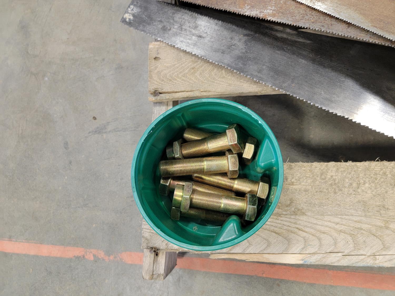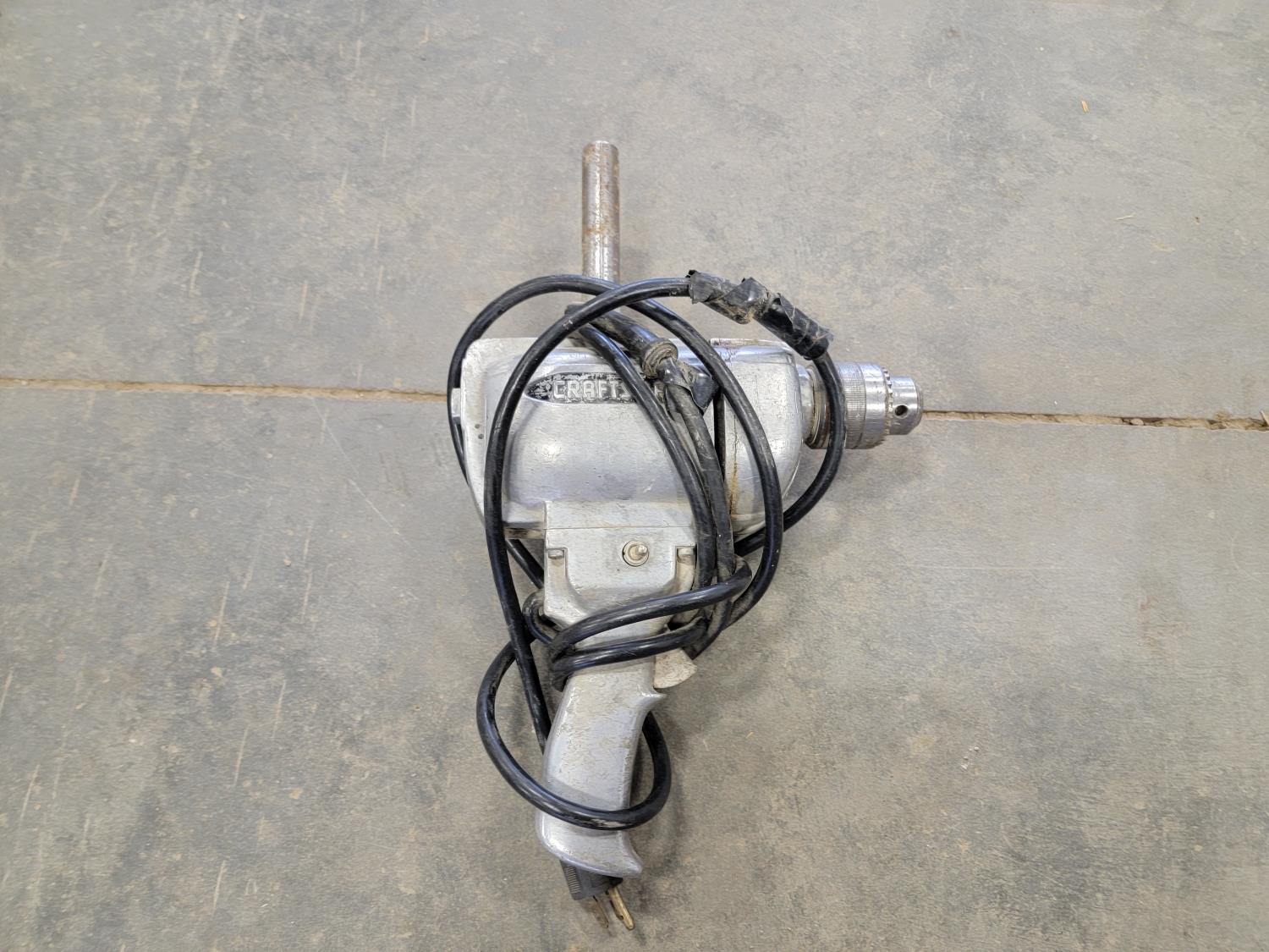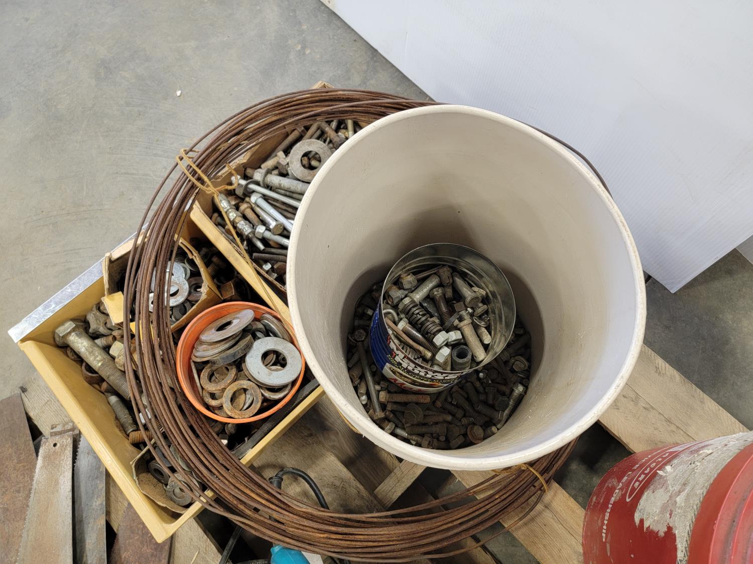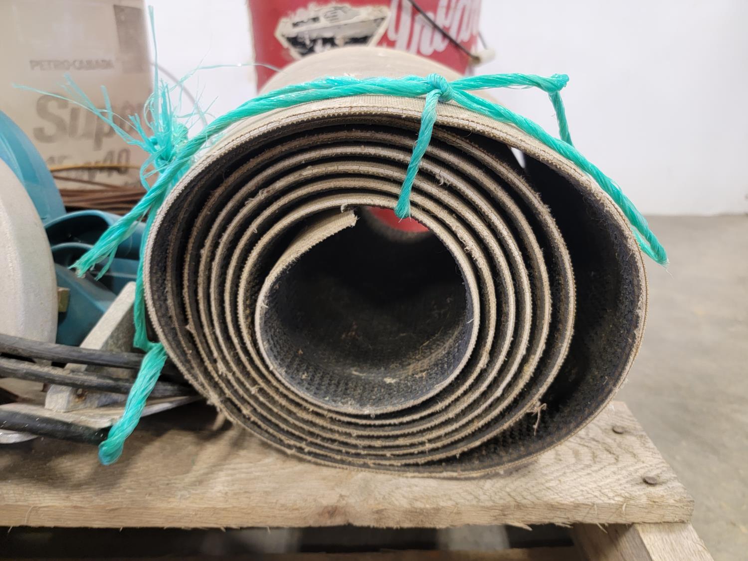 Various hardware, 7-1/4 inch Makita circular saw, (6) hand saws, #9 gauge hay wire, 3/4 inch Craftsman drill, (7) scale bolts for logging trailer, 12 inch x 12 ft belting