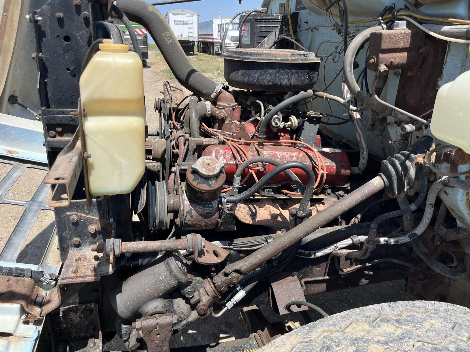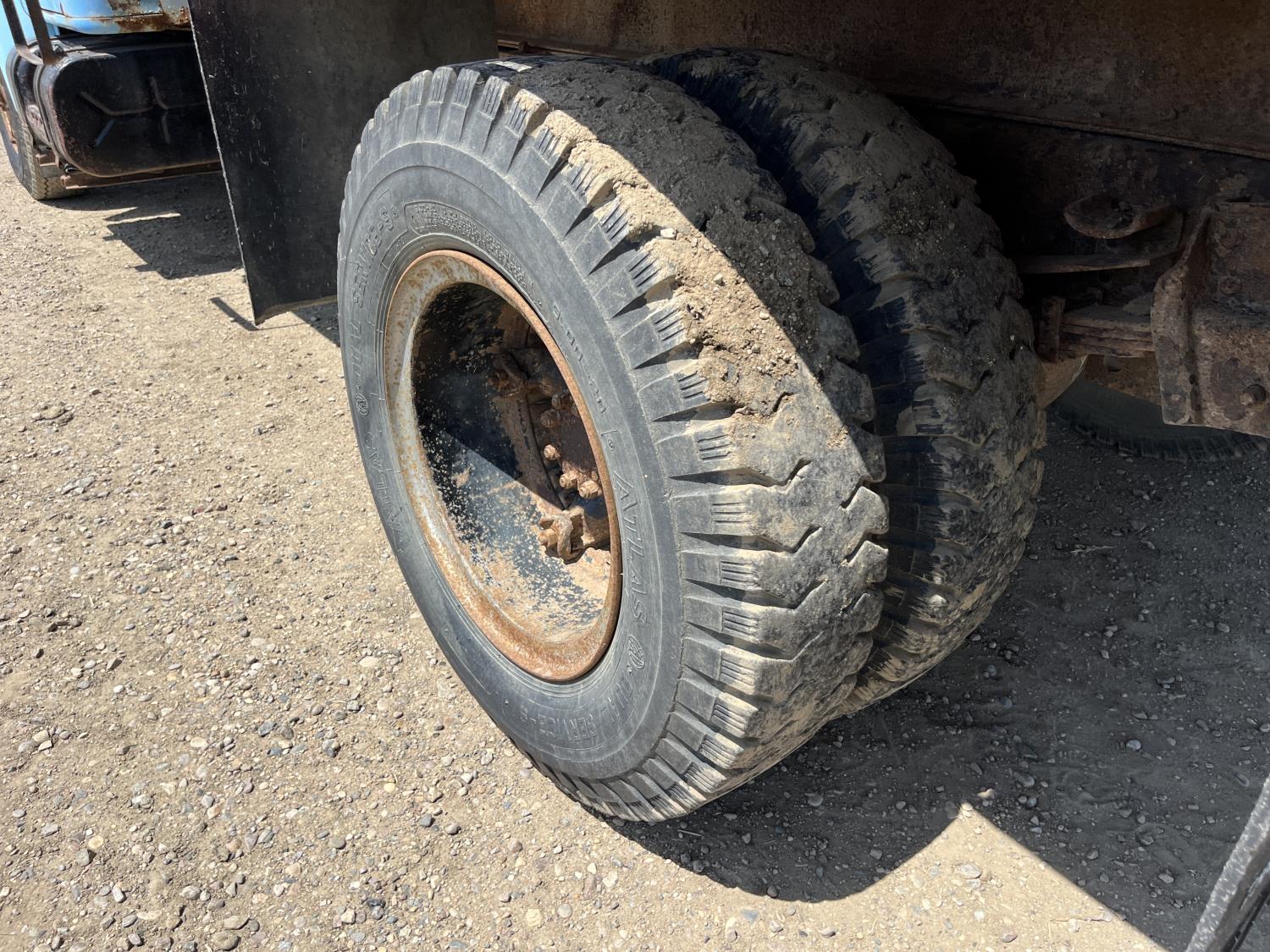 V8 gas engine, electric engine block heater, 5 X 2 manual transmission, 8 ft x 15 ft deck, spring suspension, 8.00-20 tires
