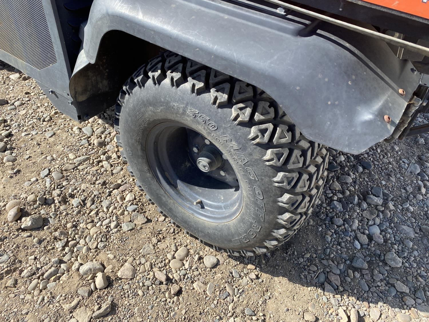 1123 cc water cooled diesel engine, CVT transmission, Hi/Lo range, reverse, 2 door enclosed cab, 2 passengers, A/C, heater, windshield, front winch, hydraulic dump box, receiver hitch, independent suspension, 25X10.00-12 tires
