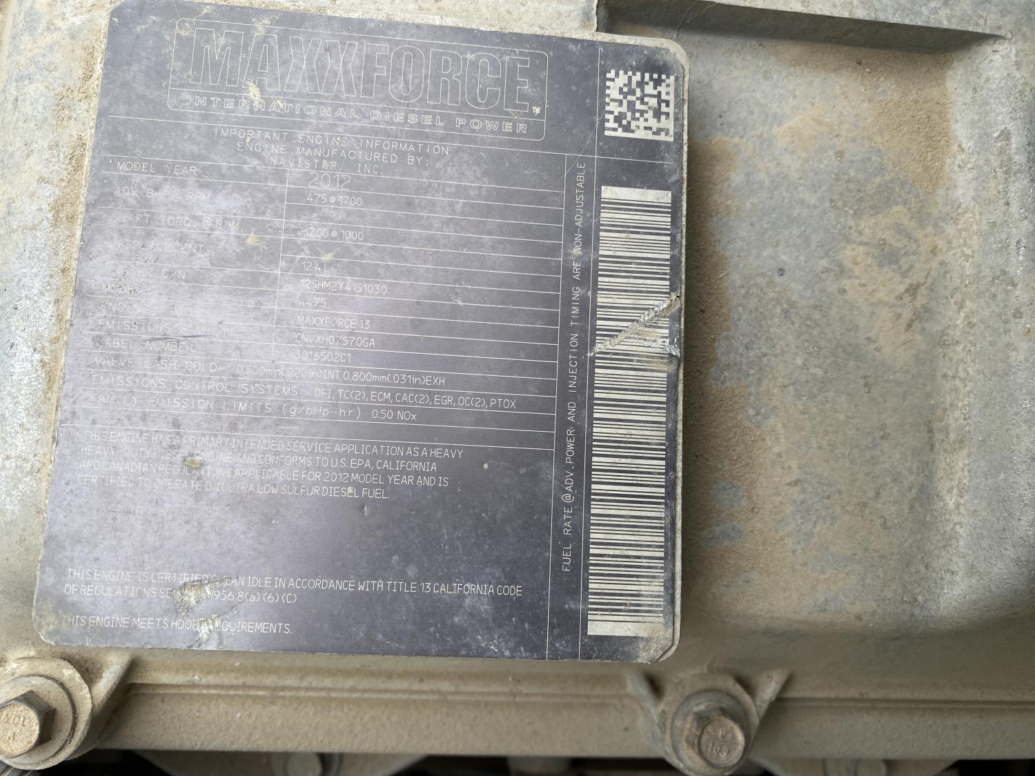 MaxForce A475 12.4 L 6 cylinder 475 HP engine, engine brake, engine block heater, Eaton Fuller 18 speed manual transmission, A/C, cruise control, air ride driver seat, air ride cab, air ride suspension, 13,200 lb front axle, 40,000 lb rear axles, full lockers, 205 inch WB, all aluminum wheels, 11R24.5 tires